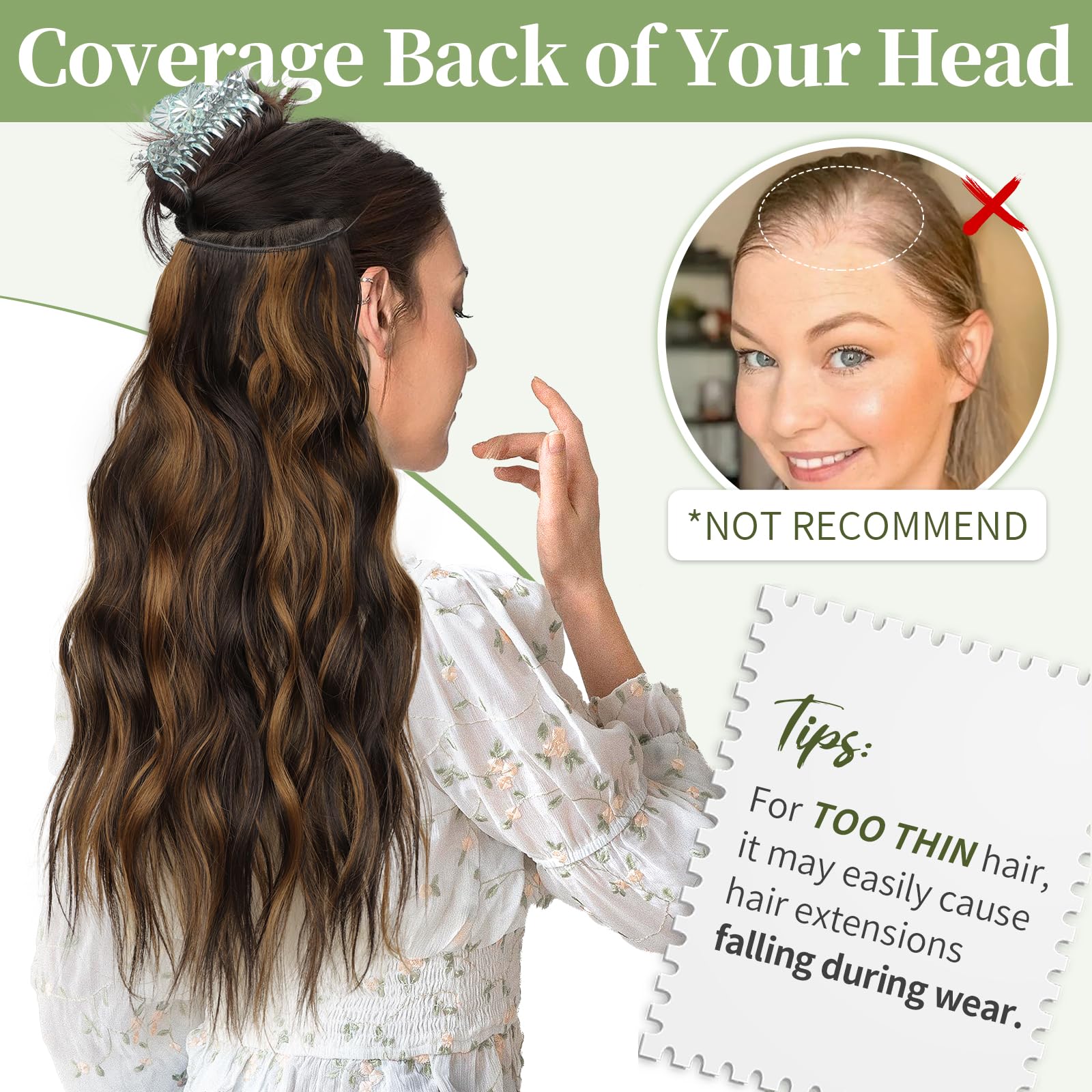 Different ways of wearing: 1. Position the wire hair extensions on your head like a hairdband, secure them with 4 clips, and hide the wires with your own hair.2. Only use invisible wires, suitable for easy hair loss and sensitive to bobby pins customers. 3. Only use 4 hair clips, suitable for customers with soft and sparse hair on the top of the head.It can meet various wearing situations.
