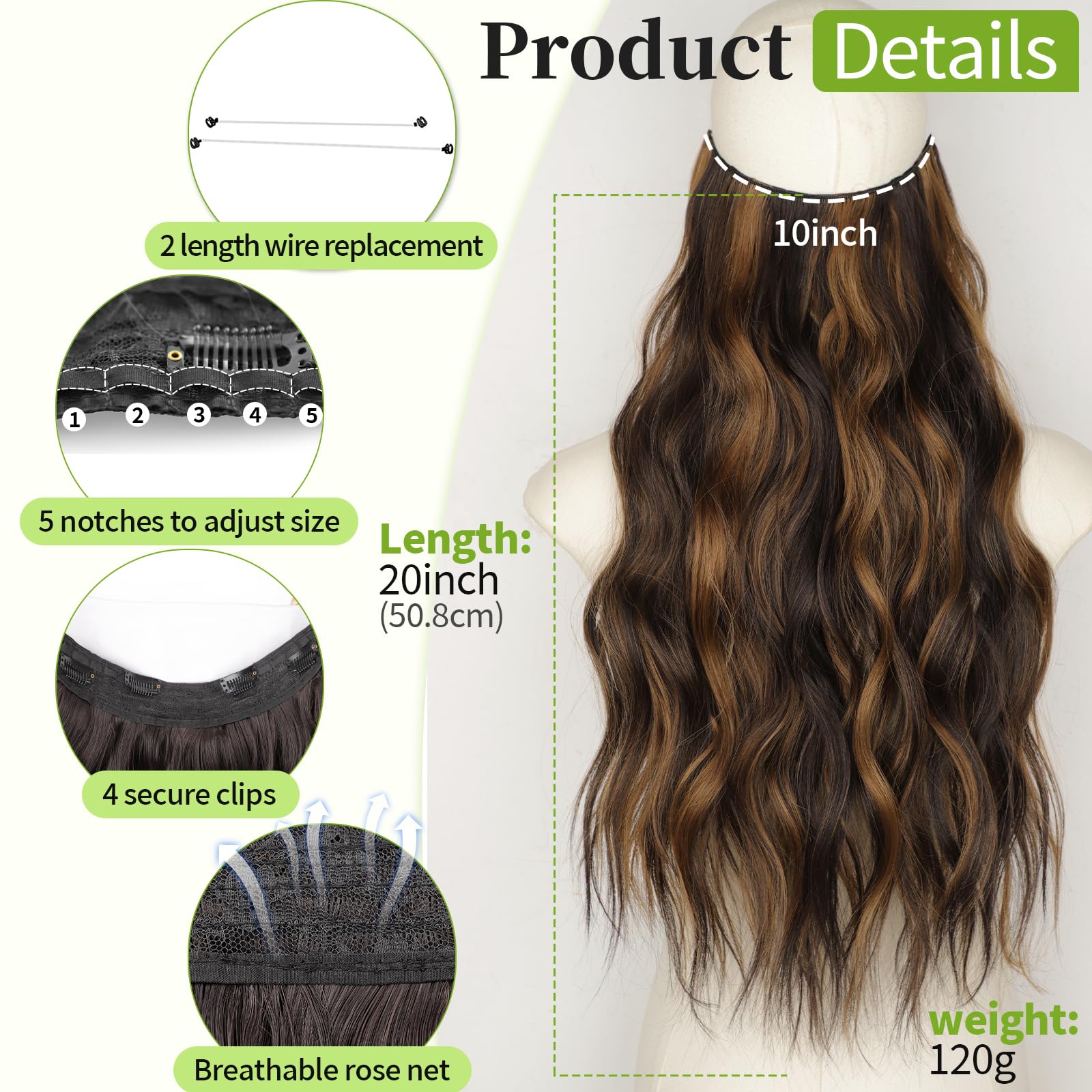Specifications: Each package includes a hair piece containing 4 clips; 2 different lengths of fishing wire for replacement; You can adjust the suitable size according to your head circumference by putting the hook into the corresponding wire notches. The upgraded wire is thicker and more flexible, not easy to break and will not cause any stress to the scalp.