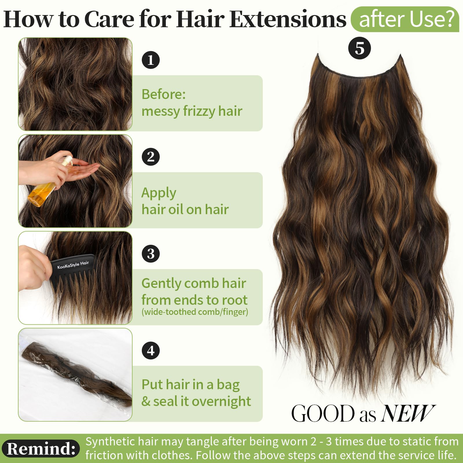 Care Tip: Unlike your own hair, hair extensions can tangle without nutrients. You can use detangle spray or get a spray bottle and put some conditioner in it and add water. If there is no conditioner, just spray some water, it will make the hair extensions not very dry and prevent tangling.