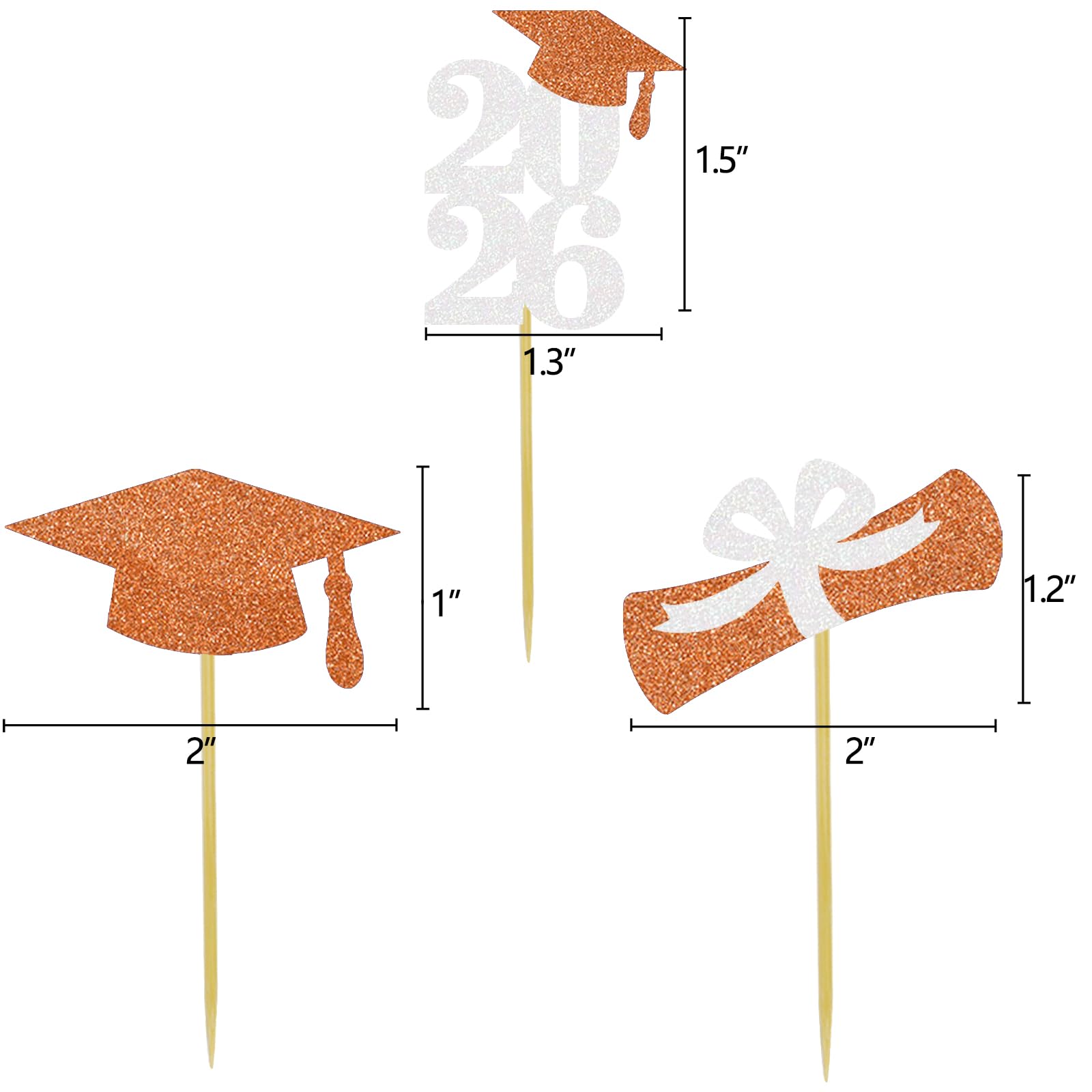 The small 2026 grad number topper measures 1.1 inches wide and 1.6 inches tall, glitter grad hat measures 2 inches wide and 1.1 inches tall, glitter grad diploma measures 2 inches wide and 1 inches tall