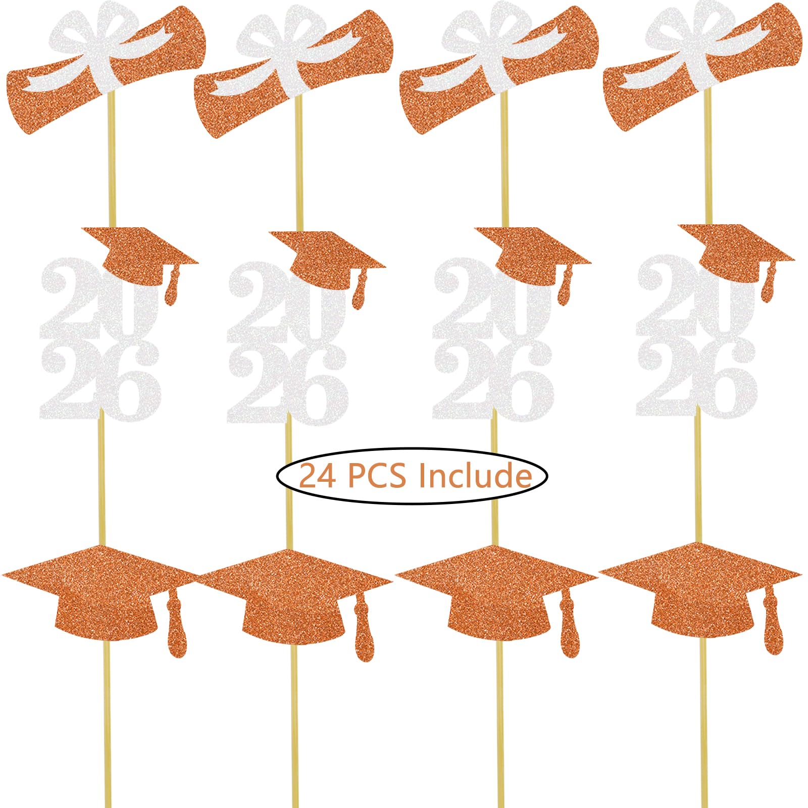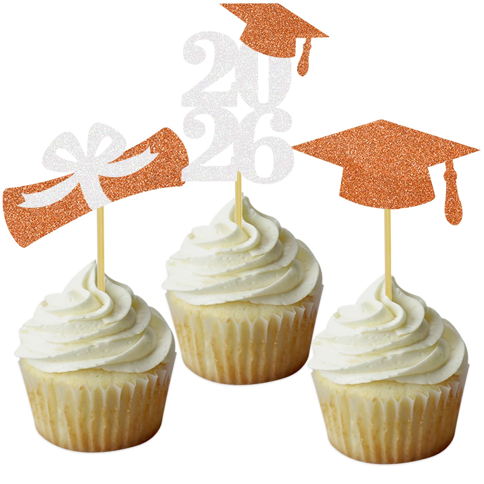 2026 graduation cap cupcake toppers: 8 pcs orange grad cap cupcake toppers, 8 pcs white 2026 number with orange grad hat cupcake toppers, 8 pcs orange and white diploma bow cupcake toppers