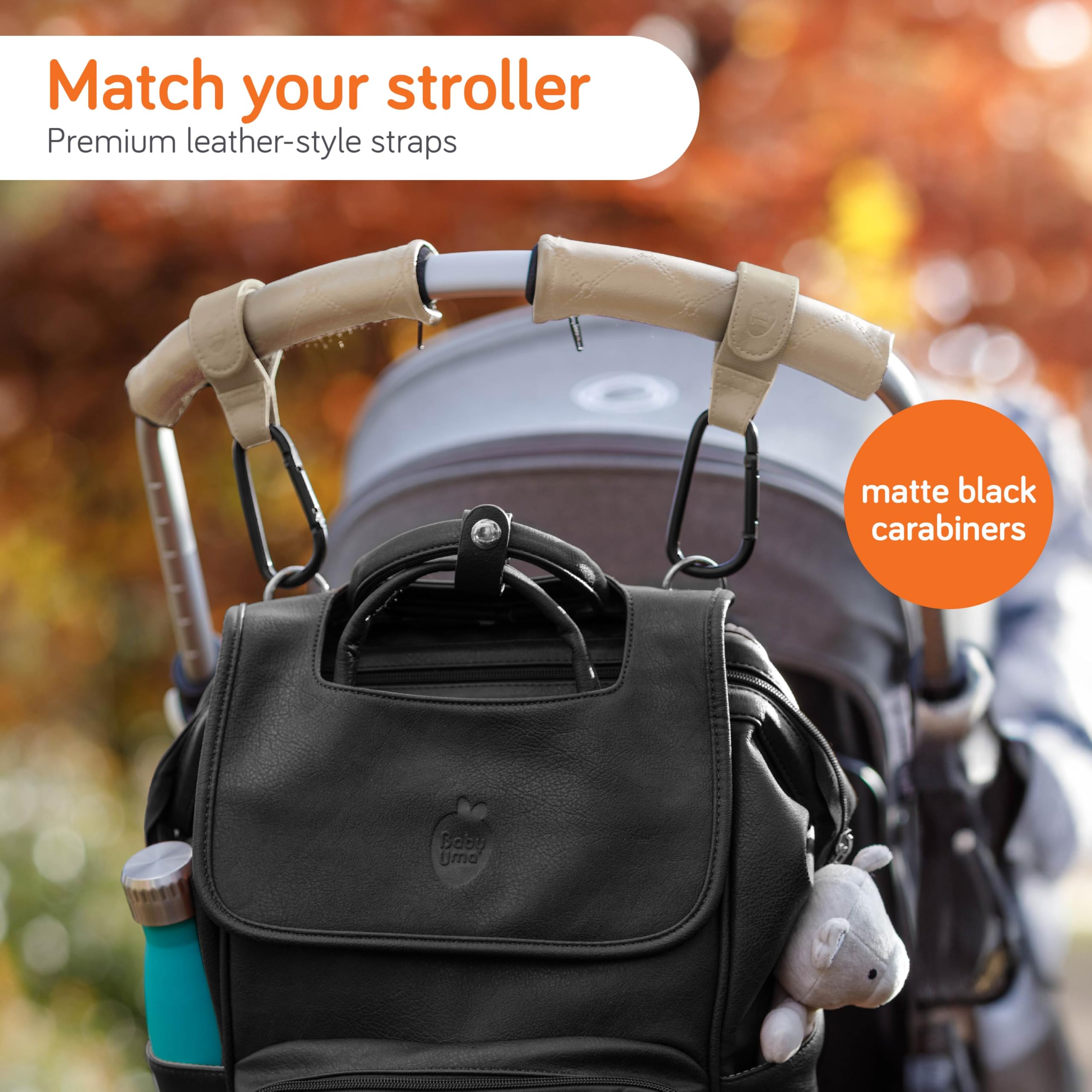 CARRY 4 EXTRA BAGS: Sturdy yet lightweight, the beautiful mommy hook combines a faux leather strap with matte black carabiners. Each stroller carabiner clip can handle 11 lbs with ease!