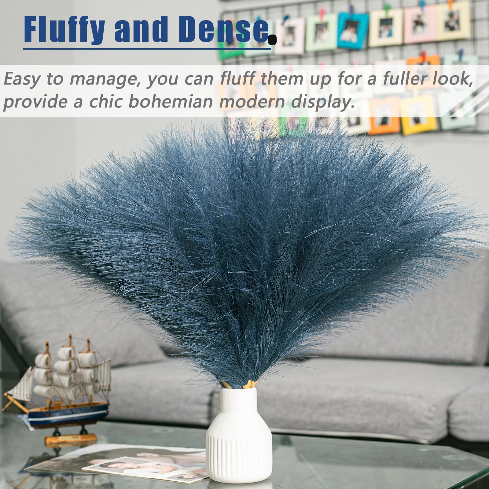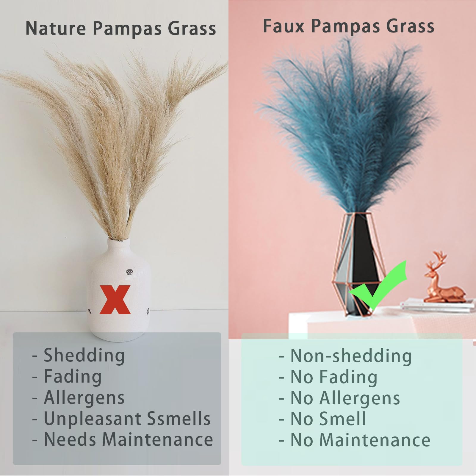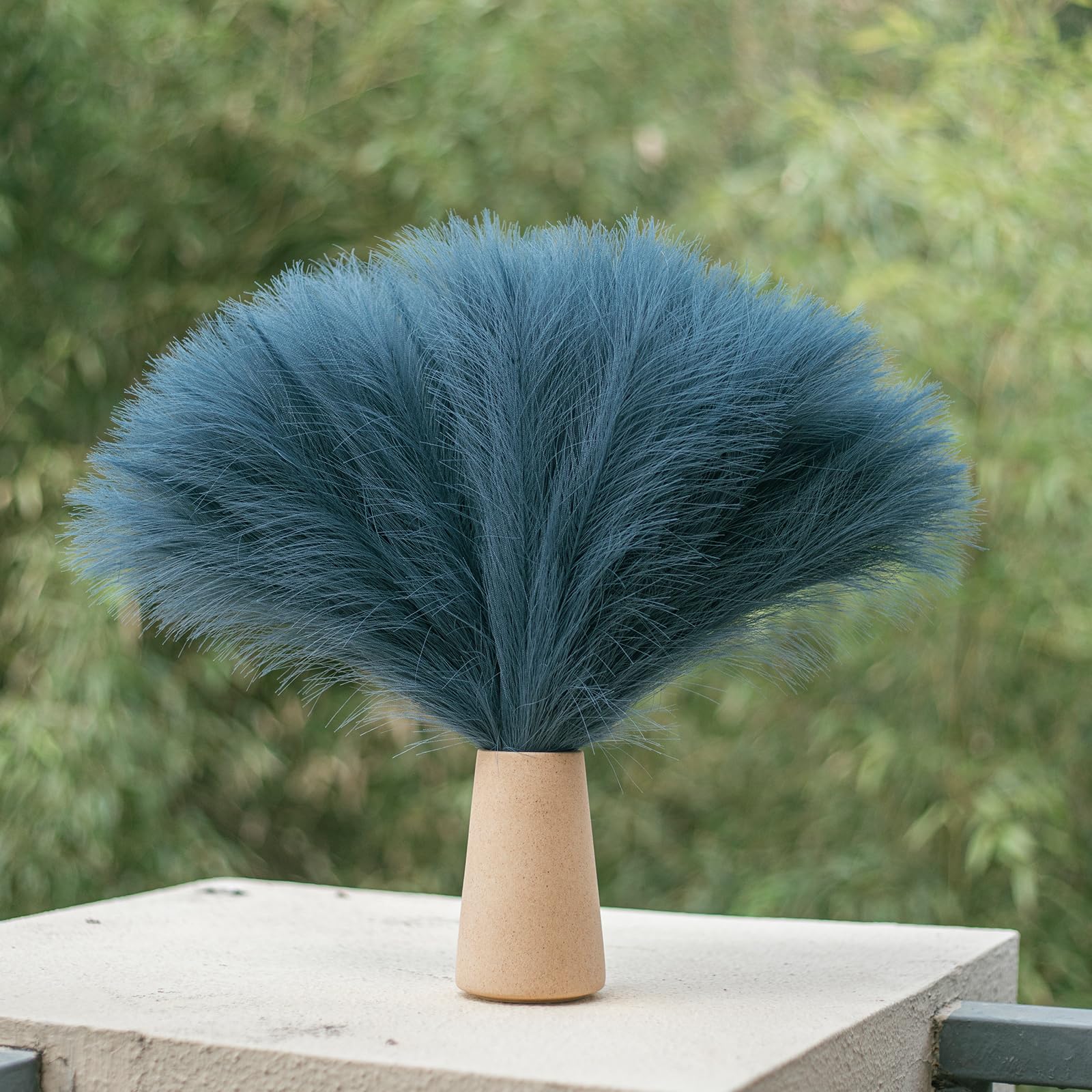 【Fluffy & Non-fading】Different from natural dried pampas grass, artificial pampas grass will not shed or fade away through out time, doesn't deform, is fluffy and dense, is easy to manage, you can fluff them up for a fuller look, provide a chic bohemian modern display