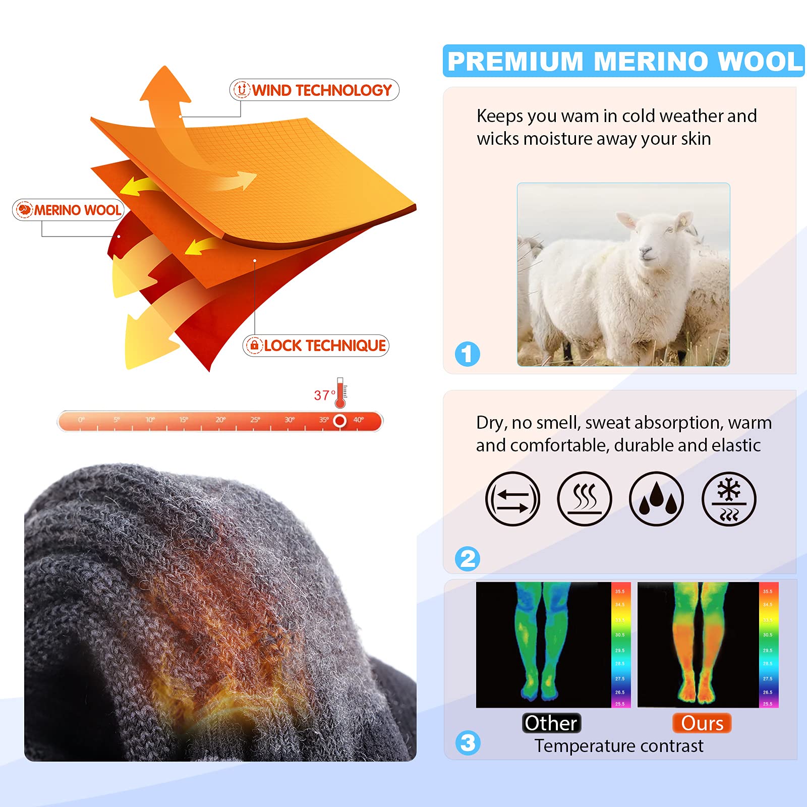 THERMAL MERINO WOOL SOCKS: These cold weather socks have been exclusively manufactured with Thermolite technology combined with natural Merino wool. Merino wool is the most Moisture wicking fabric transports sweat away from your body quickly and offer more breathability. Odor-resistant properties keeps smell fresh, dry and breathable while working, hiking, trekking, camping, hunting, ice fishing or playing winter sports