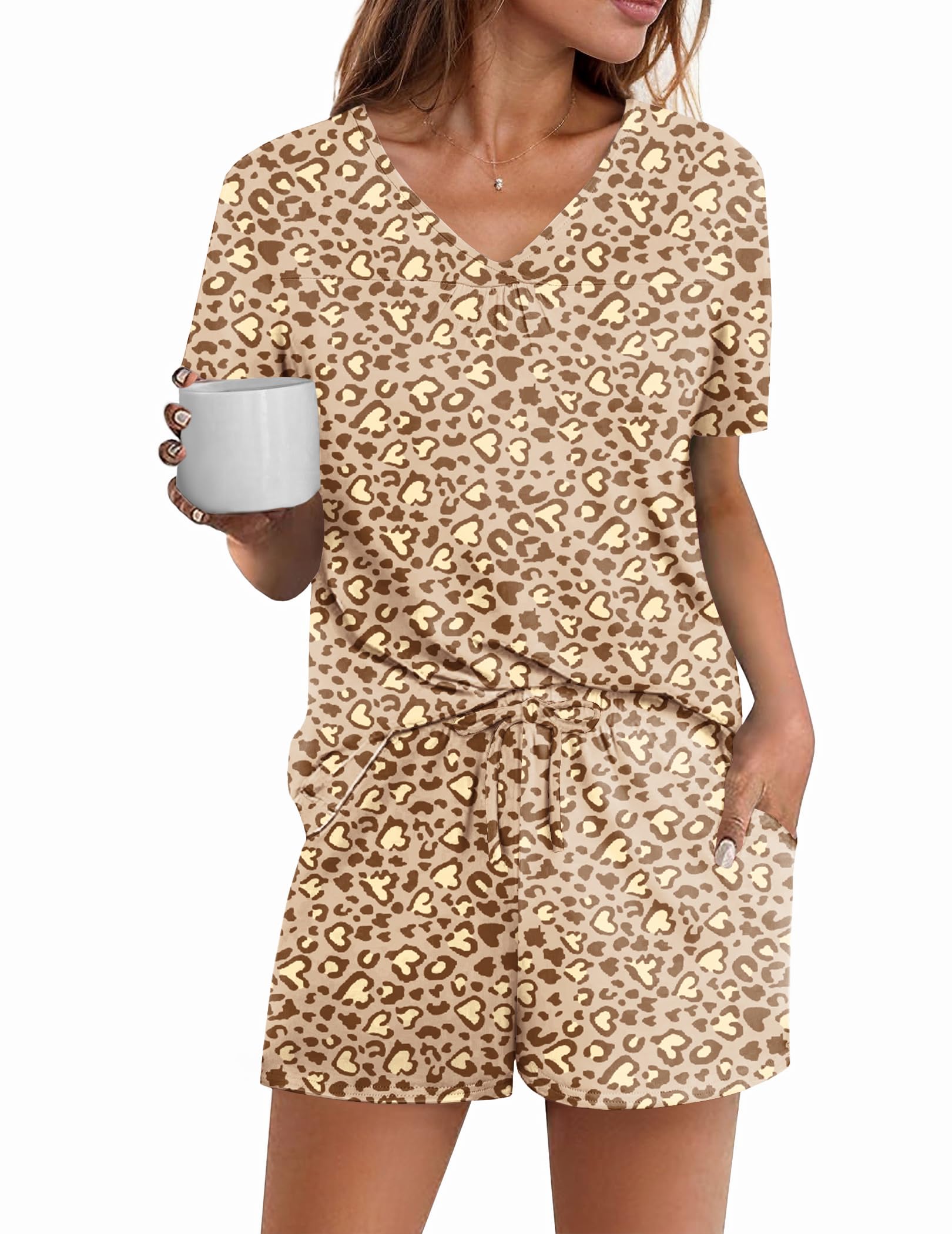 This soft pajama top features V neck, short sleeve, pleated front neckline,and the comfy modal pajama shorts is designed with elastic waist, drawstring and thigh-length