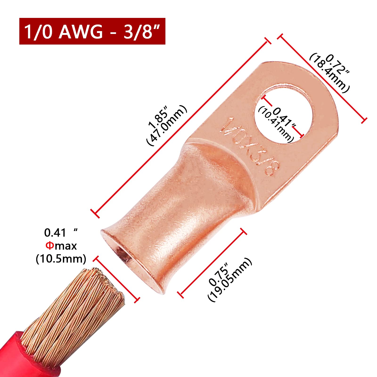【What You Get:】 4 Pcs per pack of 1/0 Guage (AWG) 3/8" ring terminals, copper lugs closed end termination ring terminals with 4 Pcs 3:1 Dual Wall Adhesive Heat Shrink Tubing Tube for your work(2pcs Black and 2pcs Red).