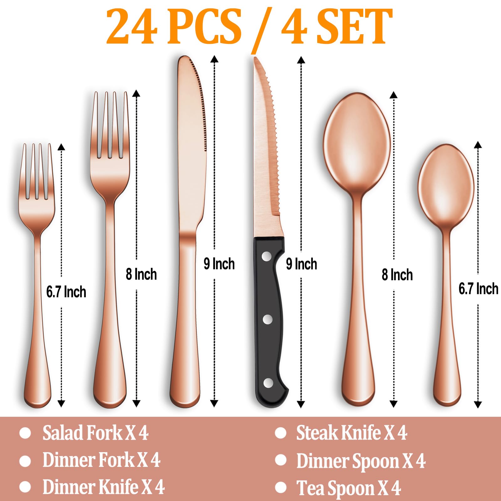 24 PCS ROSE GOLD SILVERWARE SET FOR 4: This rose gold silverware set comes with 4 Dinner Knife, 4 Steak Knives, 4 Dinner Forks, 4 Dinner Spoons, 4 Salad/Dessert Fork and 4 Dessert/Tea Spoons, essential for families or restaurants. The set is also an irreplaceable dining tool whether it is for daily use or for preparing dinners or parties.