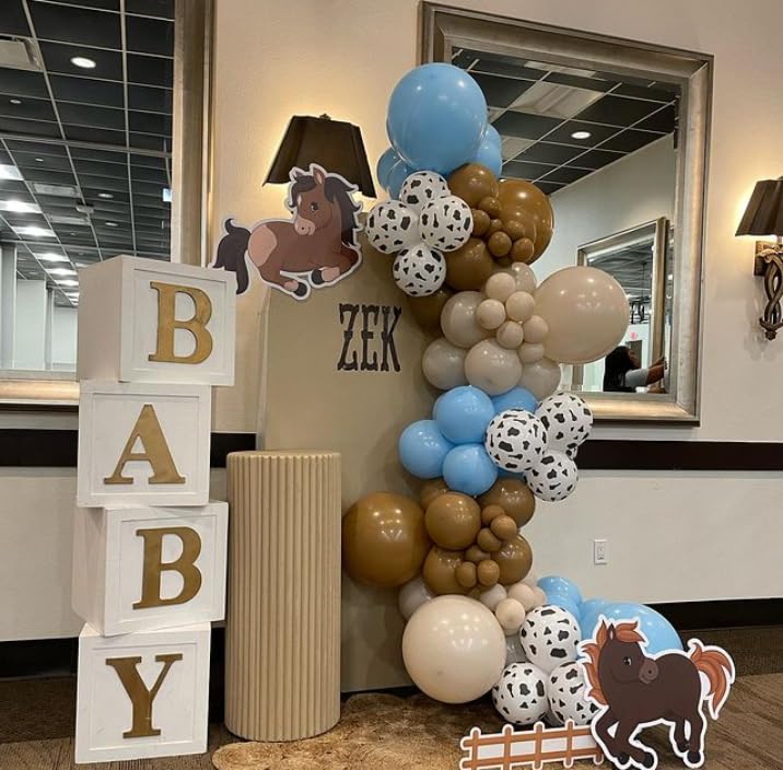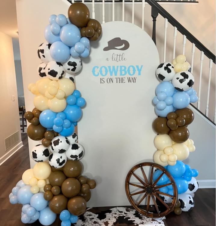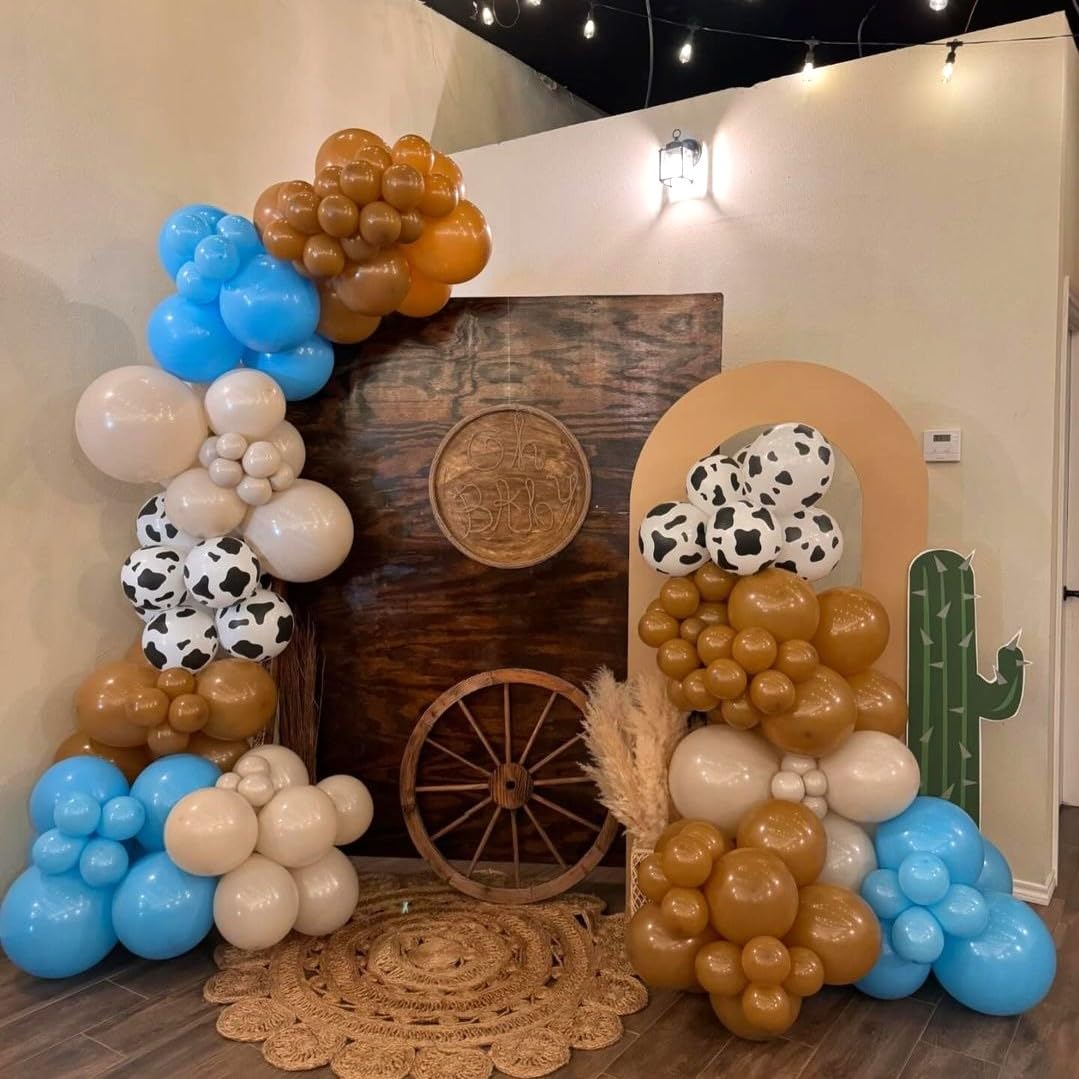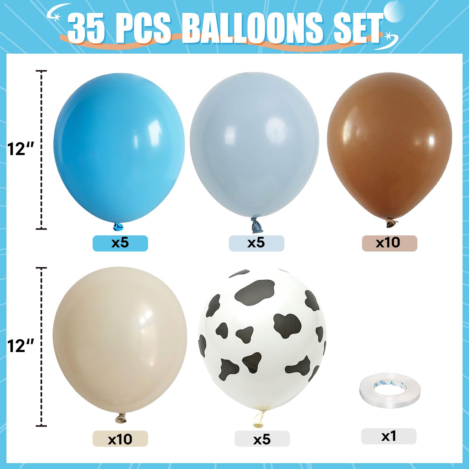 CowboyBalloons:You will receive this 35pcs 12-inch cowboyballoons, which includes 5 colors. 10pcs sand white balloons, 10pcs matte brown balloons, 5pcs cow print balloons, 5pcs matte light blue balloons, 5pcs baby blue balloons. Accompanying by a 10M ribbon. Blue brown colored decoration will embellish your theme party