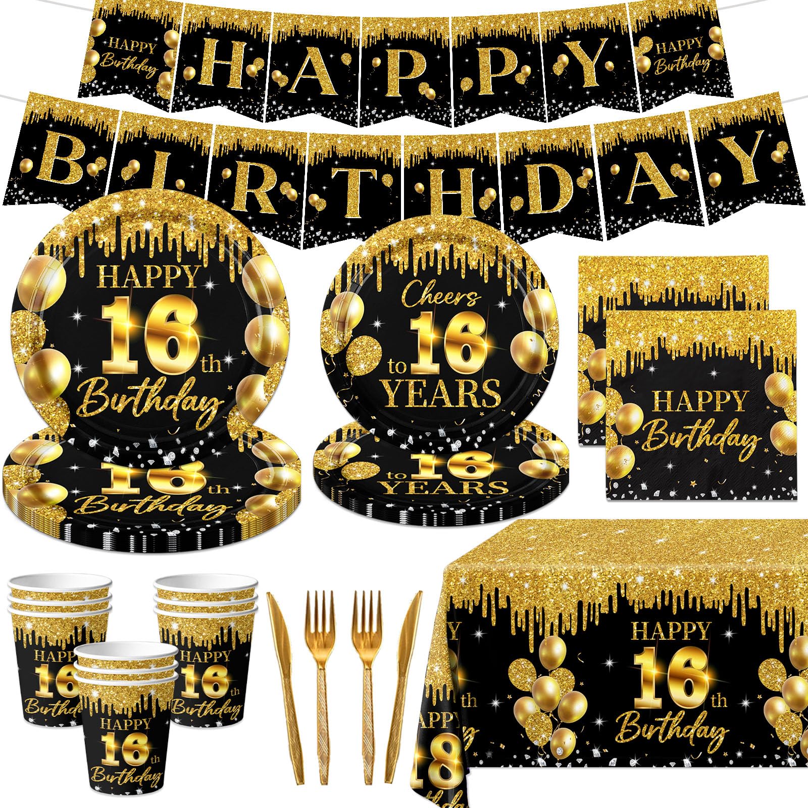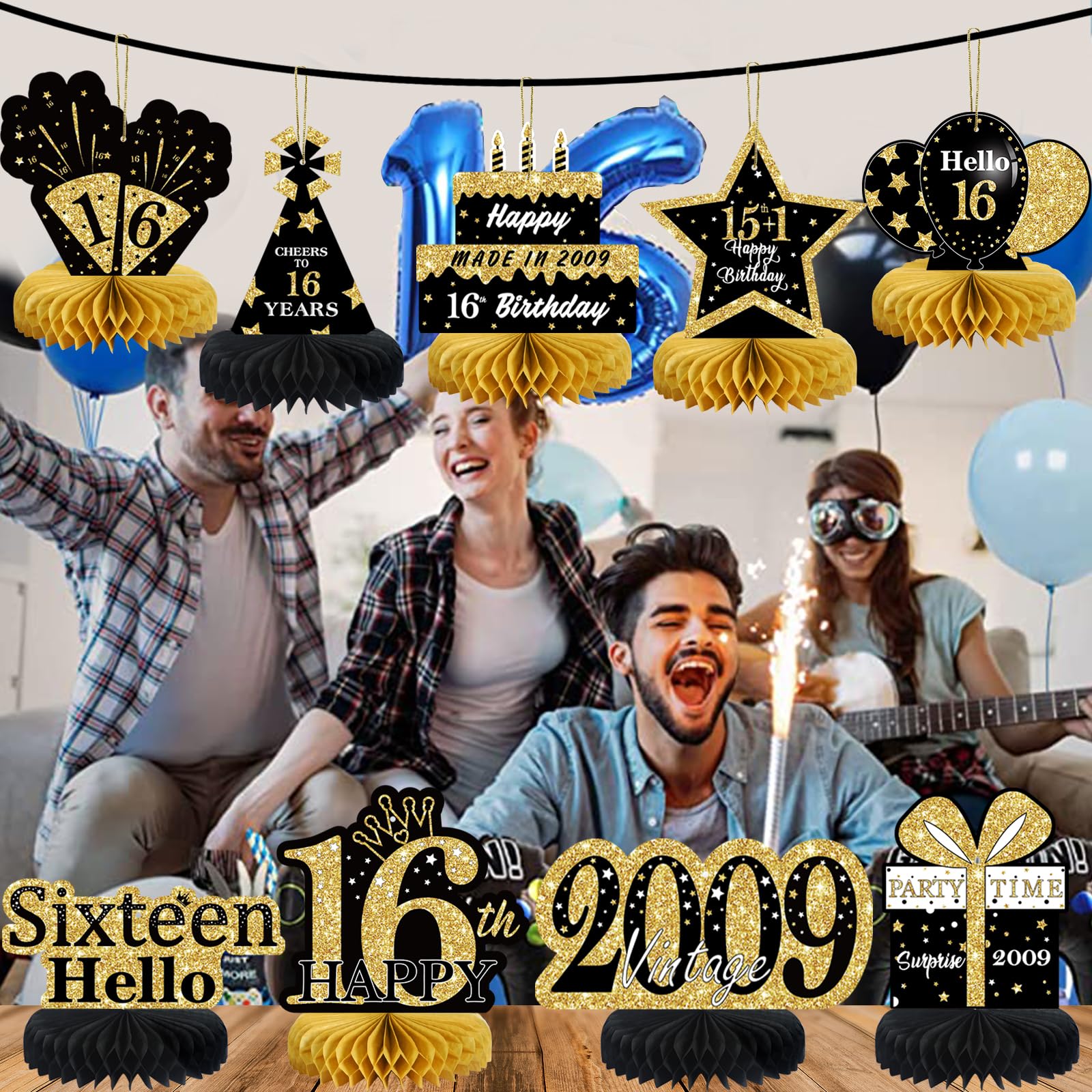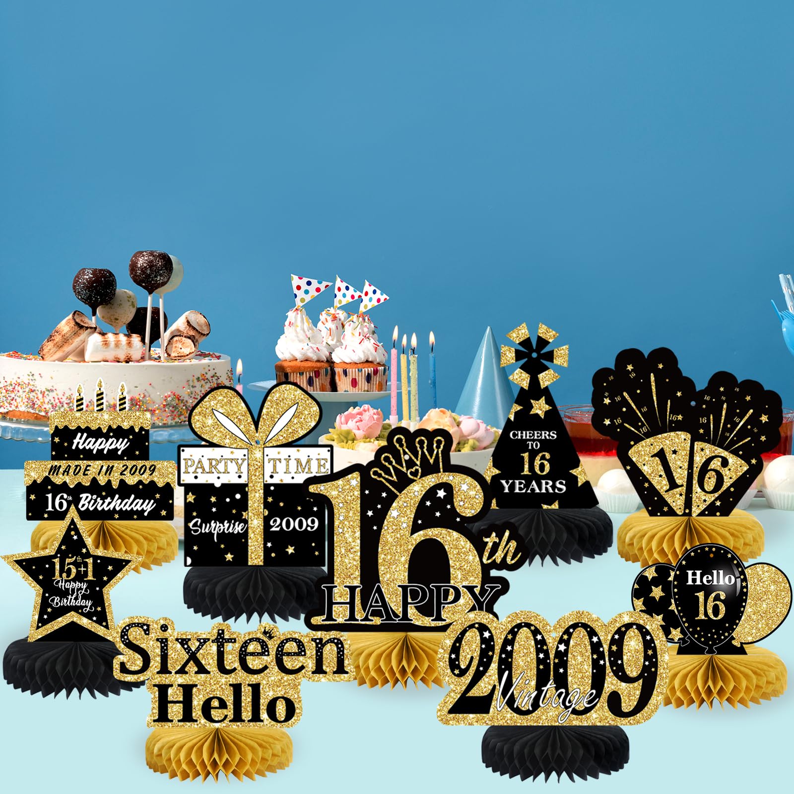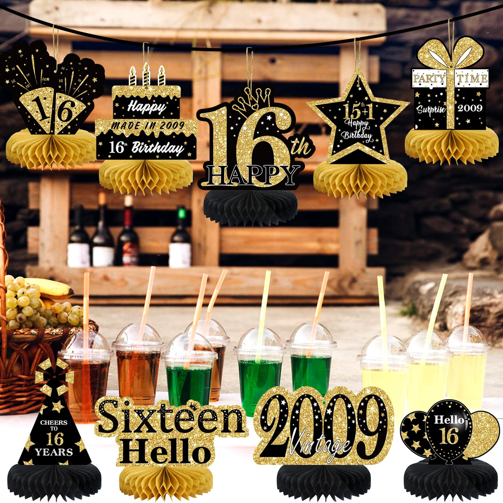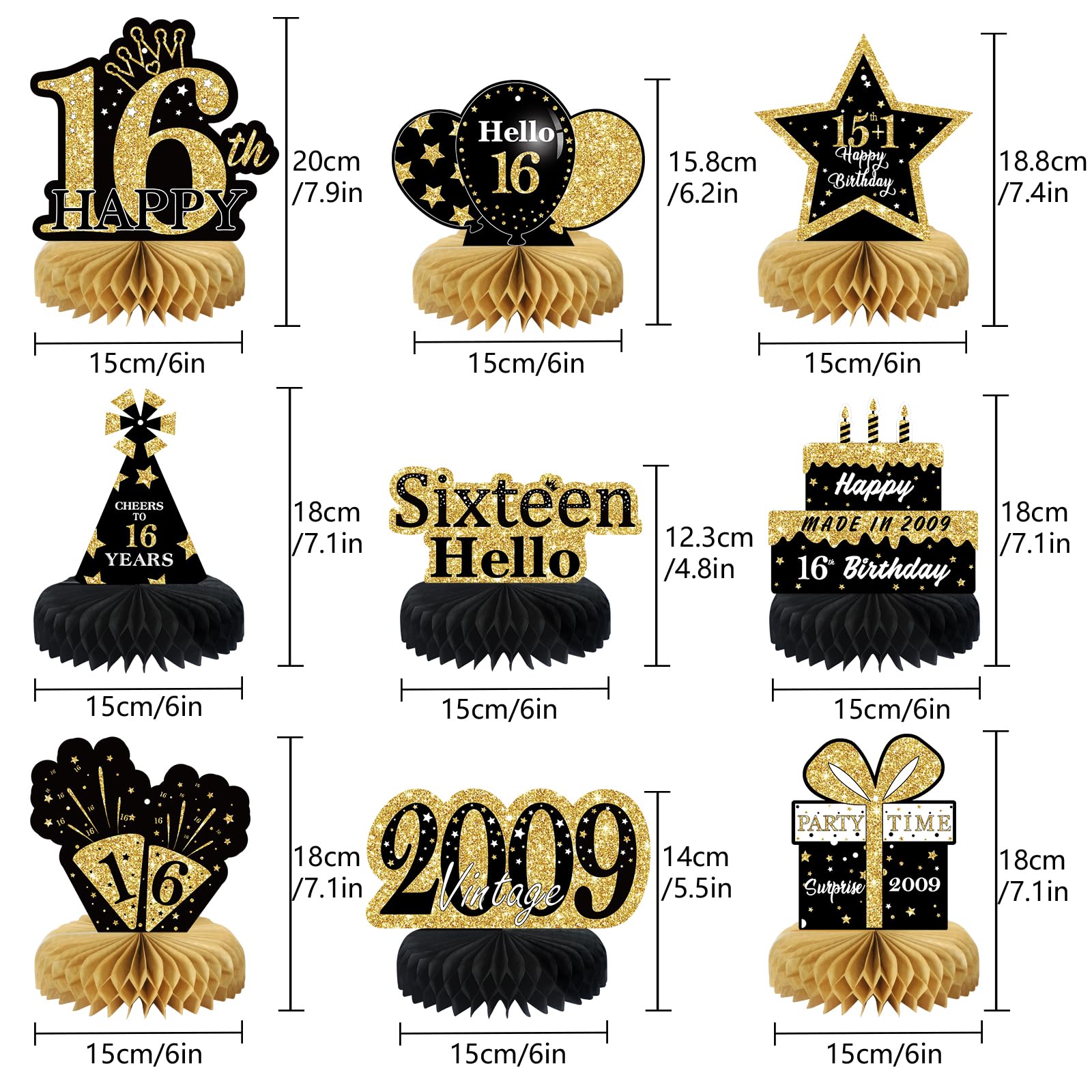 [You Will Get] - 9 pcs black gold 16th birthday decorations honeycomb table centerpieces for boys and girls, it contains 9 patterned cardboards and 9 paper honeycombs,and matching lanyards.These chic 16th birthday table decorations are enough to decorate your themed party.
