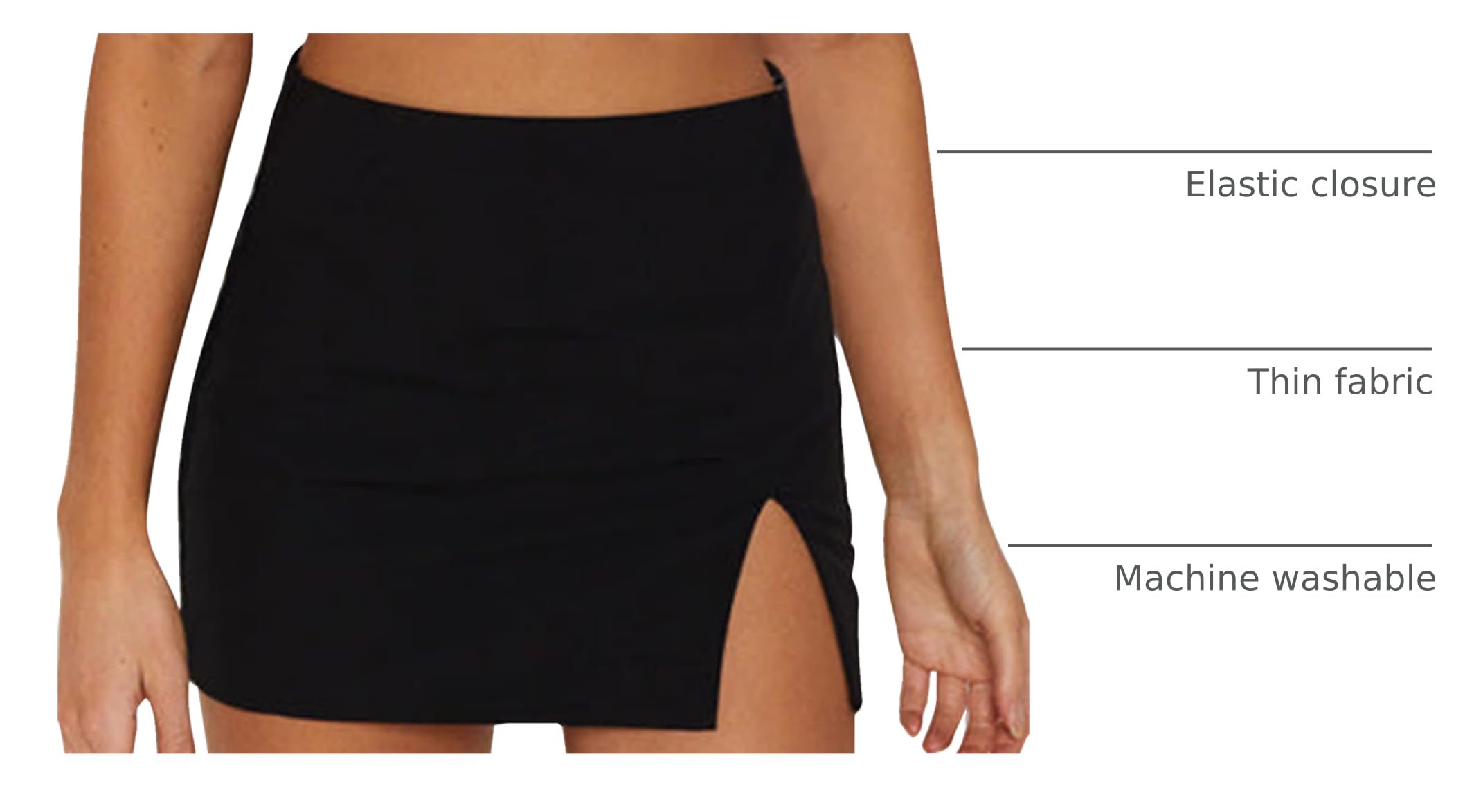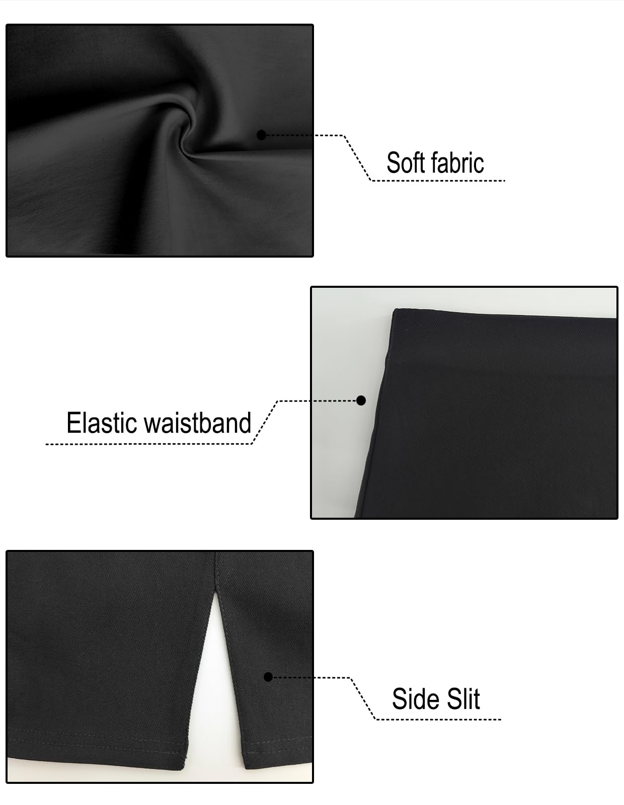 Design features: Black, High waist, Stretch, Fitted, Bodycon, Slit, Mini skirt