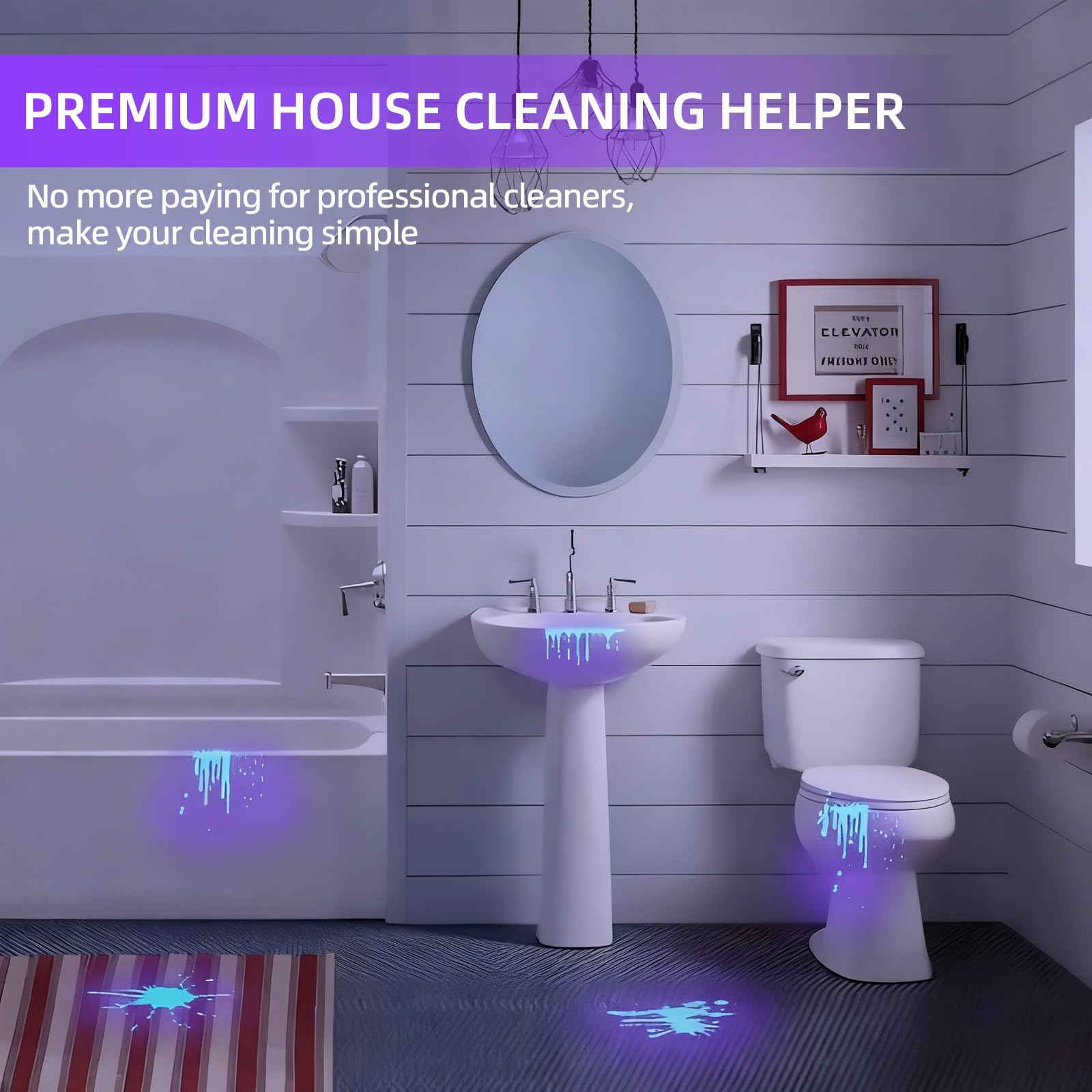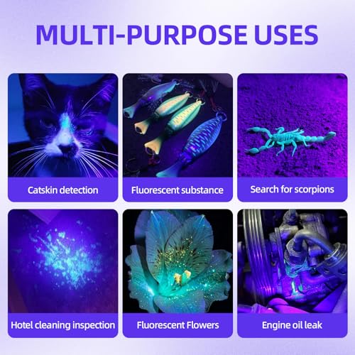 【The Power of 395nm Black Light】 Unlike professional 365nm lights that emit invisible rays, the 395nm UV Flashlight is optimized for high-intensity visibility. It projects a powerful, deep-purple beam that makes organic stains and scorpions glow instantly, even in low-light environments. This wavelength provides the perfect balance between detection sensitivity and user safety, making it the most versatile choice for household pet-stain detection, leak checking, and resin curing.