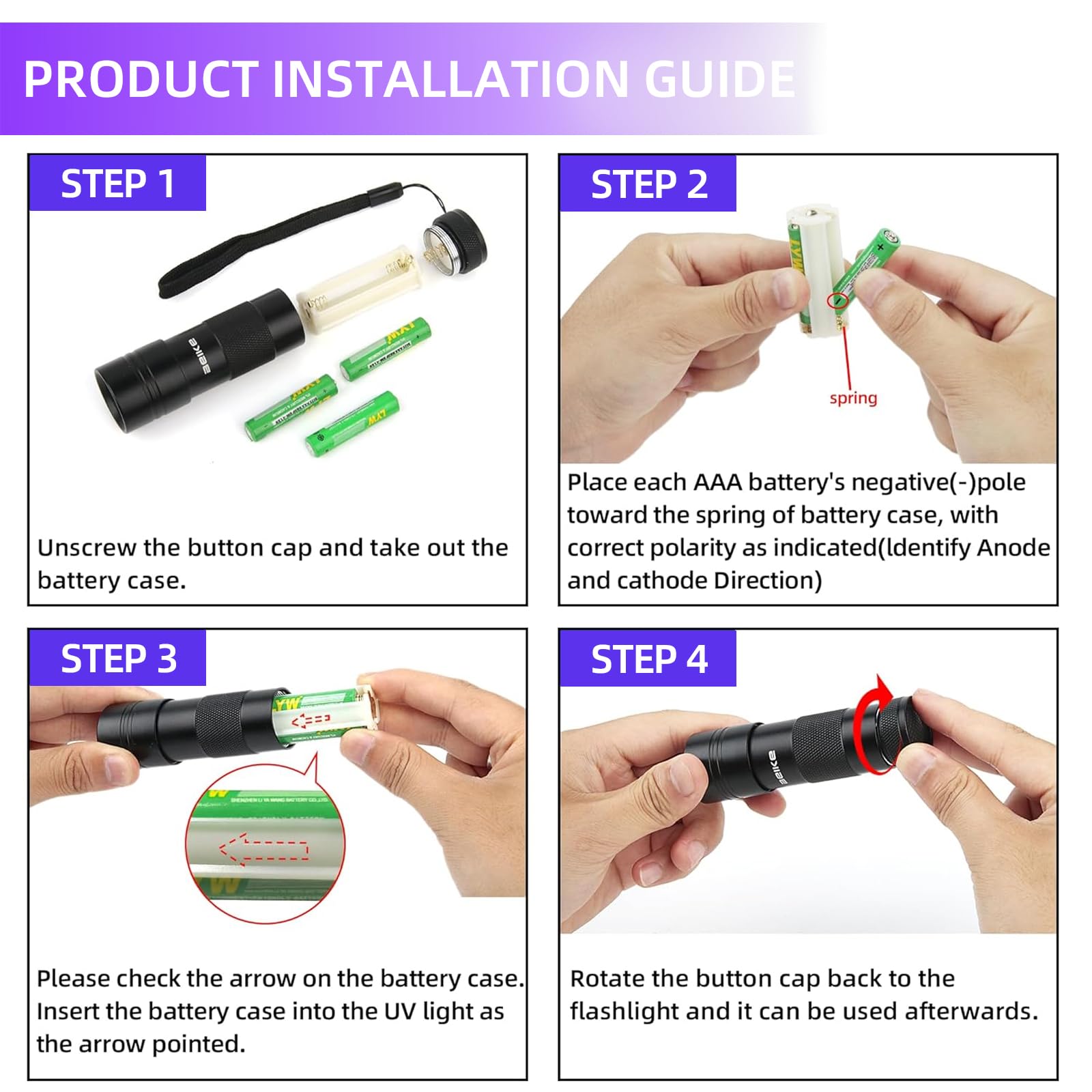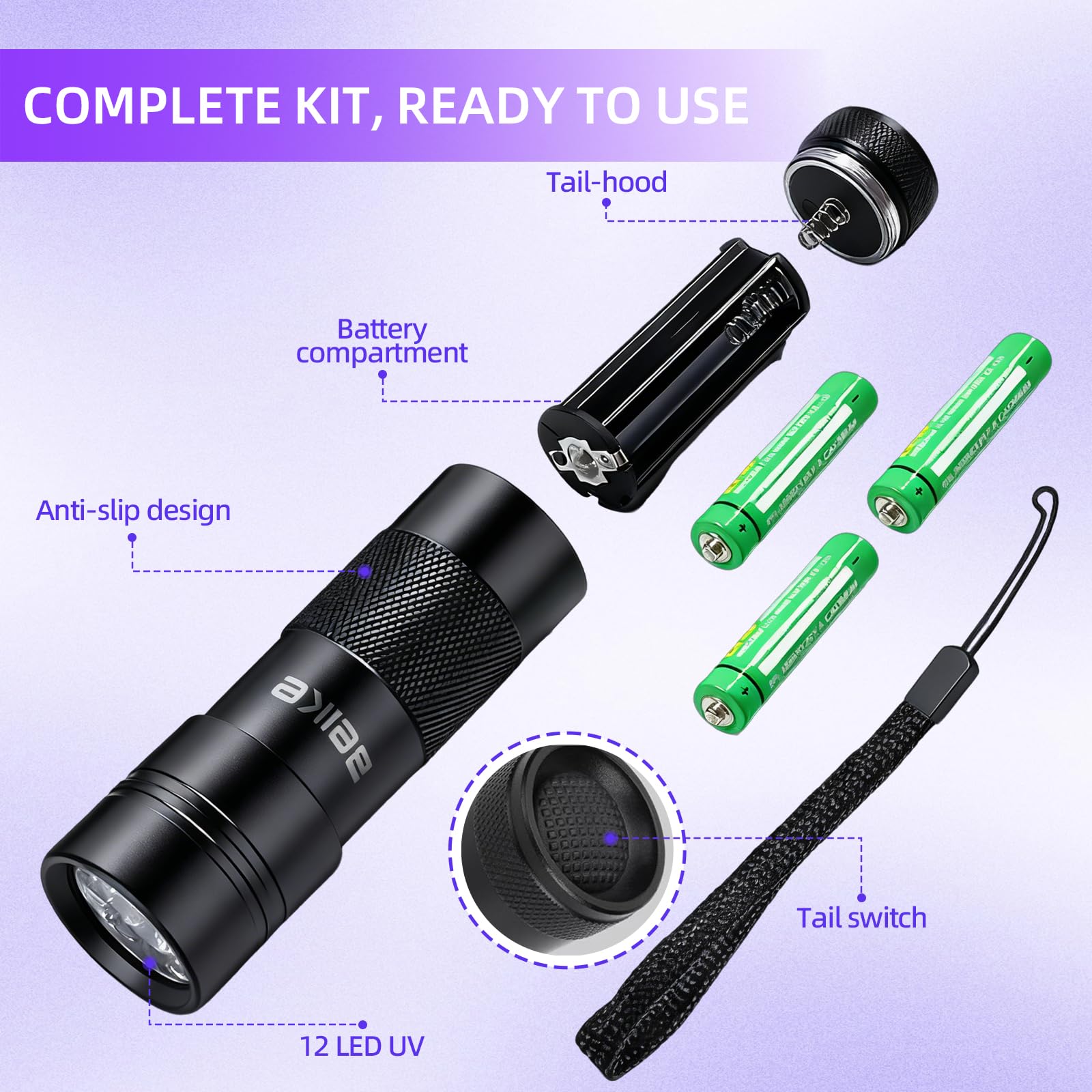 IPX4 Waterproof & Reliable Service Package: Rated IPX4 waterproof, this Portable Black Light Mini UV Flashlight performs reliably in damp environments and light rain, offering protection against splashes from any direction. What You Get: Your purchase includes 1x Stain Detector UV Flashlight, 3 x AAA Batteries (Included), and 24/7 easy-to-reach professional support. It is a dependable, ready-to-use blacklight solution for leak detection, mineral hunting, and household hygiene maintenance.