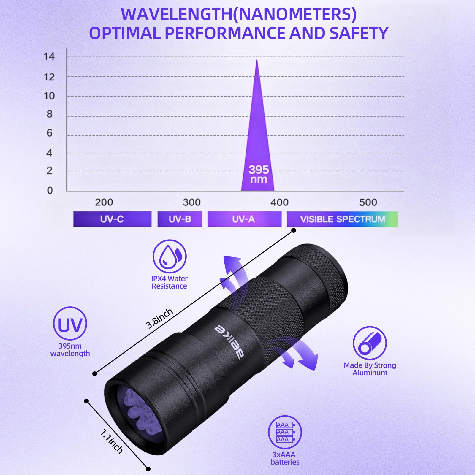 The Black Light Mini UV Flashlight has the following specifications: 1. Dimensions: 3.8 x 1.1 x 1.1 inches 2. Weight: 2.2 ounces (62.4 grams) 3. Battery Type: Supports 3 x AAA batteries 4. Important Note: If the UV flashlight is not used for a long time, it is recommended to remove the batteries to prevent corrosion of the battery holder. 5. Rechargeable Batteries: Not compatible with rechargeable batteries. 6. Black Light 395nm: High Intensity, Vivid Fluorescence, and Reliable Performance.
