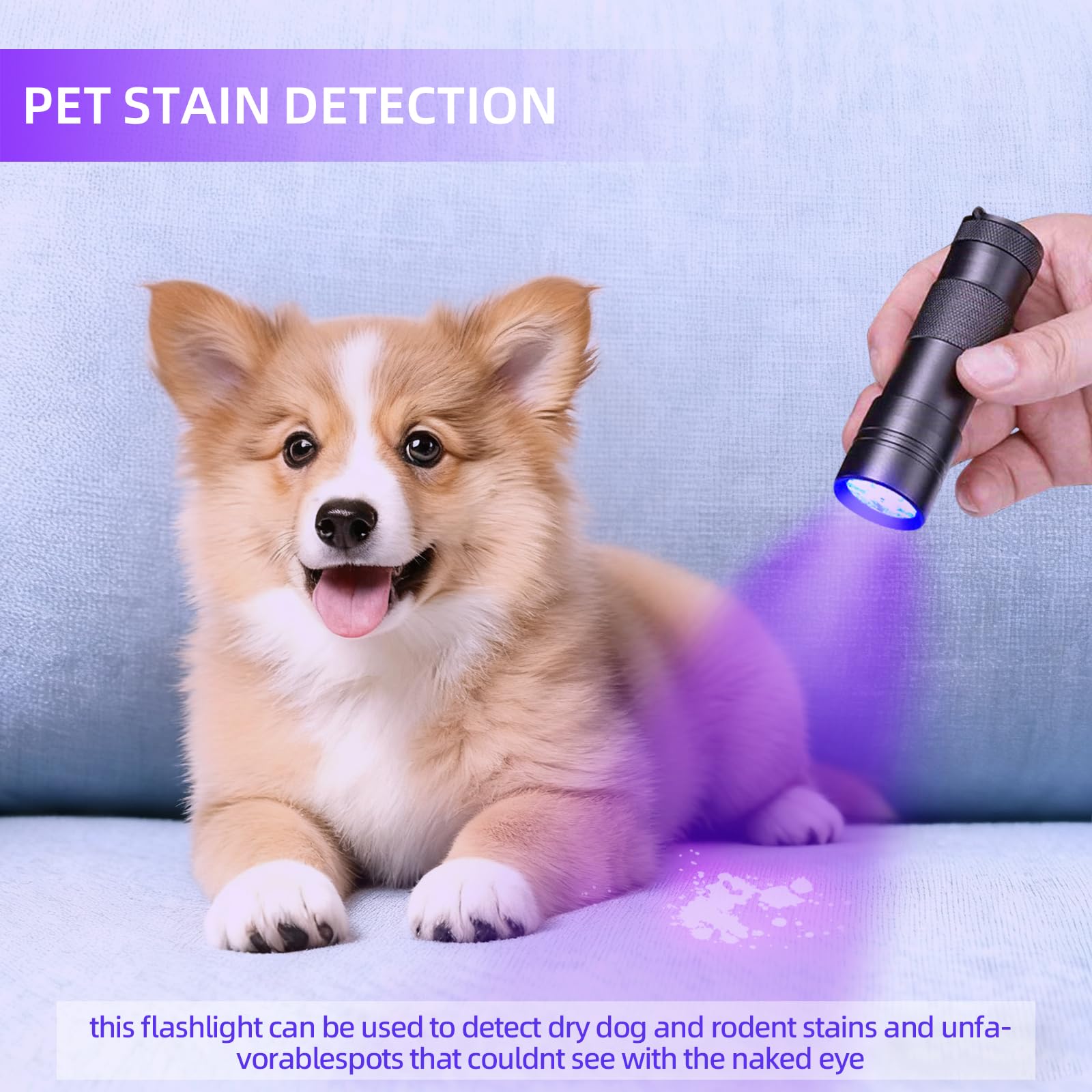 Maximized Use for Black Light UV Flashlight: This Black Light UV Flashlight instantly detects dried dog urine, food stains, and hidden grime on rugs and carpets. Identify cat ringworm and skin fungi for pet health; spot scorpions and bed bugs in dark rooms. Authenticate currency, passports, and ID cards; inspect jade and gemstones with ease. Reveal fluorescent agents in baby clothes and cosmetics to ensure family safety. A portable UV nail dryer for quick curing of nail gels and resin.