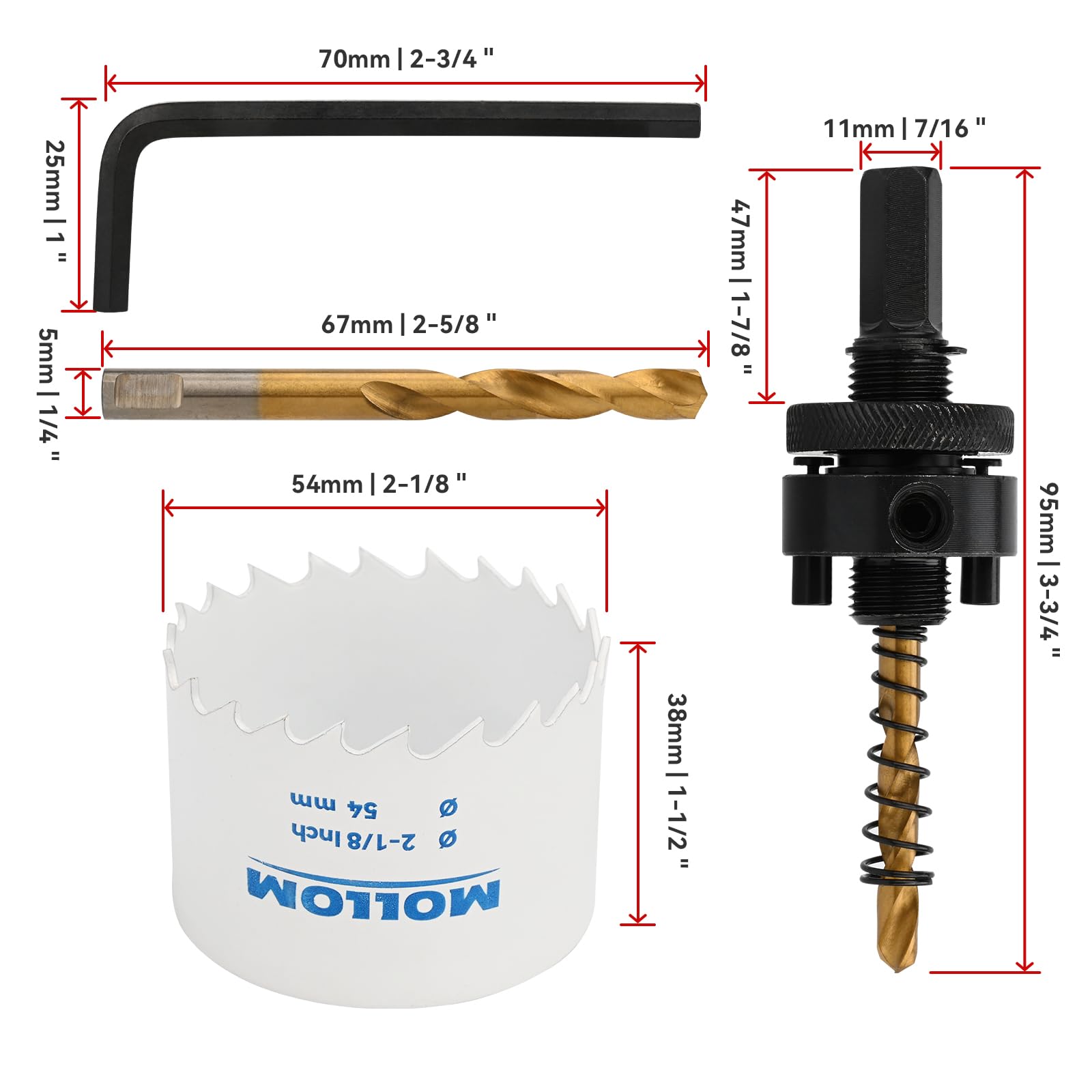 【Dimension】Cutting Dia: 54mm | 2-1/8";Shank Dia: 11mm | 7/16",BI hole saw over 51mm require stronger shank to ensure more security;Hole Saw Depth : 38mm | 1-1/2".Adopting raw materials of Japanese brand sawbands