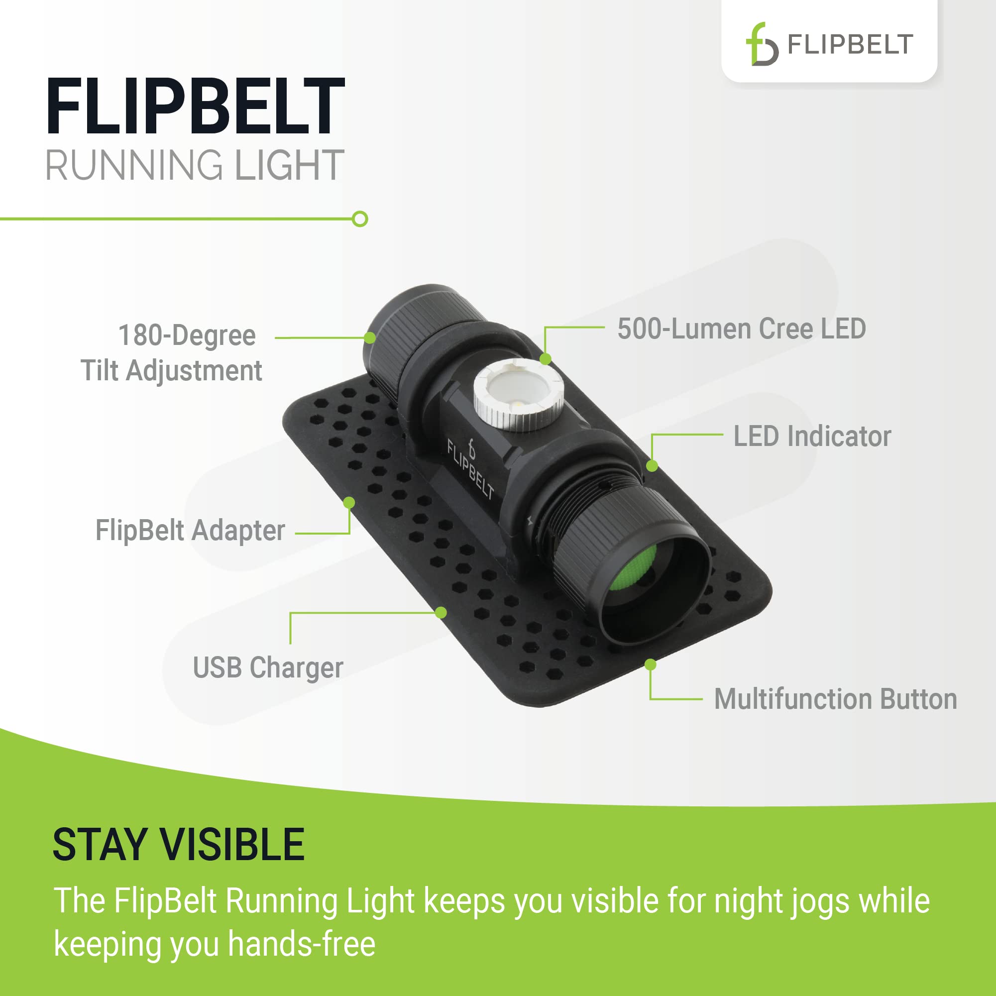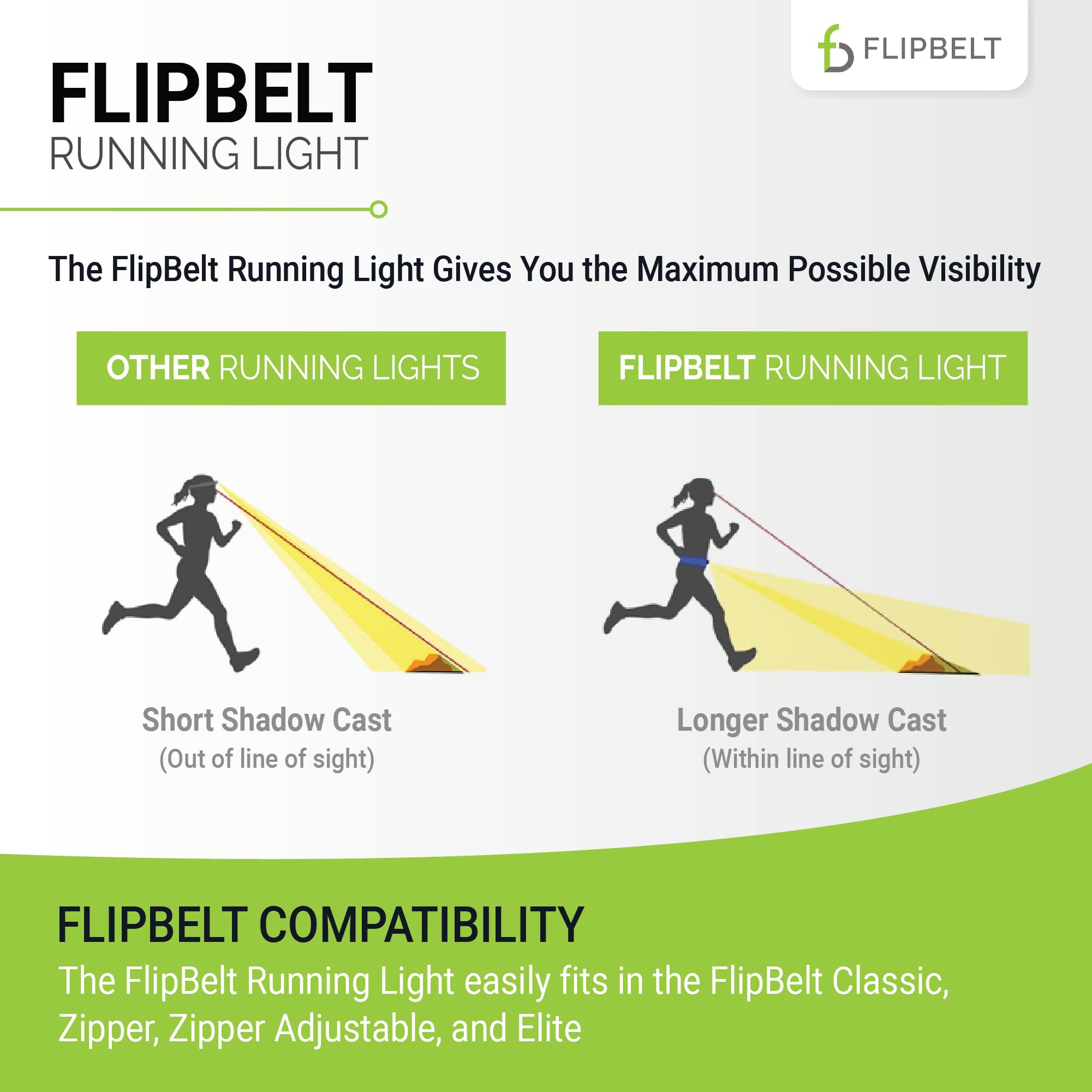 RUNNING WAIST-BELT LIGHT: The FlipBelt LED Running Light allows you to both see and be seen while on the move in the dark. This waist light for runners fits securely into any access point on FlipBelt Running Belts, is rechargeable, provides 12 hours of use, and features an IPX6 waterproof aluminum shell.