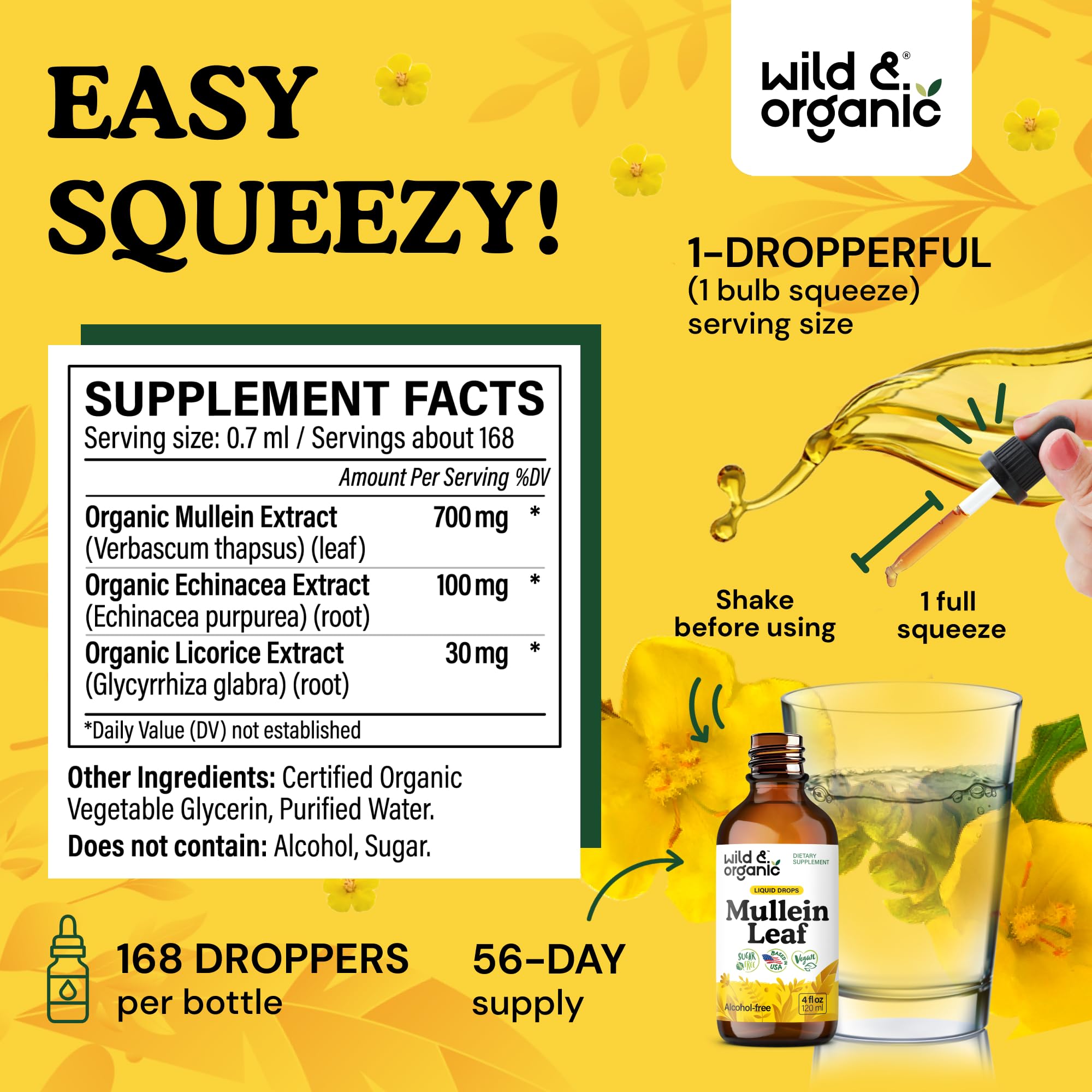 56-Day Supply: Each 4 fl. oz. bottle of Wild & Organic mullein leaf drops contains 168 servings per bottle, providing a 56-day supply when taken three times per day.