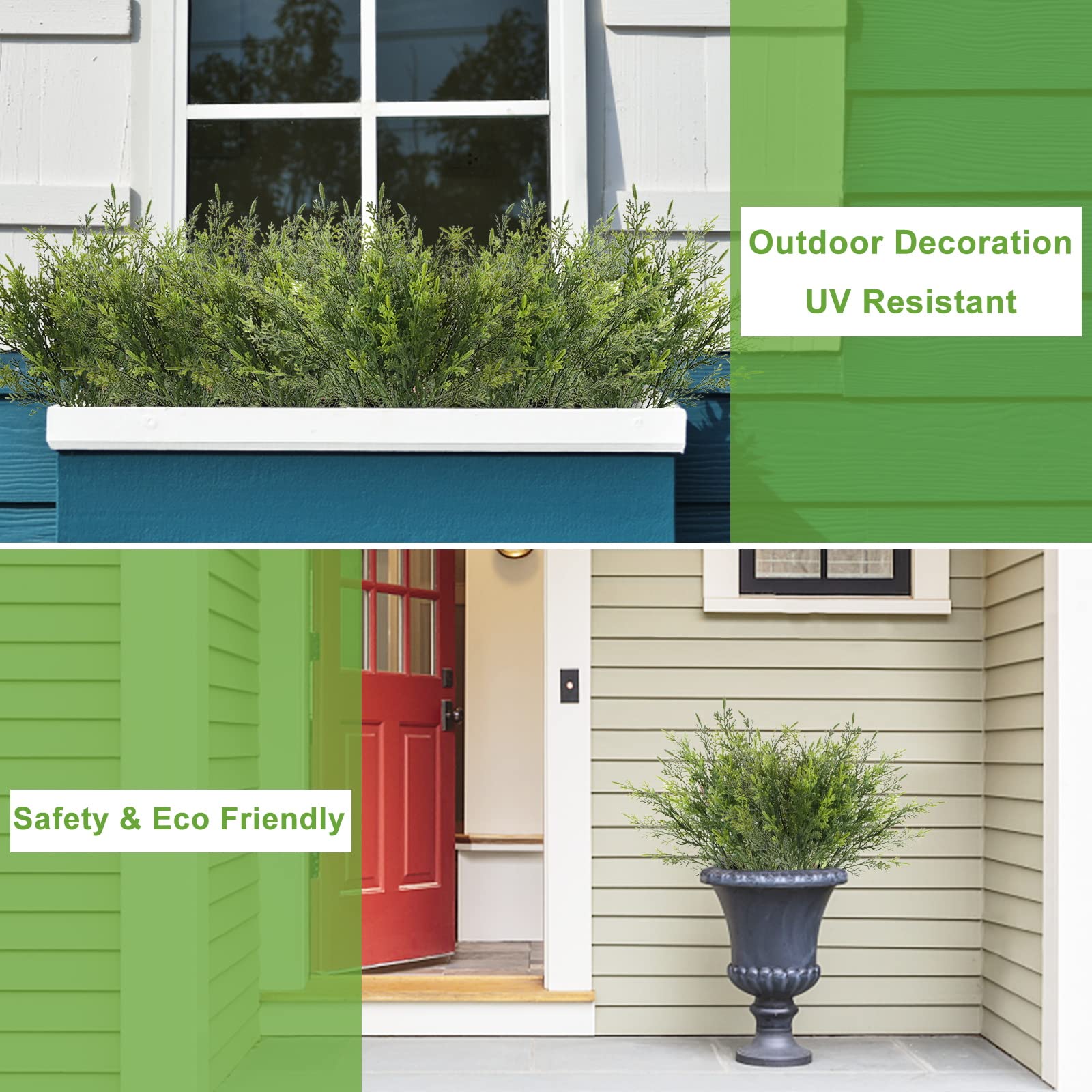 Home Ideal: Lifelike outdoor artificial cedar plants bring life and vitality to your home, adding a pleasant and harmonious atmosphere to your home. This fake grass is made of non-toxic and harmless high-grade plastic, which is a healthy and durable home decor.