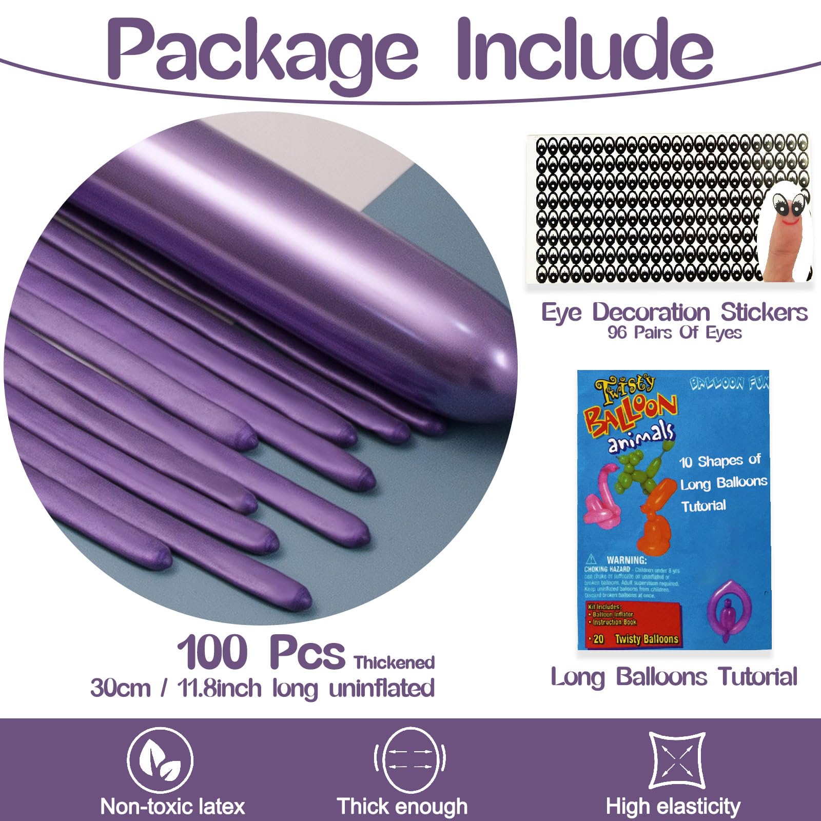 What you get: Pack of 100 Metallic Purple long balloons, 30cm long uninflated, up to 150cm after inflation, each balloon has undergone rigorous testing to reduce the defect rate as much as possible