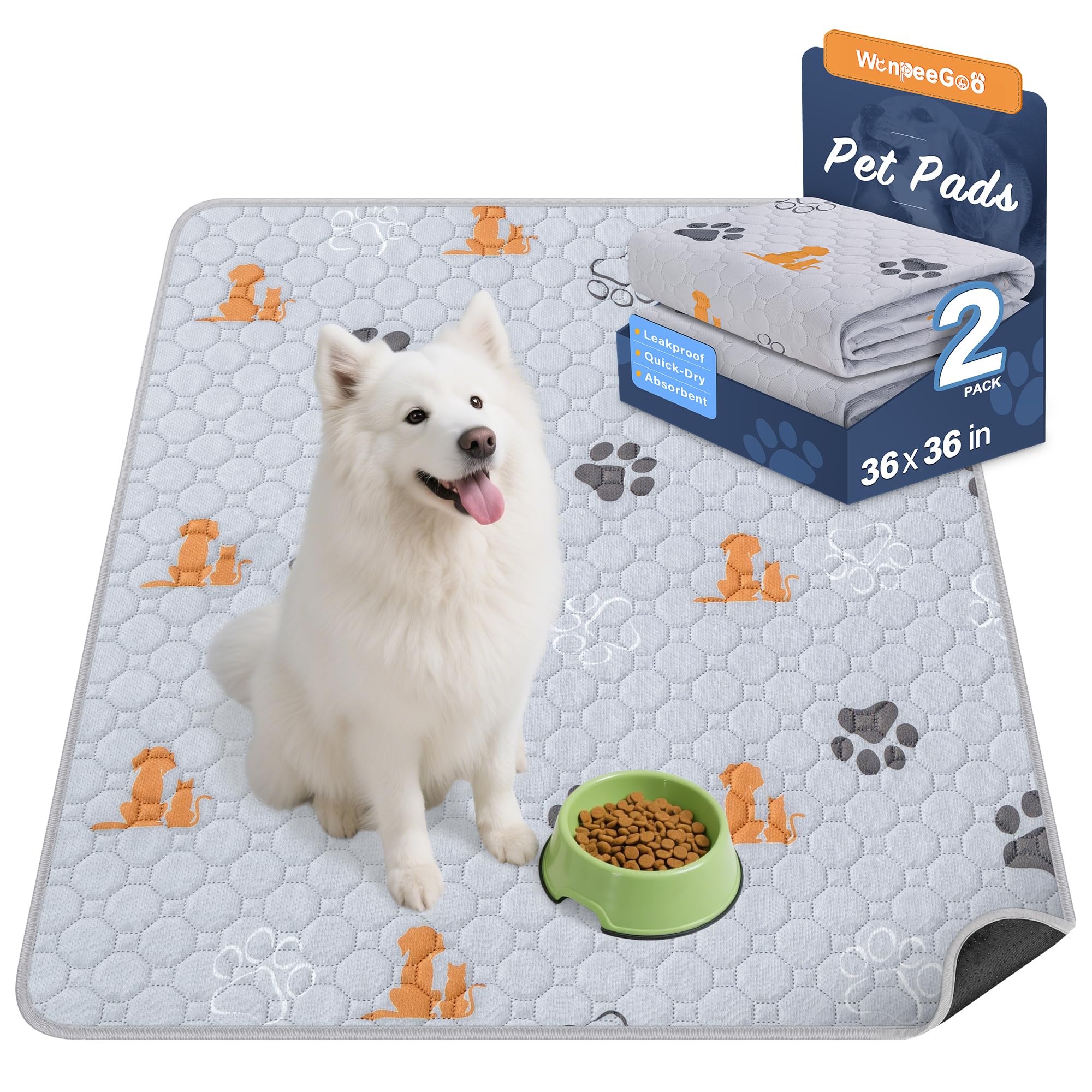 【Cute Dog Pee Pads】Come with 2 Packs. 36"x36" size with cute pattern are available to accommodate all dog breeds.Washable dog pee pads with our stylish design can be a puppy training pad, dog pen mat, dog playpen mat, dog carpet waterproof, crate pad, waterproof floor mat, pet piddle pad, dog kennel pad.