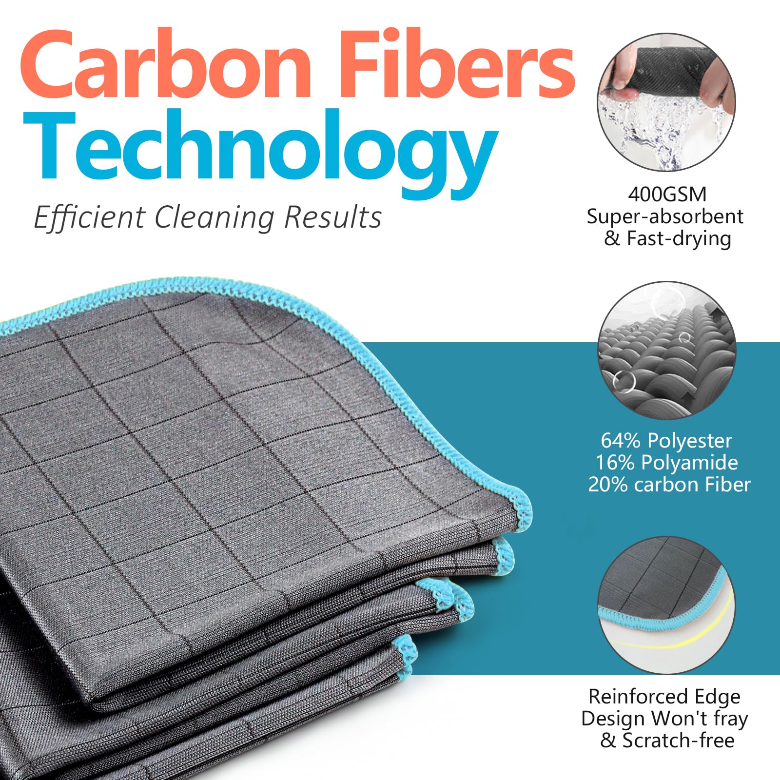 Carbon Fiber Technology: Our streak - free miracle cleaning cloth, made of fabrics up to 400 GSM thickness and incorporating carbon fibers with high tensile strength and dimensional stability, is more absorbent and durable