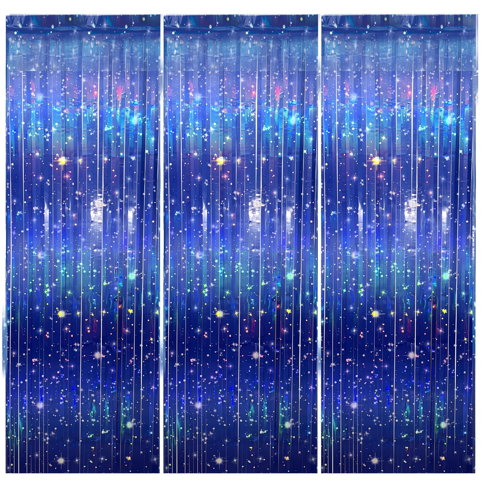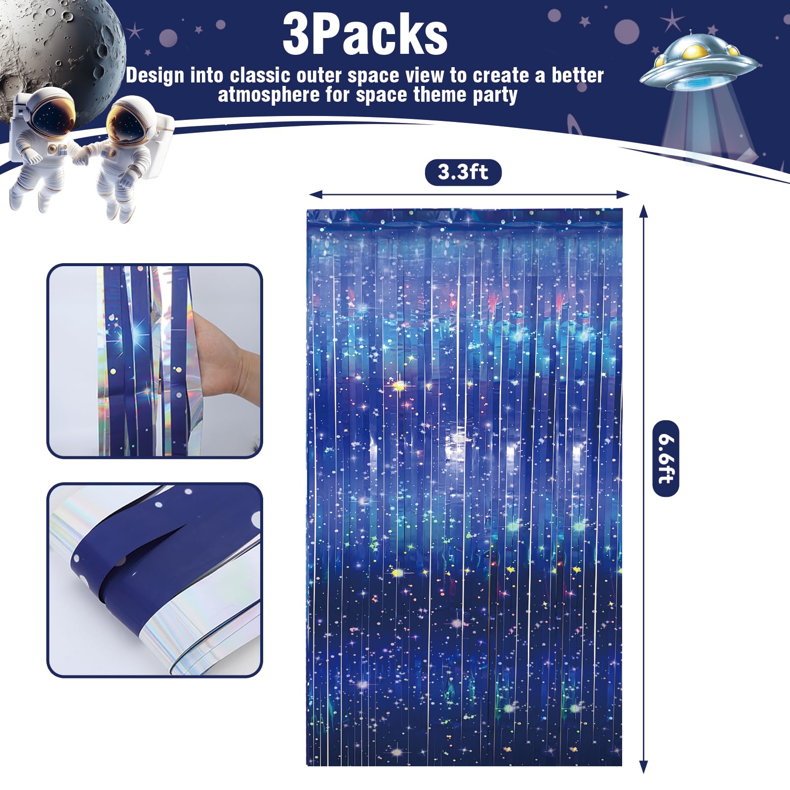 Iridescent Galaxy Look – space foil fringe curtains: 3-pack 3.3 x 6.6 ft curtains create a dreamy night‑sky and nebula effect; thicker foil (total 7 oz) delivers fuller drape and better shine for galaxy backdrop and outer space party decorations