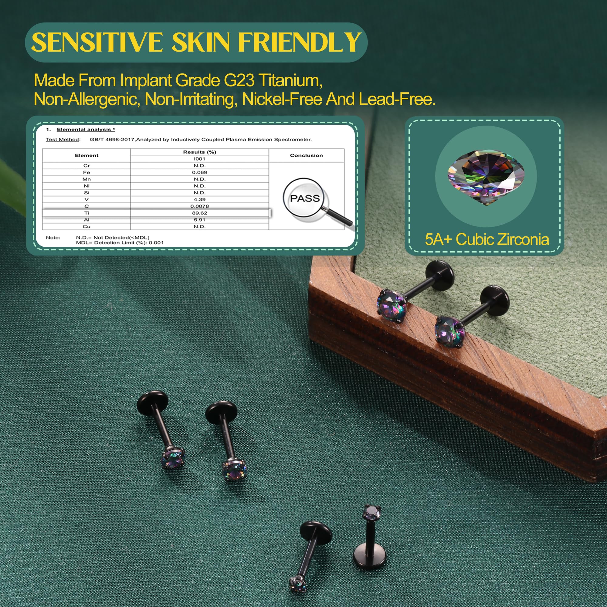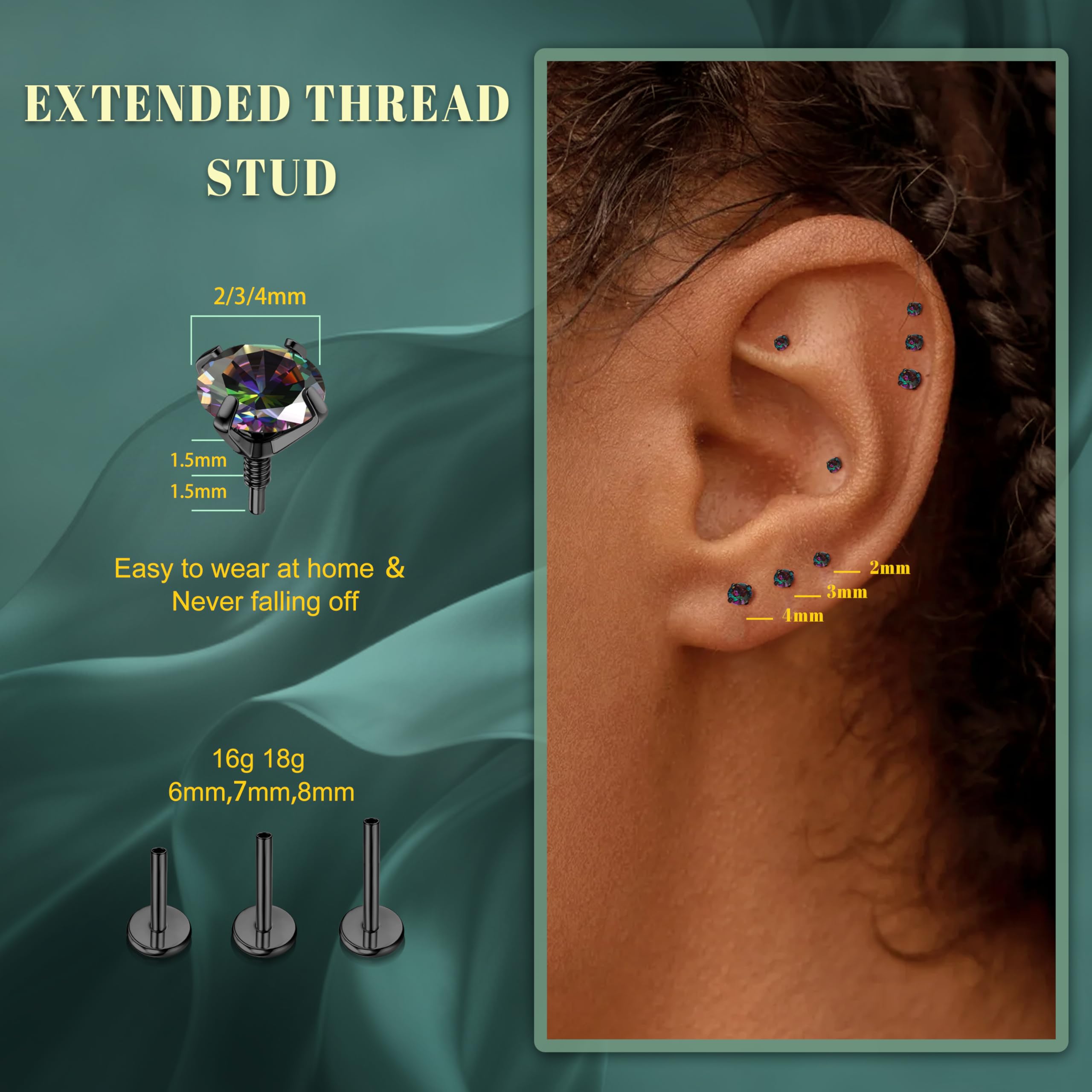 Details of Dainty Flat Back Earrings Studs Set : These flat back stud earrings are made of G23 titanium and AAAAA+ cublic zirconic, includes 3 pairs posts (bar Length: 6mm 7mm 8mm), 3 pairs different size of thread top(top size: 2mm 3mm 4mm), 1 pc piercing taper insertion pin, and post thickness: 18G (1.0mm)
