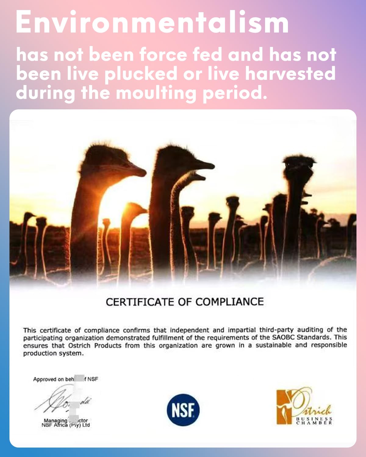Material: Natural ostrich feathers , each one is naturally dropped from the ostrich. It has been cleaned and disinfected by a special process and is very soft. Safe and no odor.