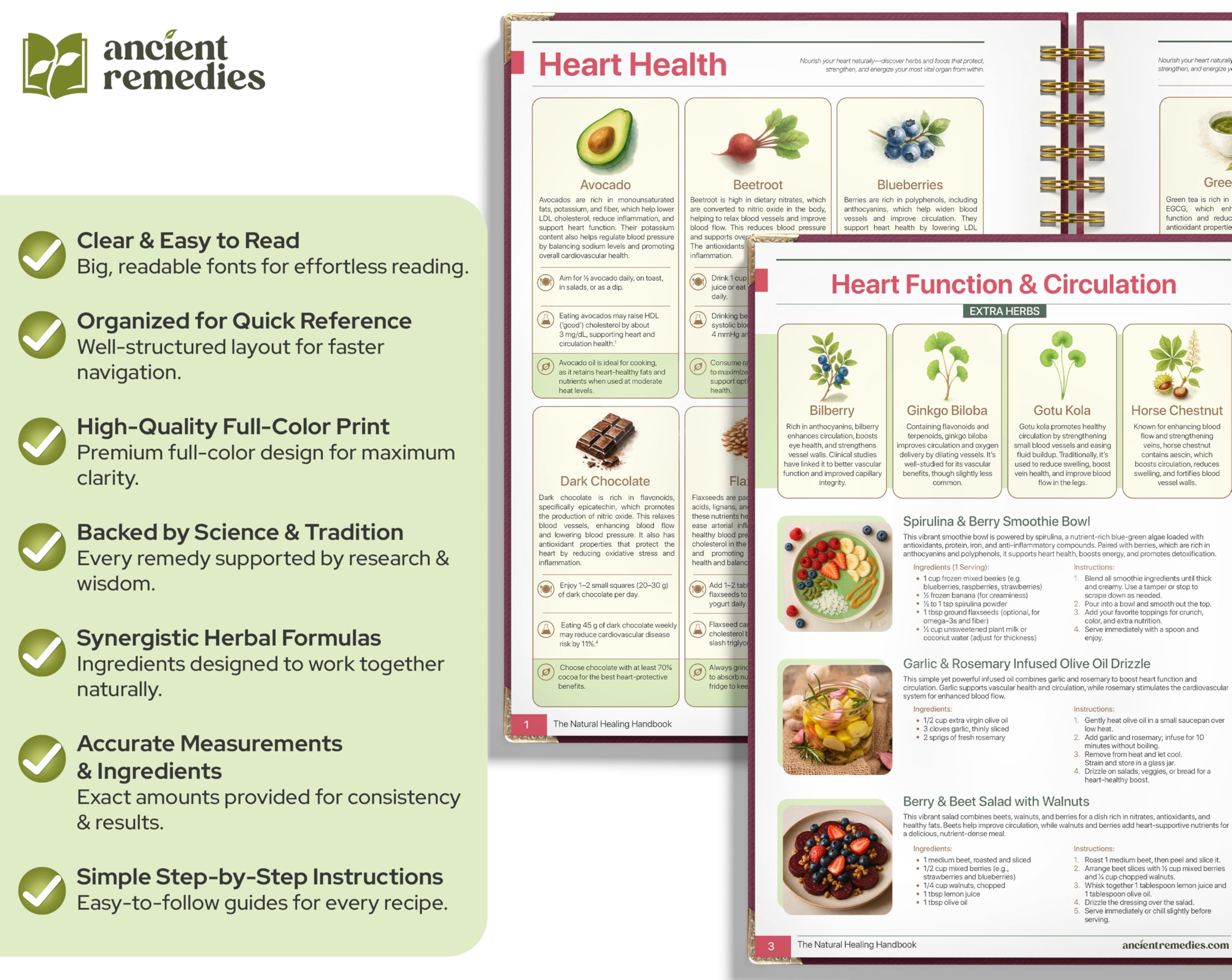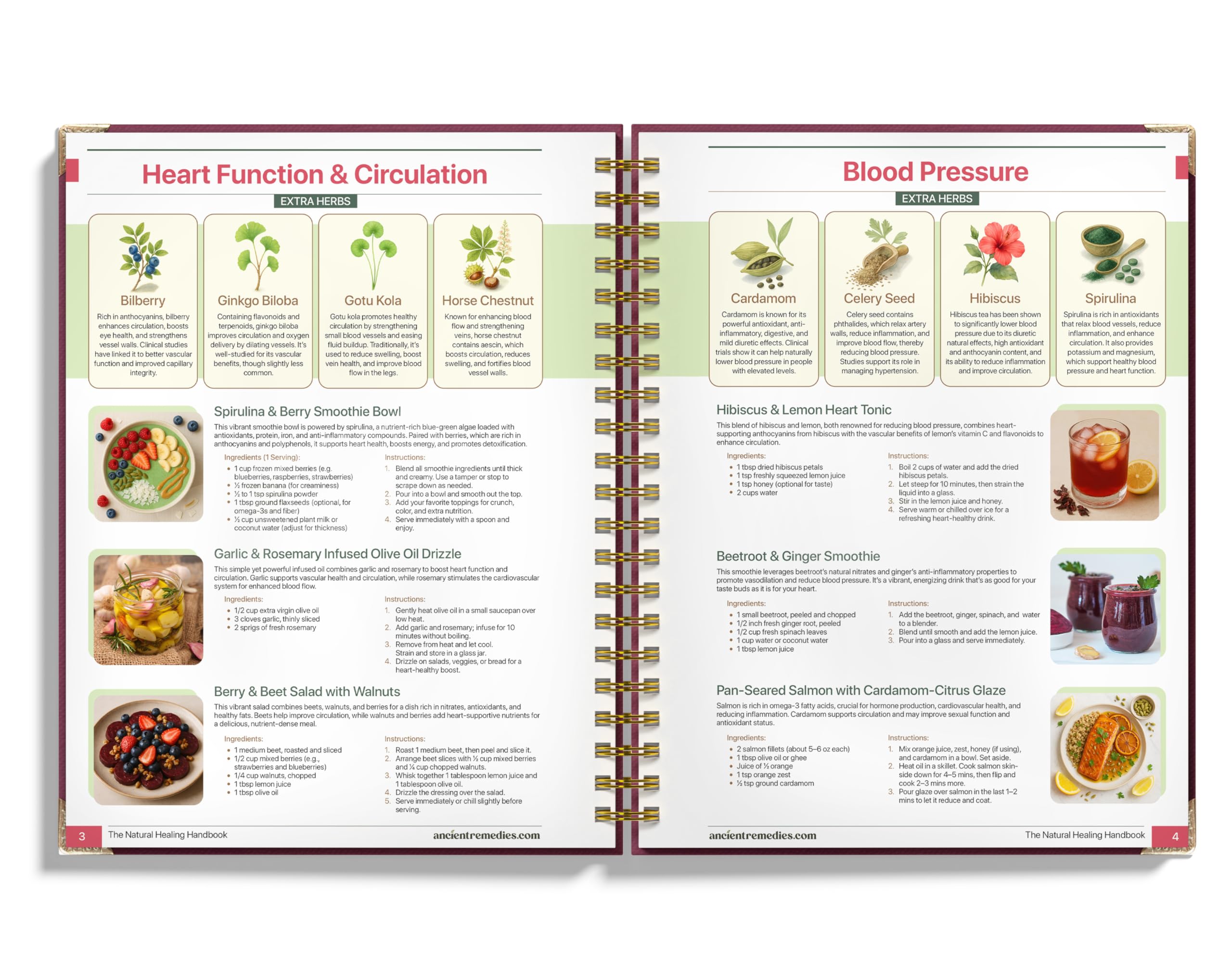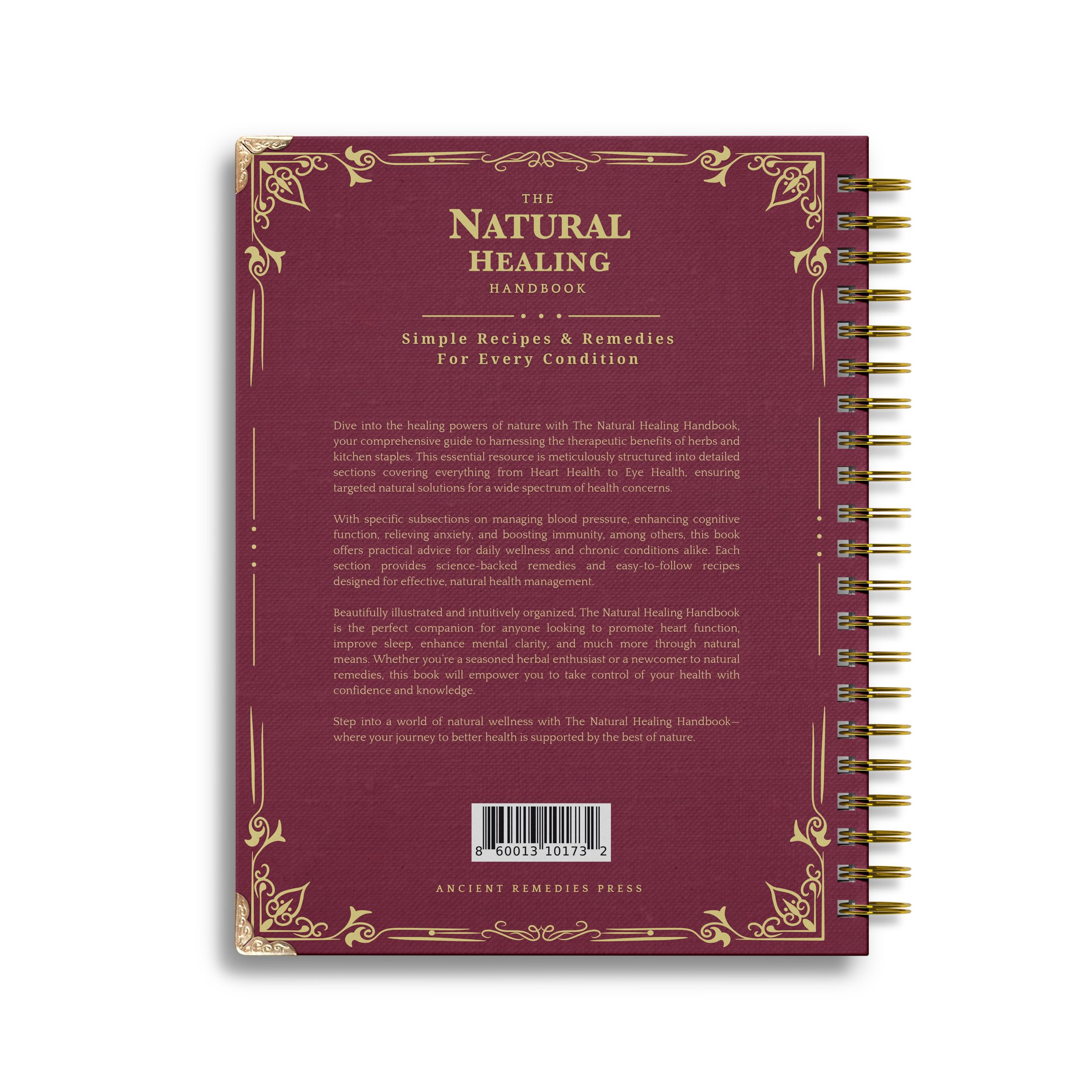 Inside this Natural Healing Handbook, you’ll uncover simple yet powerful remedies and wellness protocols designed to support your body naturally, without confusion, guesswork, or overwhelming steps. Each section guides you through herbal recipes, foods, and lifestyle practices that you can easily apply in your daily routine… morning, afternoon, and evening… so you can target your health concerns from every angle and feel real results! What You’ll Discover Inside: Over 75 pages of natural wisdom laid out in a beautifully designed spiral-bound format, making it easy to follow along while you prepare your remedies. Dedicated sections for major health concerns including heart health, blood sugar management, focus enhancement, and blood pressure balance. Step-by-step herbal recipes for teas, tinctures, and natural solutions—with clear instructions and complete ingredient lists. Traditional uses of herbs explained in plain language, so you’ll always know why you’re taking each remedy and what it’s doing for your body. Color-coded chapters and a highly organized structure that make it quick and effortless to find exactly the remedy you need. Flat-lay spiral binding, so your handbook stays open on the counter while you prepare remedies in your kitchen. A beautiful burgundy cover with botanical illustrations that makes this both a practical reference and a keepsake you’ll treasure. This is not just another scattered collection of recipes. It’s a complete, structured guide that blends ancient plant wisdom with practical modern wellness practices, giving you actionable steps you can use right away to support your body naturally. Discover the power of herbs, restore balance to your body, and bring the wisdom of natural remedies into your everyday life. So, if you’re ready to embrace natural healing and create lasting wellness at home, this is the guide you’ll want by your side!