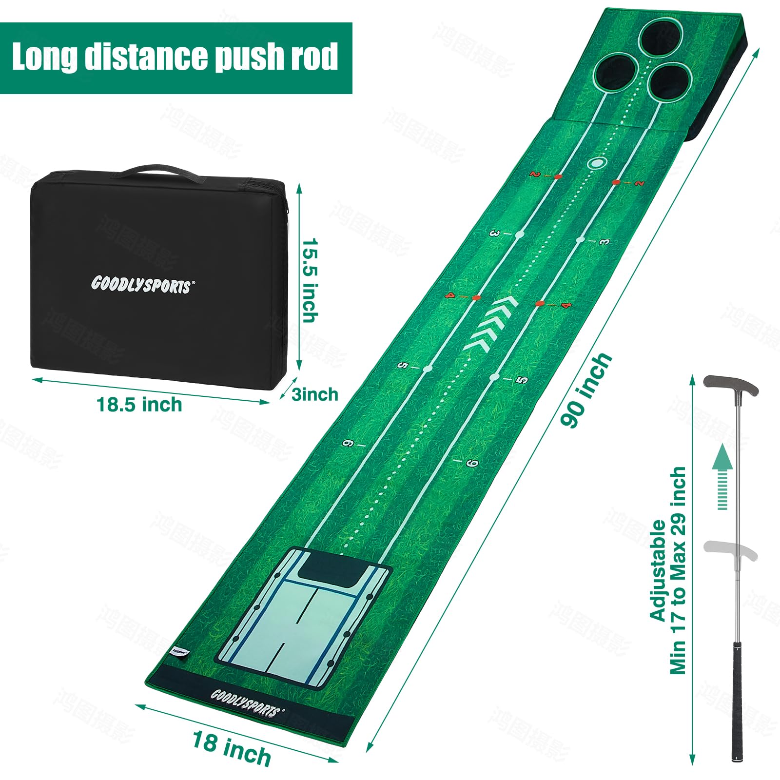 Putting Green Includes: This putting green indoor includes 1 x retractable push rod (can be put in carry bag), 3 x real golf balls, 1 x uniquely designed carry bag, 1x golf putting mat. This golf mats practice outdoor includes all needed golf accessories
