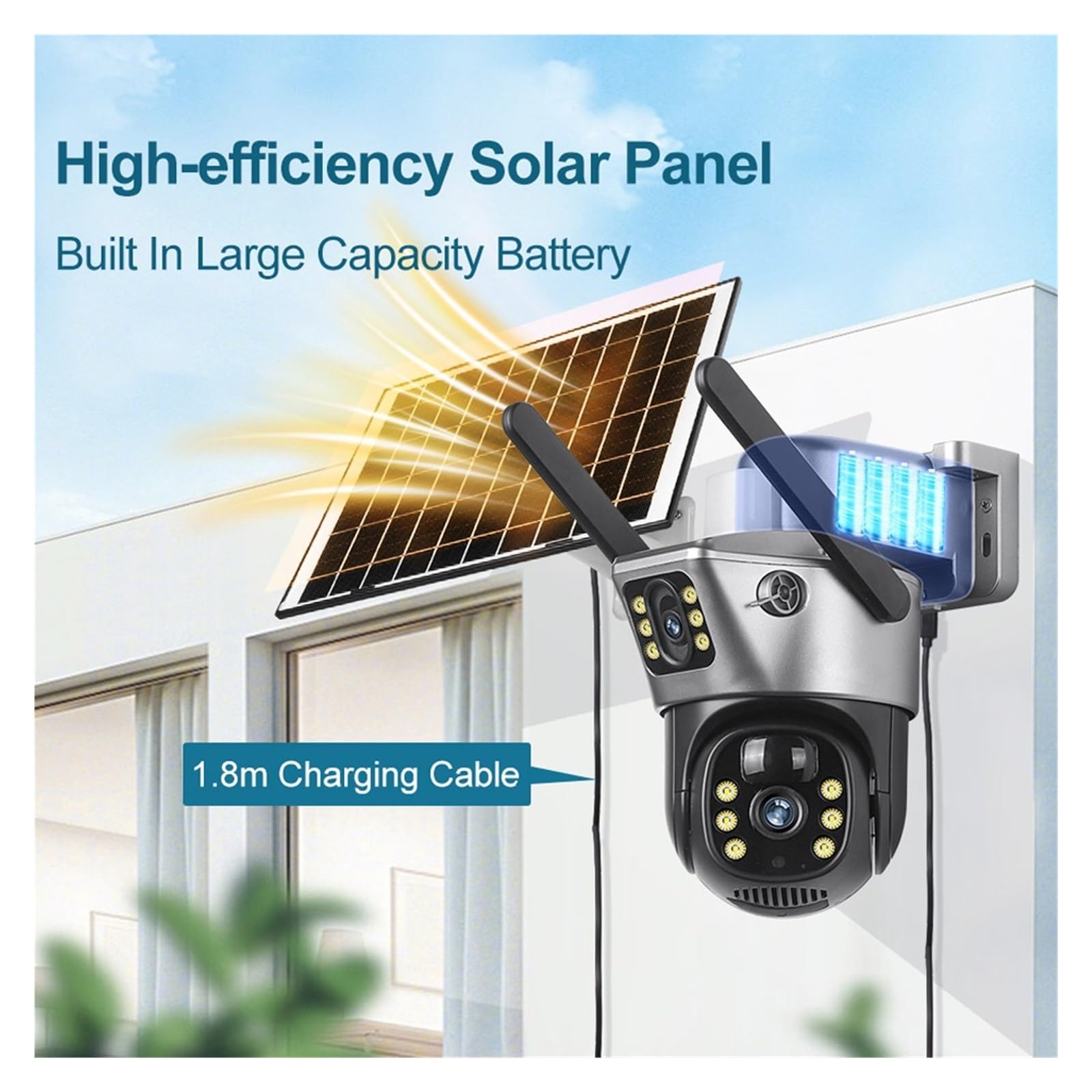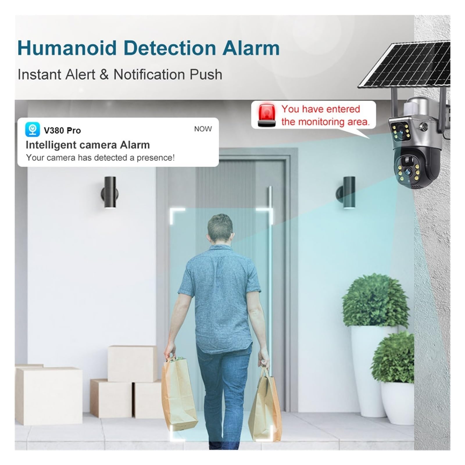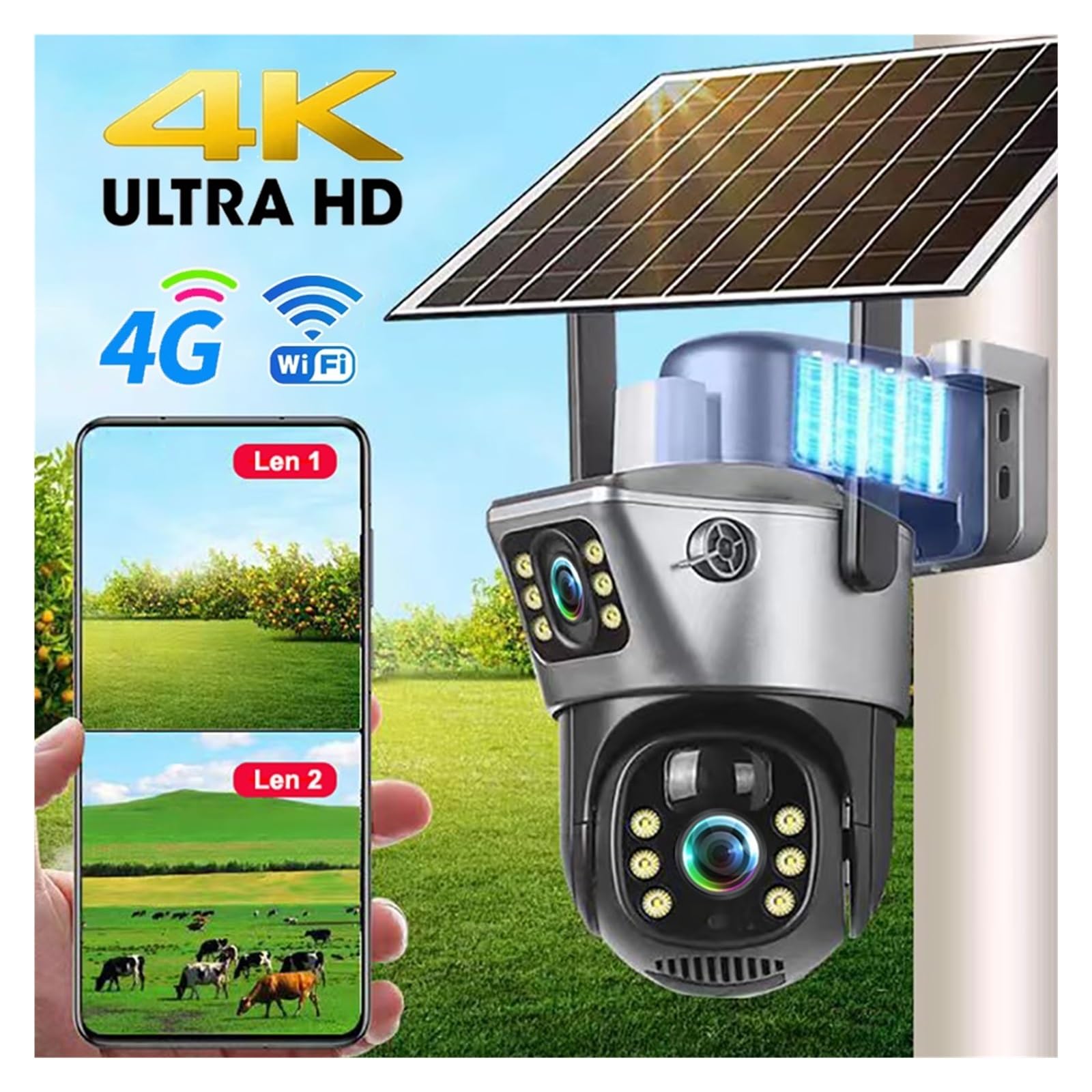 4K 8MP High Definition Dual Lens, Full Monitoring Details: As a high-performance V380 Pro 4K Security Camera, it is equipped with 4K 8MP high-definition sensors and Dual Lens Solar WiFi Camera dual lens design, which balances panoramic monitoring and local detail capture. The image quality is delicate and transparent, and can clearly recognize key information such as people's faces and license plates, completely solving the pain points of blurry outdoor monitoring image quality and unclear details. It is suitable for various home and commercial monitoring needs.