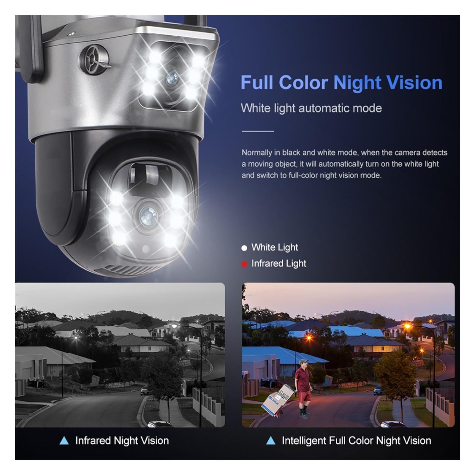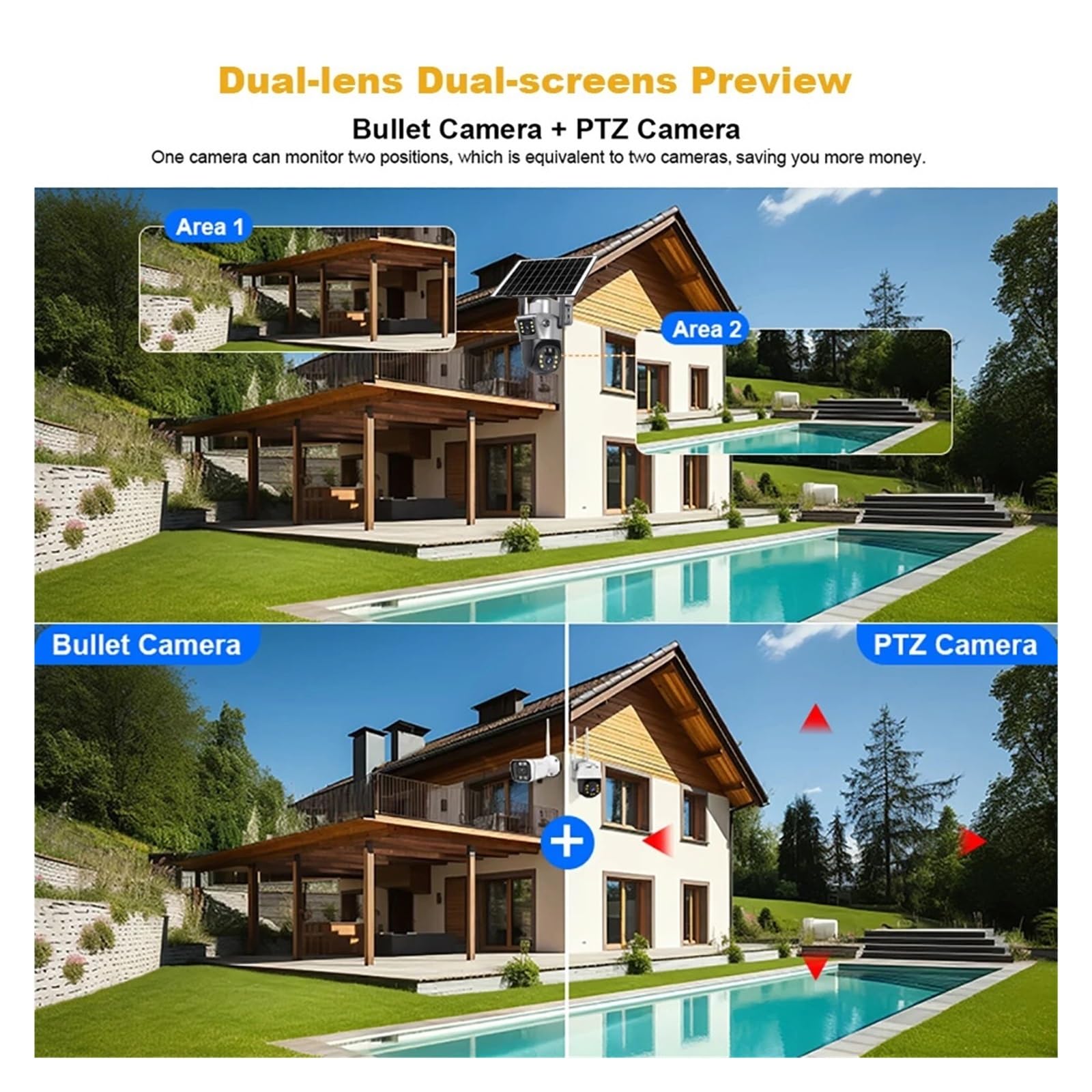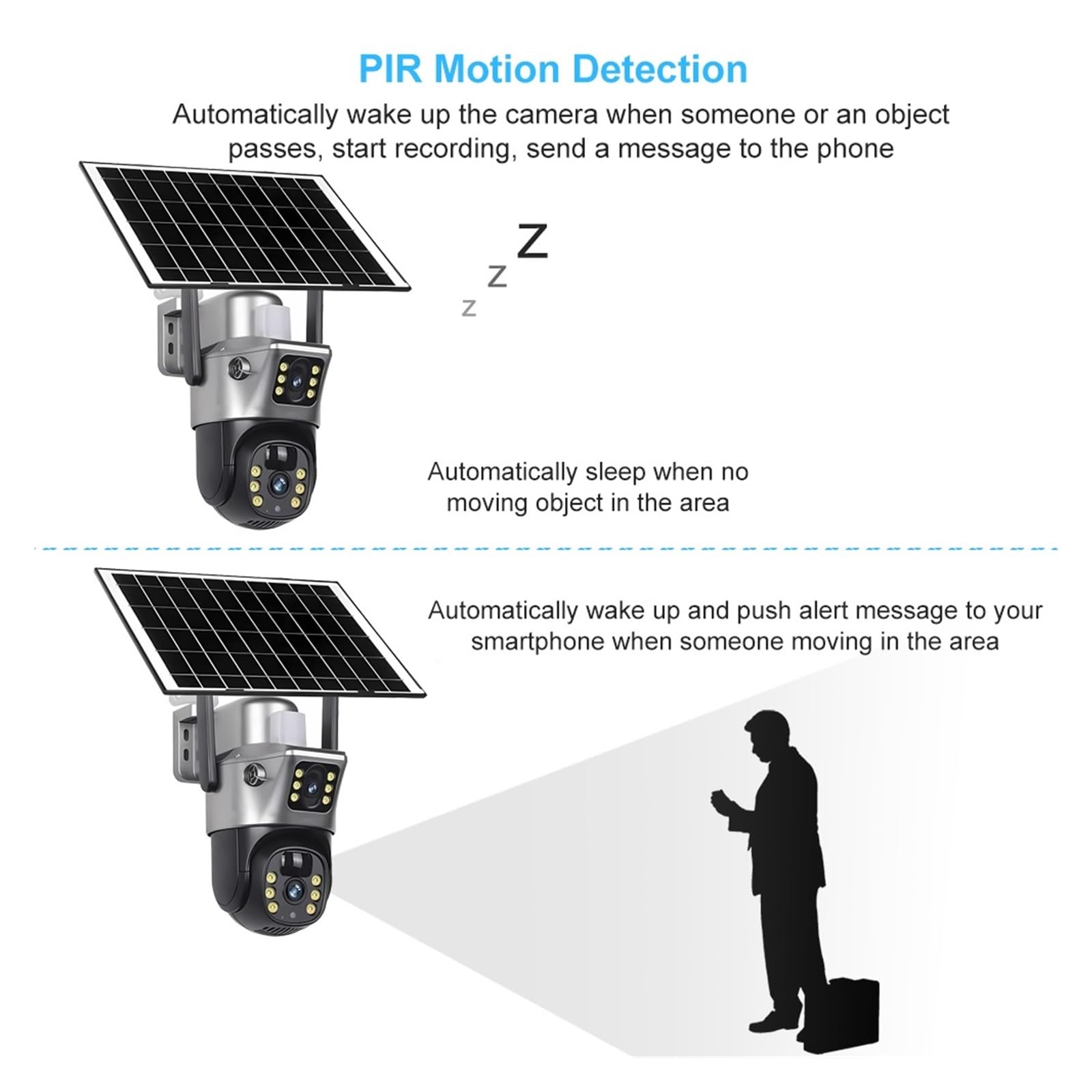 4K 8MP High Definition Dual Lens, Full Monitoring Details: As a high-performance V380 Pro 4K Security Camera, it is equipped with 4K 8MP high-definition sensors and Dual Lens Solar WiFi Camera dual lens design, which balances panoramic monitoring and local detail capture. The image quality is delicate and transparent, and can clearly recognize key information such as people's faces and license plates, completely solving the pain points of blurry outdoor monitoring image quality and unclear details. It is suitable for various home and commercial monitoring needs.