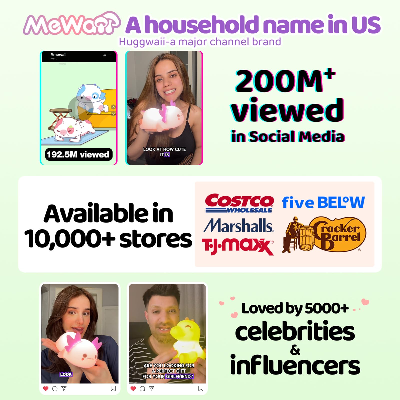 💚Upgrade Axolotl Design: Huggwaii, a major channel brand of Mewaii, is proud to introduce the 2025 upgraded big-eye axolotl lamp. This squishy axolotl night light for kids stands out from the other kids night lights with its upgraded big-eye design, kawaii shape, and warm glow; its fresh and cute appearance is more attractive and creates a more charming atmosphere for any room. Compared to other axolotl night lights, our big-eyed axolotl night light for kids brings a touch of whimsy and security to the nursery, ready to help you chase away the shadows of the night and fill the room with a cozy atmosphere. Let this little axolotl lamp guard you and your family's beautiful dreams.
