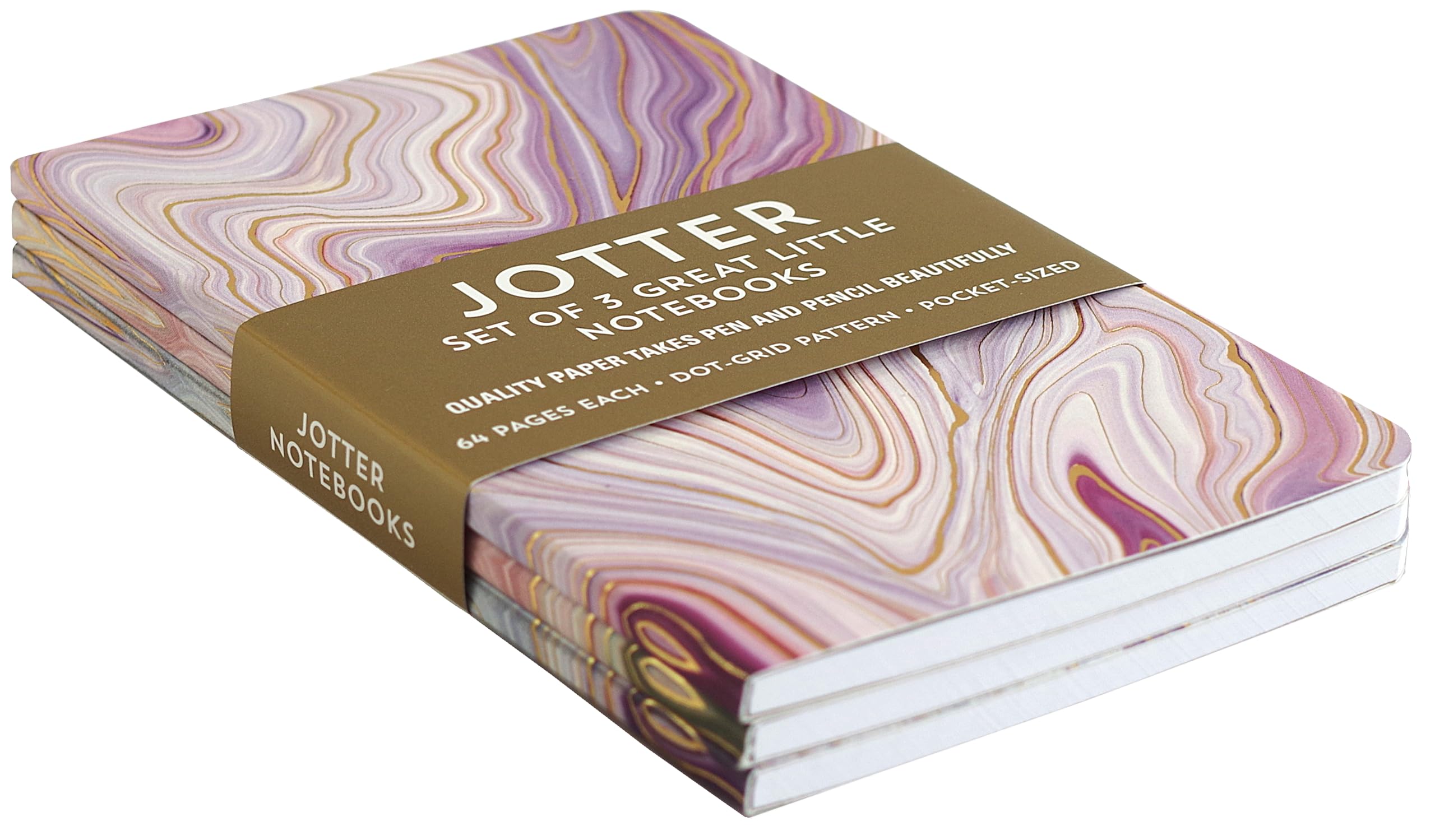 Set includes 3 mini notebooks in violet, blue, and coral agate. (Agate is a variegated form of quartz.)