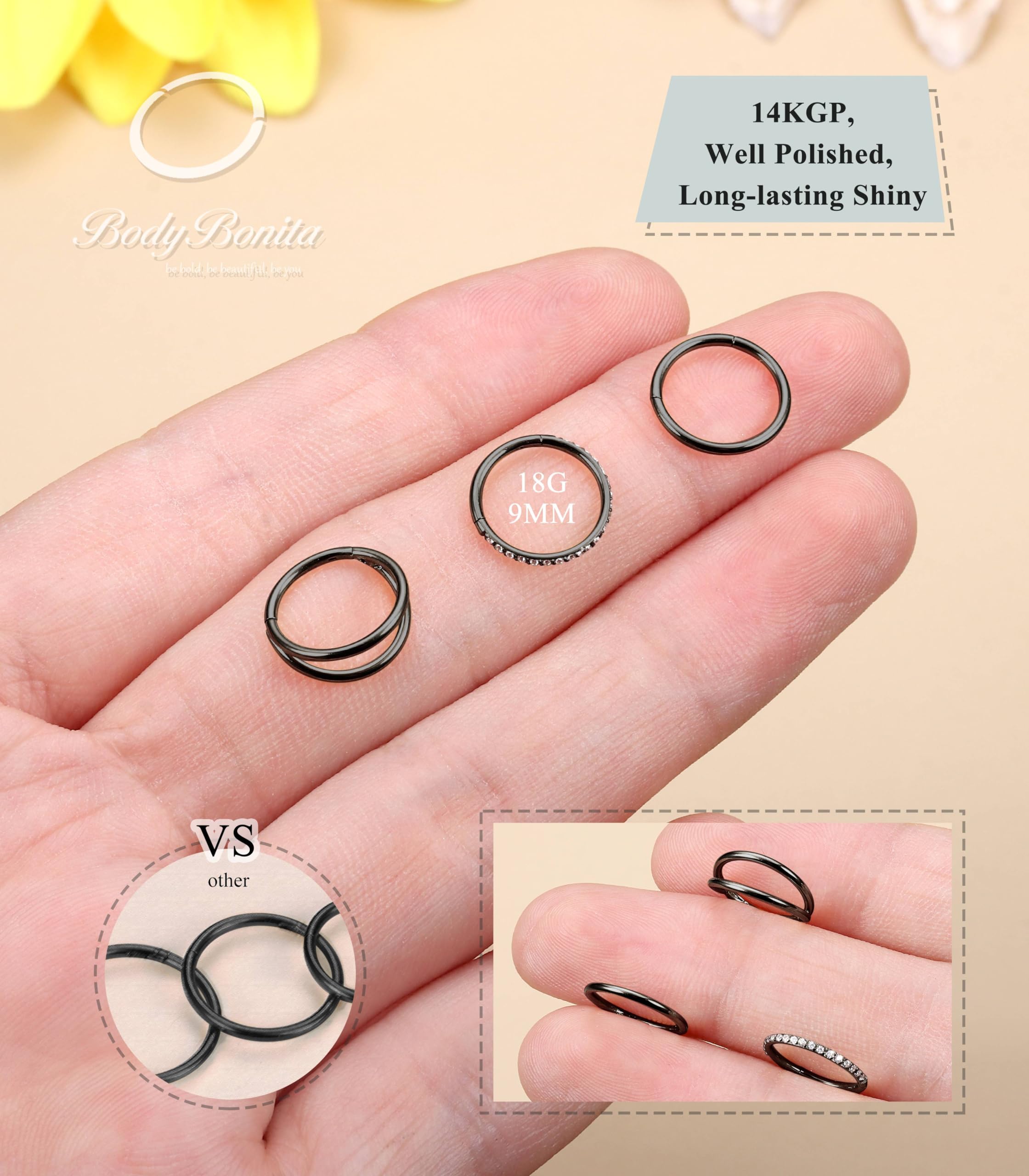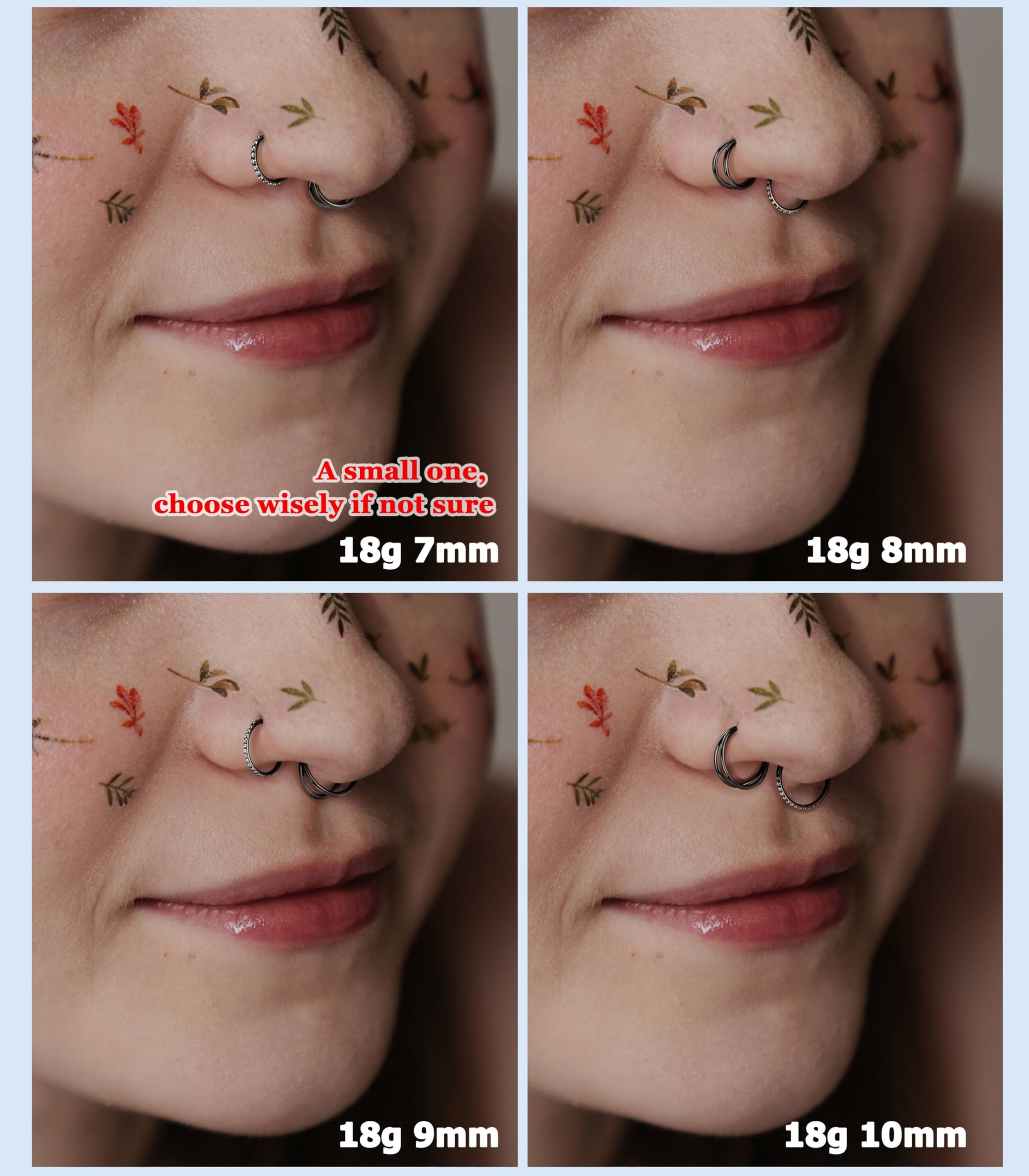 Seamless Black Plated Nose Ring Hoop: Gauge size: 18G(1.0mm); Inner diameter: 9mm(0.35 inches); Material: 316L stainless steel; One order includes 3 pieces of hinged segment ring, come in various styles to meet your fashion needs: sparkly CZ nose hoop, double hoop nose ring, dainty single septum hoop;We've provided the size comparison chart for your reference