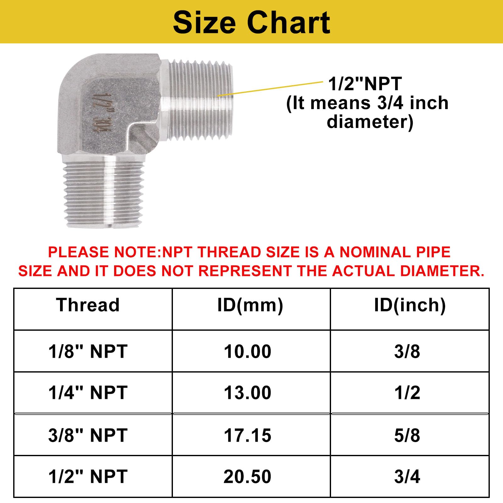 Package Content: 1 Pcs 1/4" NPT male thread 90 degree street elbow. This elbow fitting for connecting pipes or fittings with different end types. (NOTE: NPT thread size does not actual diameter, it is only nominal pipe size)