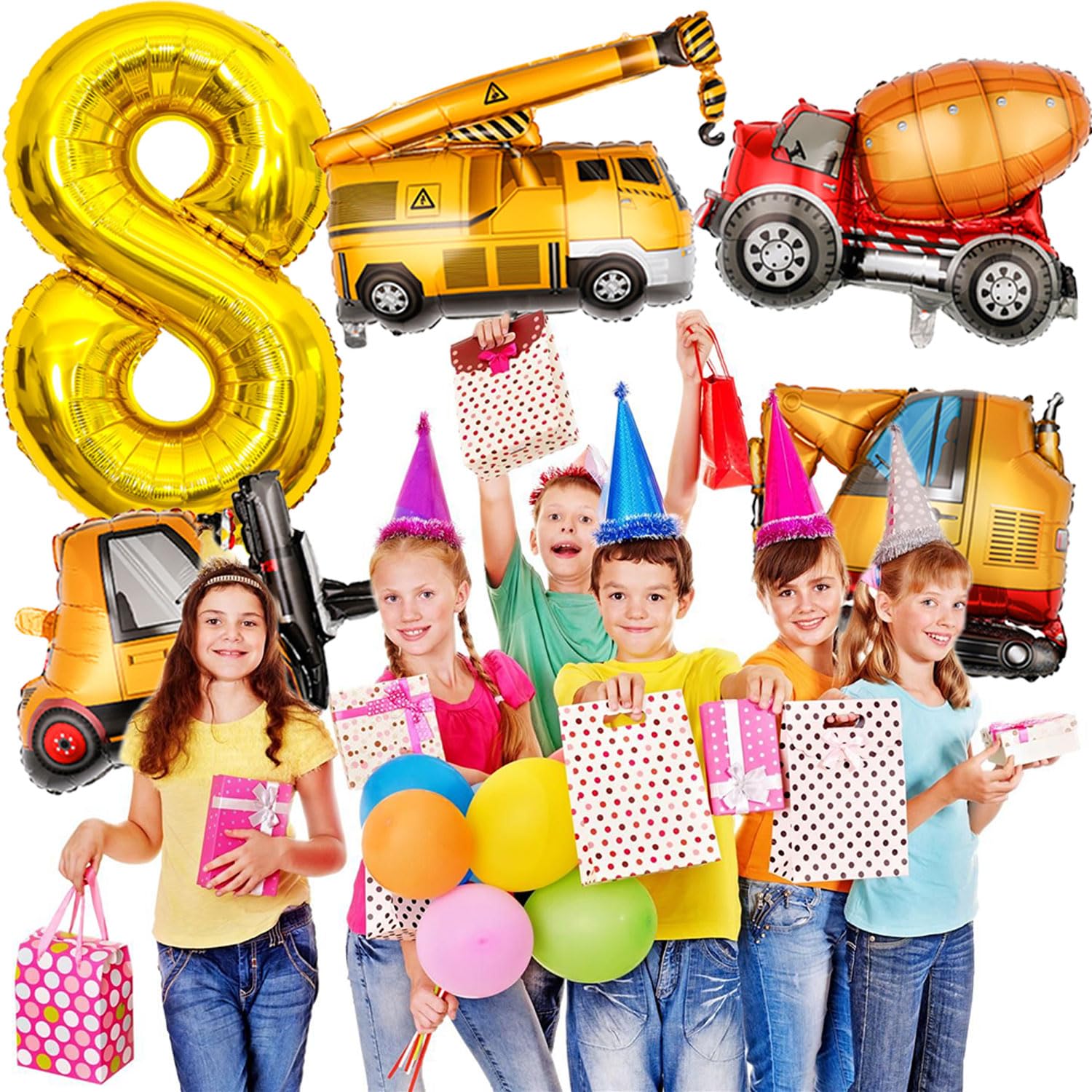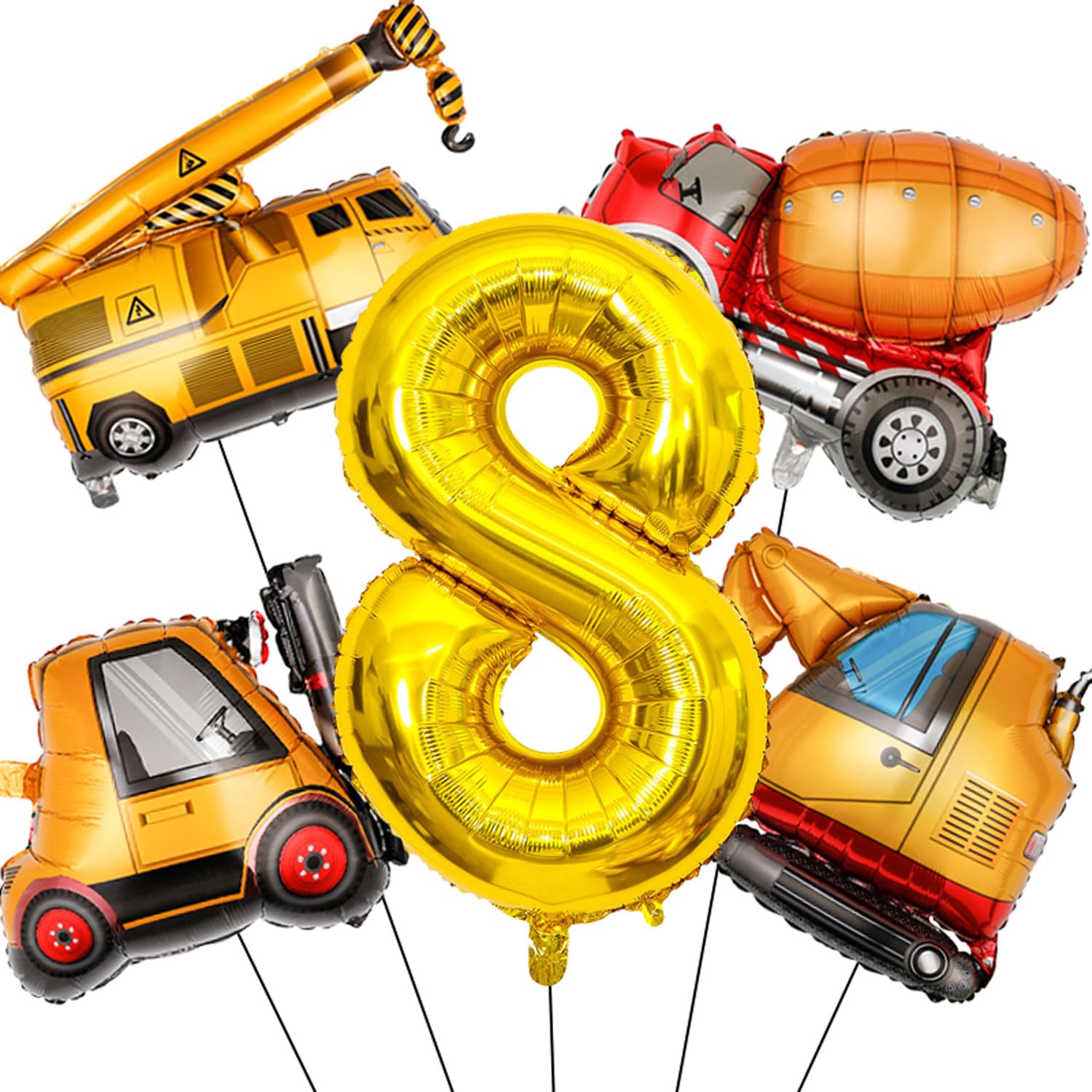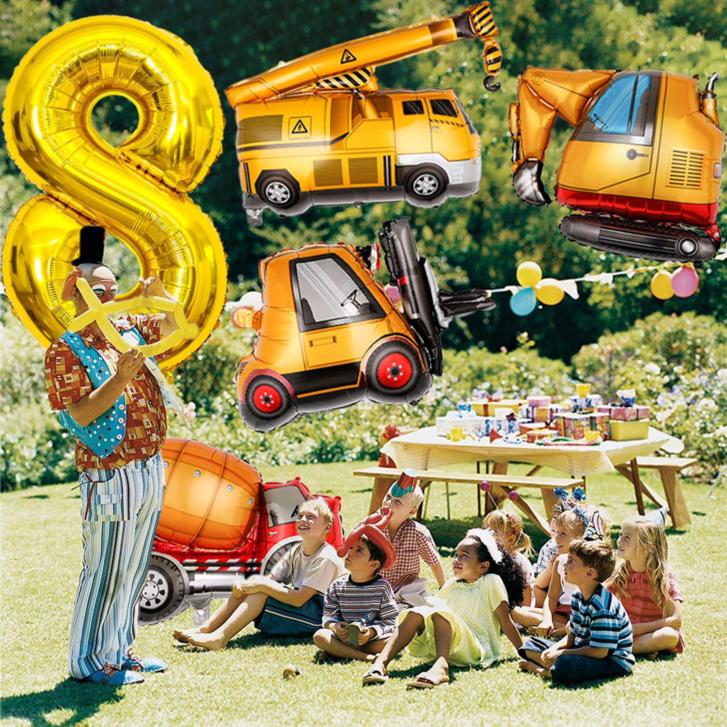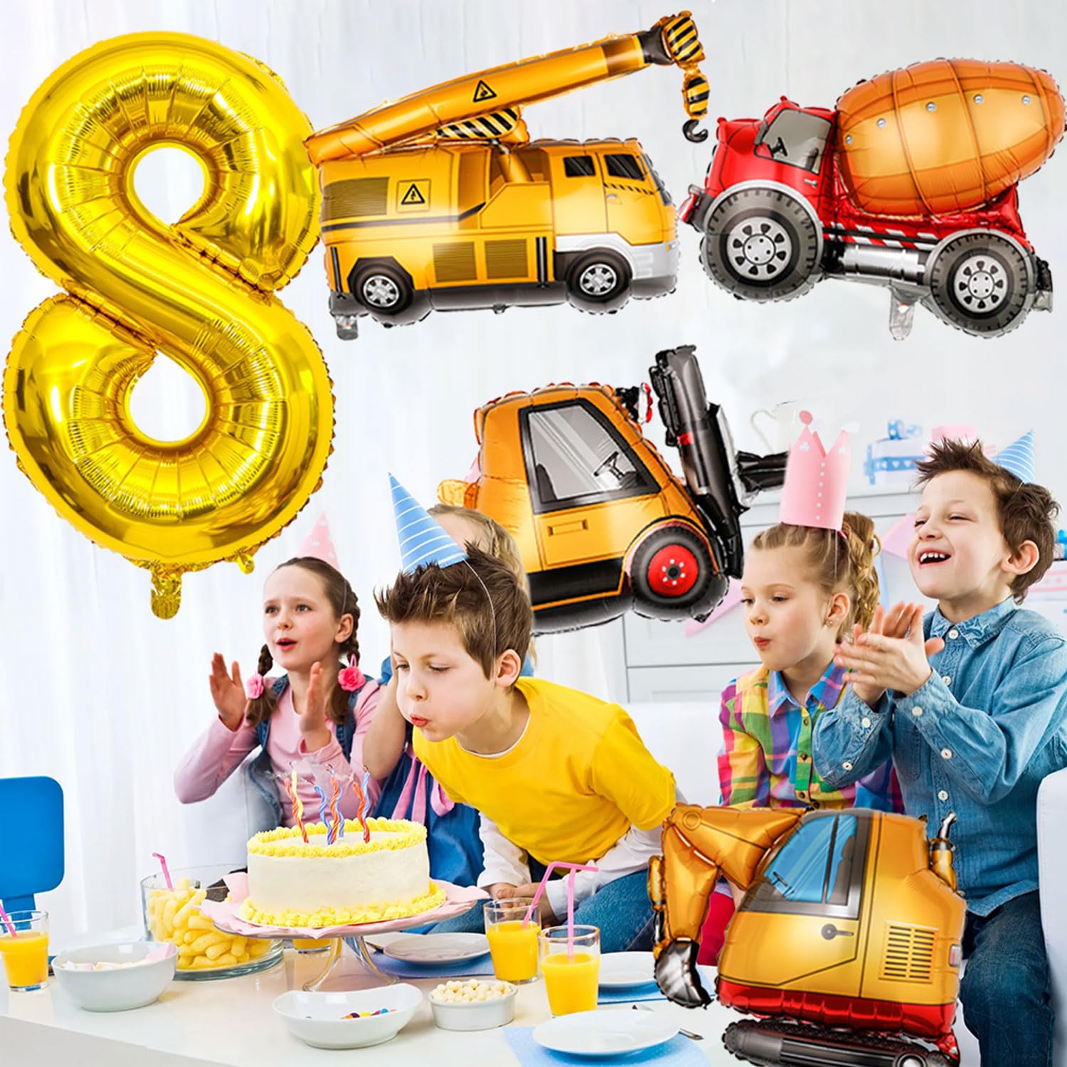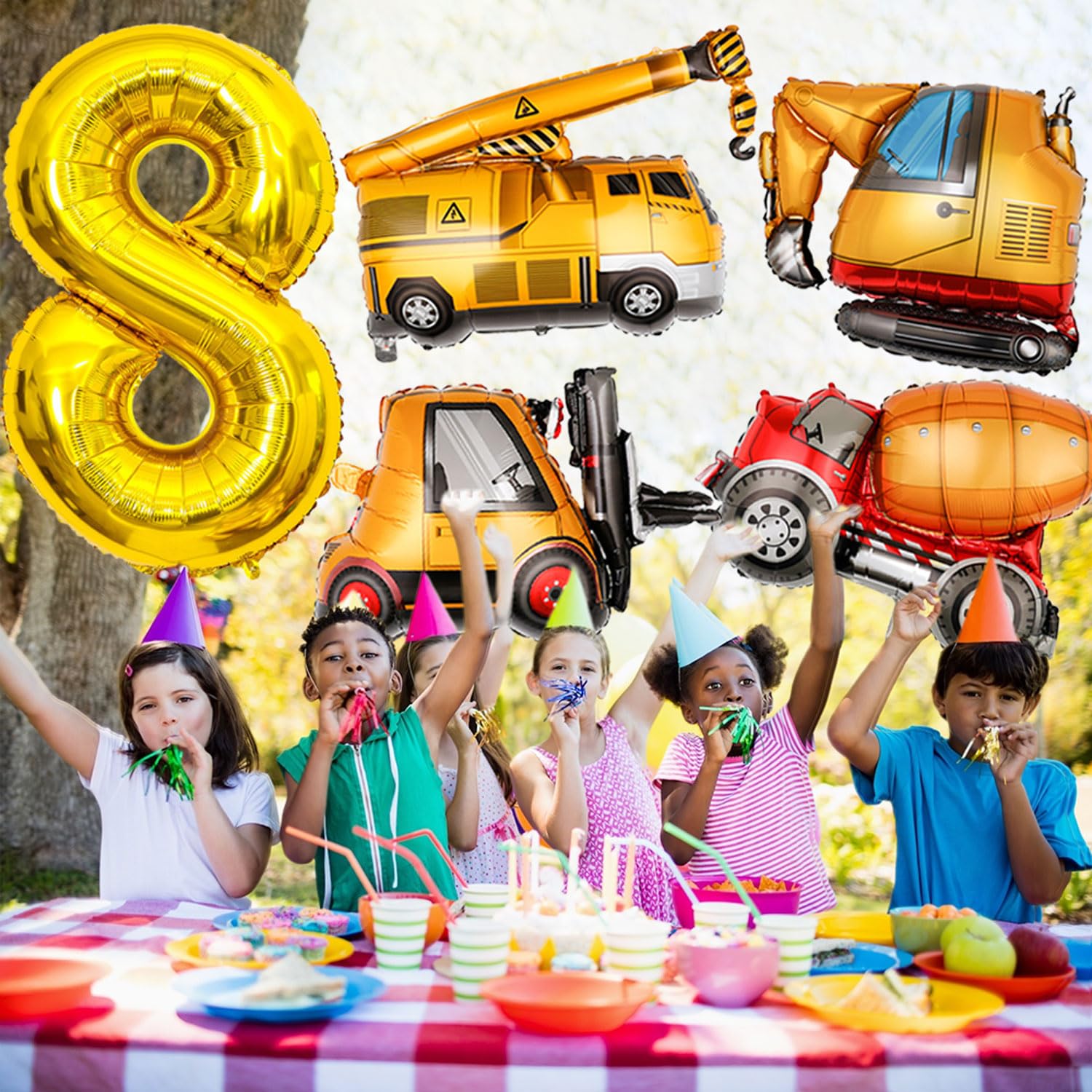 【8th Construction Party Decorations】Birthday Construction Balloons set include 1pcs 40inch gold balloon numbers 8,1pcs large foil excavator balloon, 1pcs mylar foil crane balloon, 1pc large foil forklift truck balloon,1pc large cementing truck foil balloon, 2pcs round foil happy birthday construction balloons, 1pc ribbon and straw.These construction balloons will make a cool construction themed birthday party for your boy.