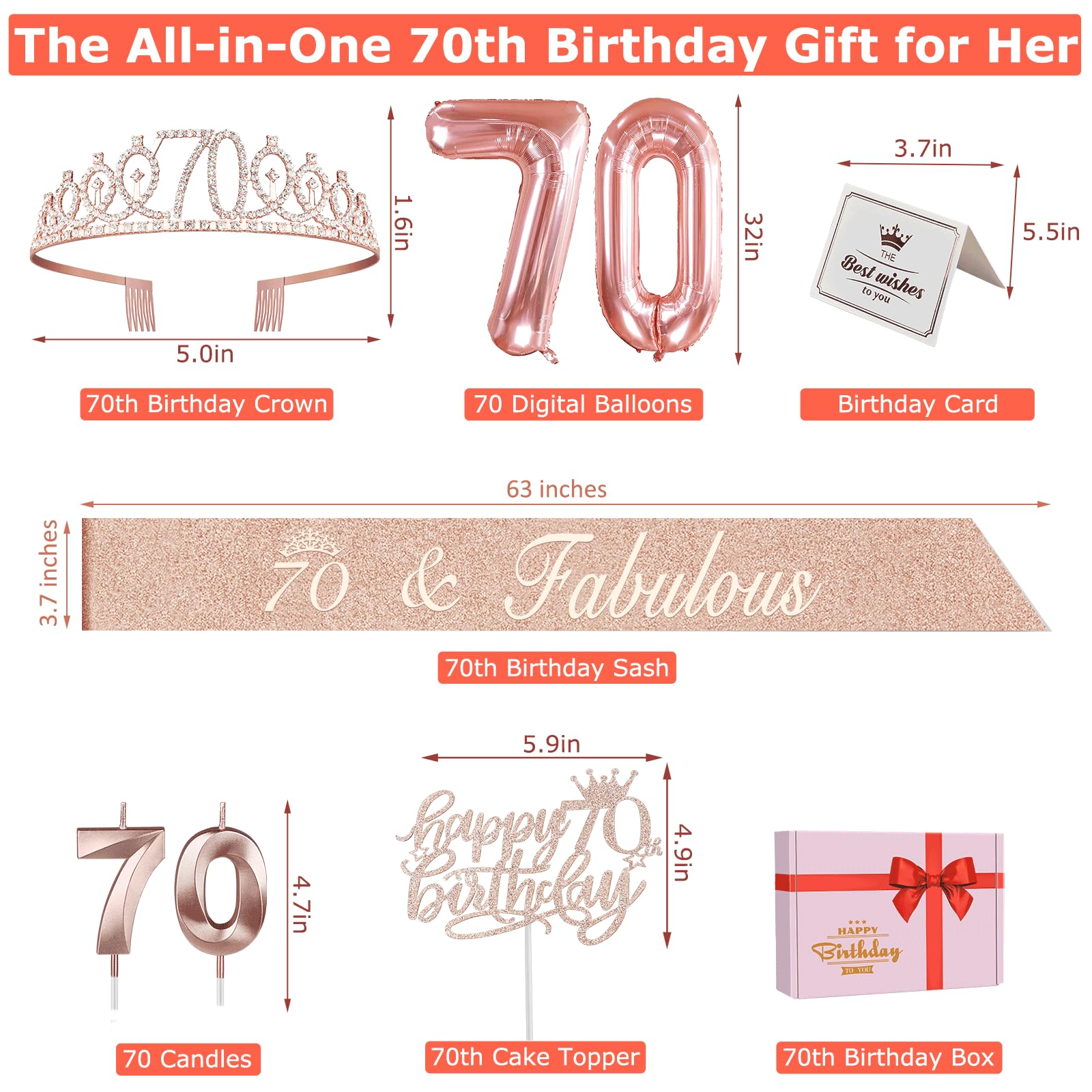 70th Birthday Decorations: Coming with 70th Birthday Tiara/Crown x 1pc, 70th Birthday Sash x 1pc, Happy 70th Birthday Cake Topper x 1pc, Number 70 Candles x 1set, Big Numeral 70 Balloons x 1 set, Birthday Card x 1pc. This great valuable rose gold 70th birthday gift box for women has been packed in a beautiful gift box for presentation