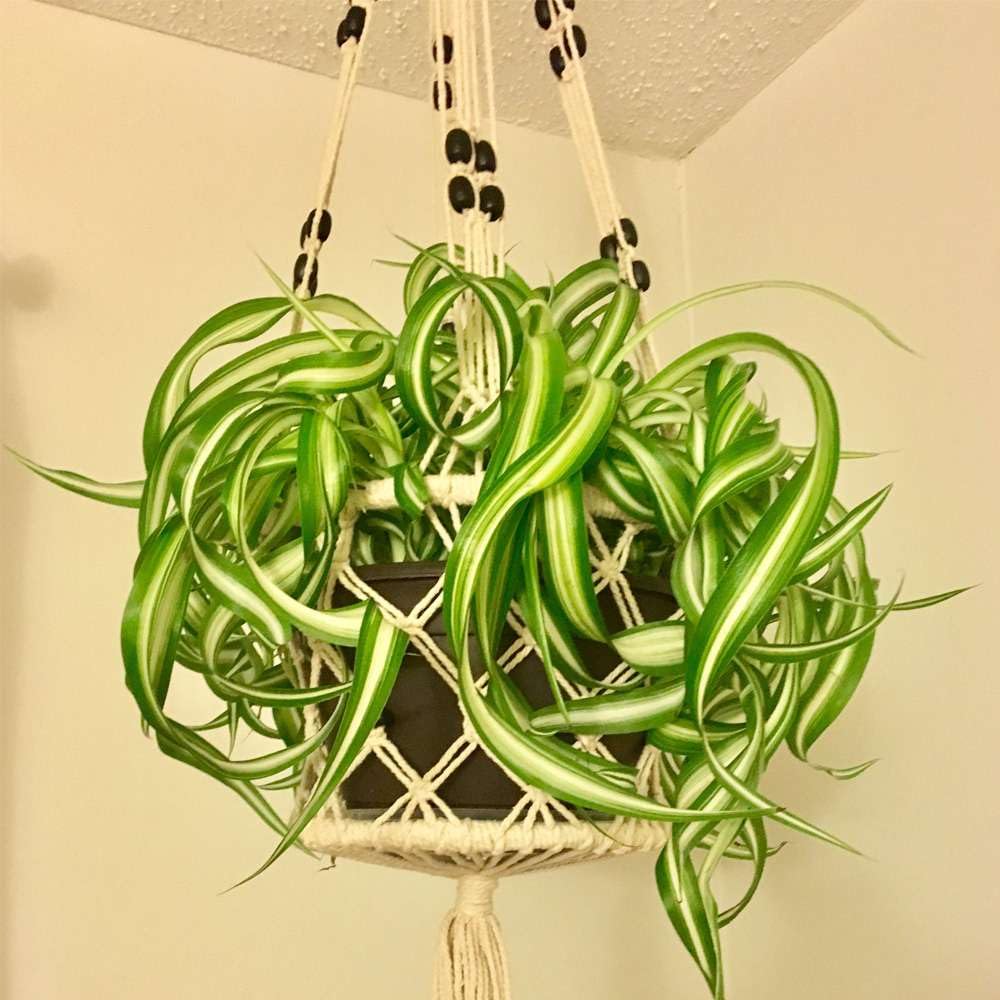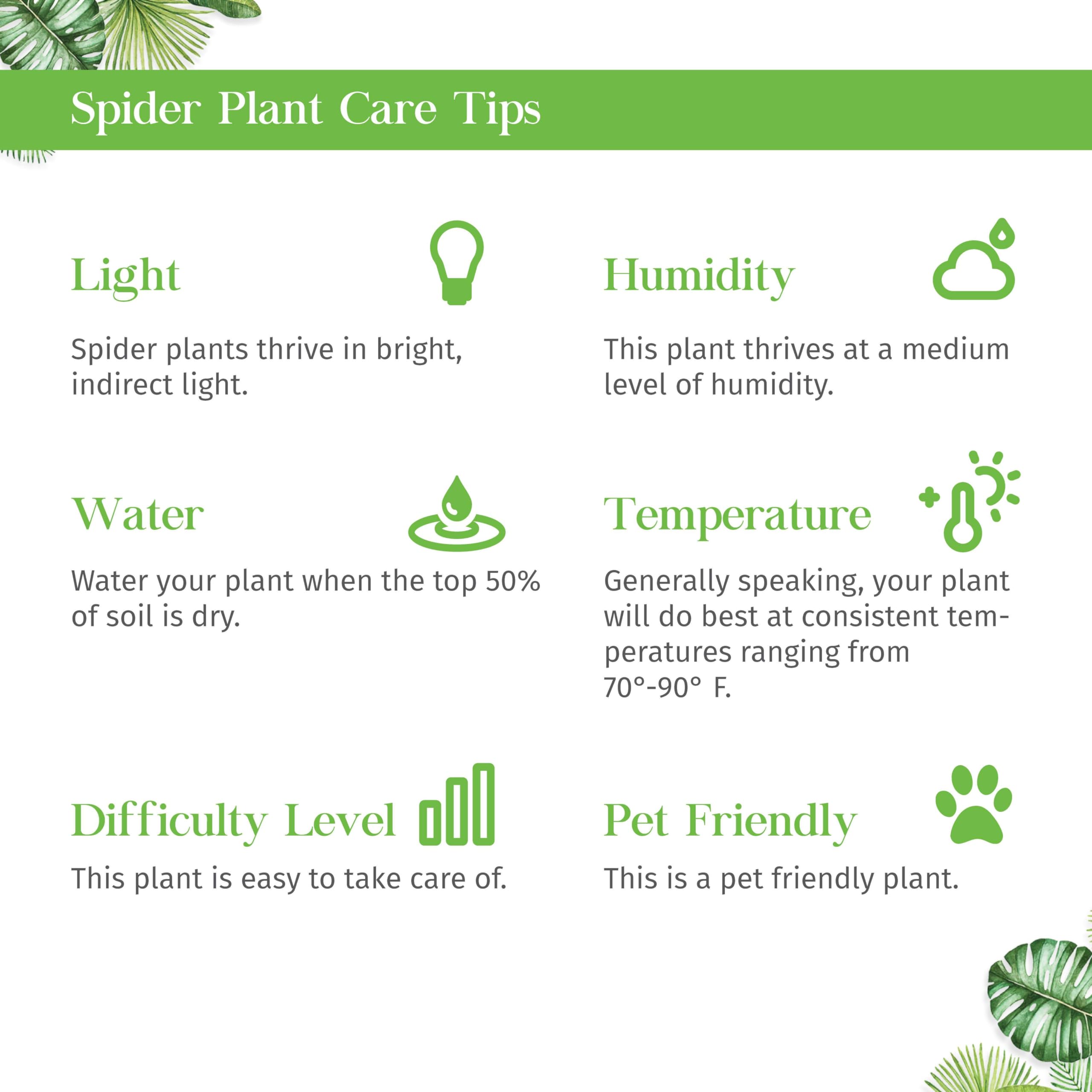 Spider ivy care! Too much blazing, direct sunlight can be detrimental and will tend to burn the leaves. Water your plant when the top 50% of soil is dry. Generally speaking, your plant will do best at consistent temperatures ranging from 70°-90° F. This plant is pet-friendly.