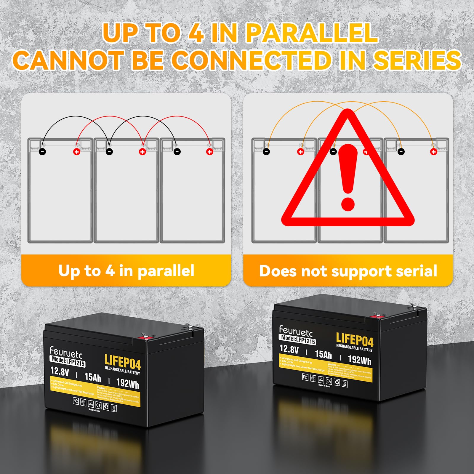 🏆【Deep Cycle】: 12V 15Ah batteries should not be connected in series or parallel. These batteries feature low self-discharge rates and efficient charge/discharge capabilities. While ensuring fast-charging convenience, 12V rechargeable batteries can be cycled 4,000 to 15,000 times, with a service life of up to 10 years.