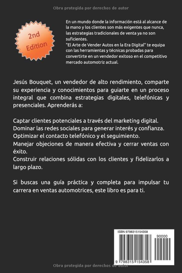 El Arte de Vender Autos en la Era Digital: Domina las Estrategias Digitales, Telefónicas y Presenciales para Convertirte en un Vendedor Exitoso Descripción del libro: ¿Estás listo para llevar tus habilidades de venta de autos al siguiente nivel? En "El Arte de Vender Autos en la Era Digital", Jesús Bouquet, un vendedor de autos de alto rendimiento, comparte las estrategias, técnicas y herramientas que lo llevaron al éxito en la competitiva industria automotriz. Este libro no es solo una guía teórica, sino un manual práctico basado en la experiencia real de Jesús, quien pasó de ser un vendedor más a convertirse en uno de los más destacados a nivel nacional. A través de un enfoque integral que combina técnicas digitales, telefónicas y presenciales, aprenderás a: Adaptarte al nuevo perfil del consumidor digital. Implementar una metodología estructurada para vender más. Captar clientes potenciales a través del marketing digital. Dominar Facebook Ads, Instagram Ads y el retargeting. Optimizar el contacto telefónico y el seguimiento. Manejar objeciones de manera efectiva. Preparar la entrega del vehículo para una experiencia memorable. Fidelizar clientes y convertirlos en promotores de tu marca. Desarrollar la mentalidad de un vendedor exitoso. Construir una carrera profesional en ventas. Si eres un vendedor experimentado en busca de nuevas estrategias, un gerente de ventas que quiere mejorar el rendimiento de su equipo o alguien que está dando sus primeros pasos en la industria automotriz, este libro te brindará las herramientas que necesitas para alcanzar el éxito en la era digital. ¡No esperes más! "El Arte de Vender Autos en la Era Digital" y comienza a transformar tu carrera hoy mismo.