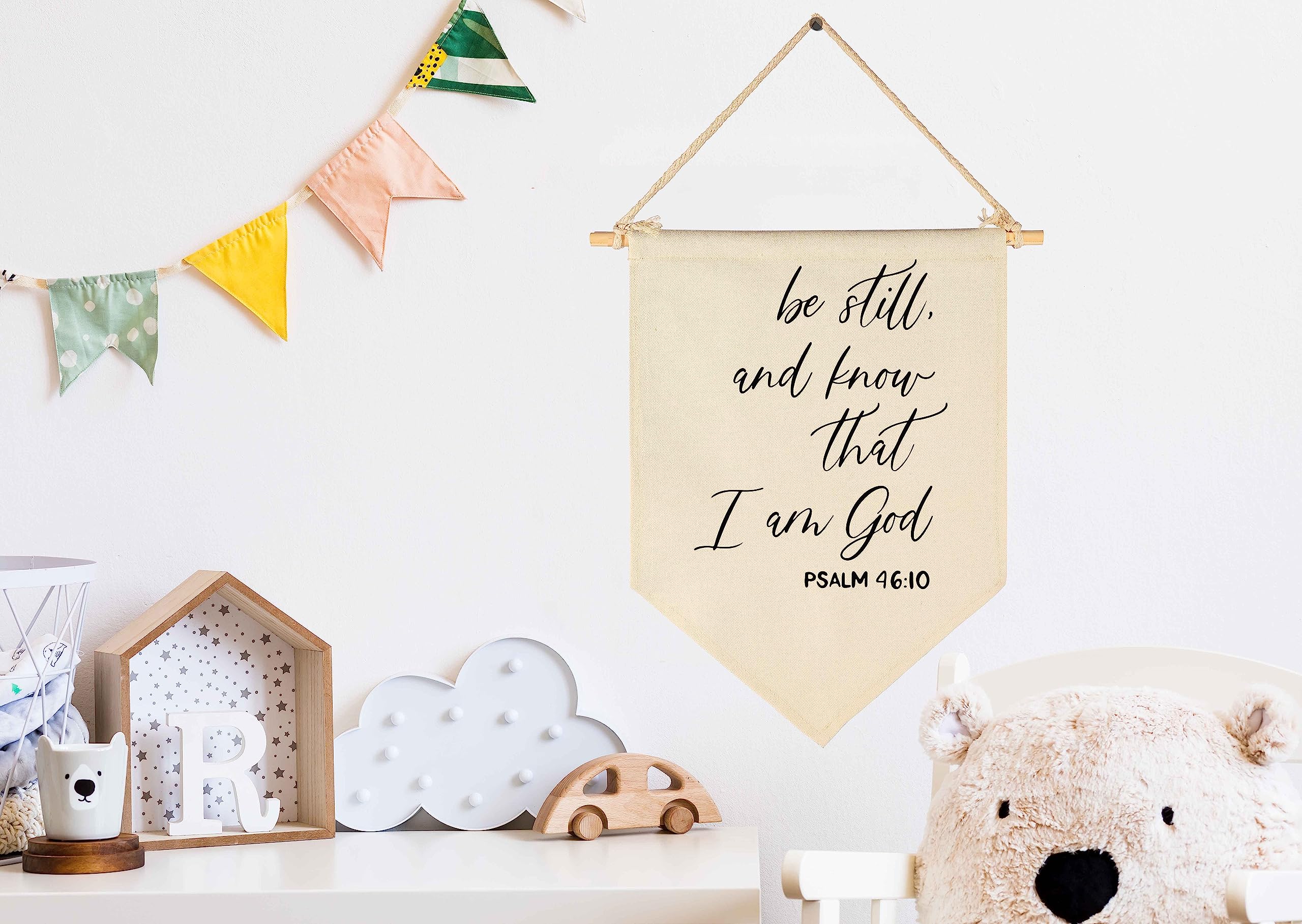 Crafted from natural cotton canvas, this 15.4 x 11 inch nursery wall banner brings a soft and calming touch to baby room, above crib or toddler space. The durable fabric keeps its shape with a natural texture, while the clear print stays bright with everyday use. Lightweight and easy to hang, it comes with a wooden dowel and pre-tied twine for quick setup on walls, doors or shelves. The versatile size fits small spaces without feeling crowded, making it perfect for creating a cozy nursery atmosphere. A thoughtful gift for baby showers, newborn arrival or first birthday.