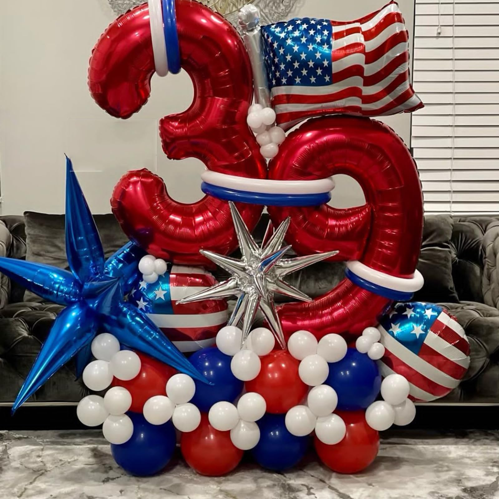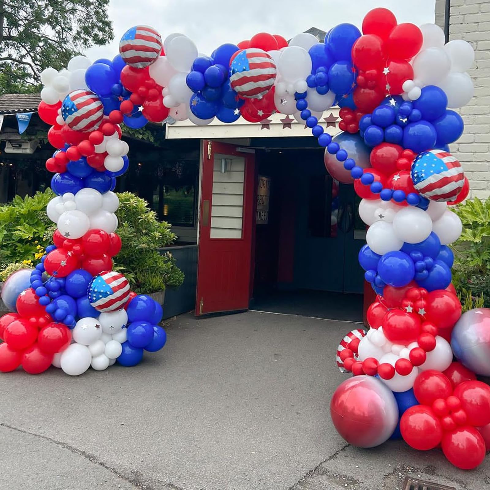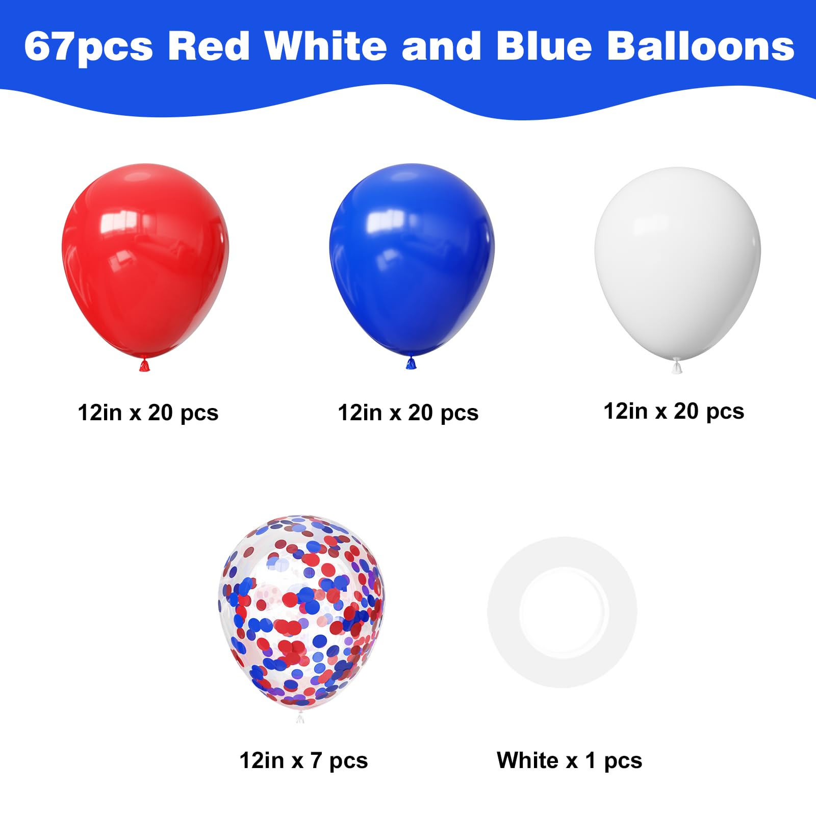 {All-in-One Kit} This red blue and white balloon kit includes everything you need to create a stunning decoration, 25 red balloons, 22 royal blue balloons, 20 white balloons and 1 roll of royal blue ribbons. The size of the balloon is about 12 inches after inflation. The combination of red blue and white adds a touch of glamour to any party.
