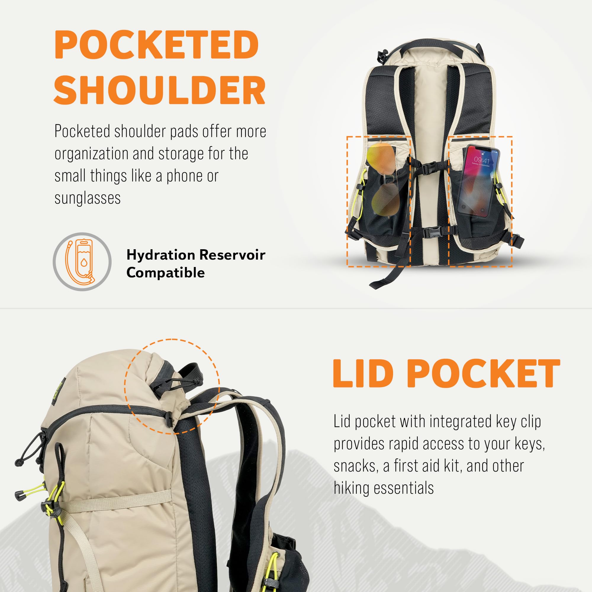 SPACIOUS FUNCTIONALITY - 20 Liters of dedicated space for essential hiking or travel gear plus room for extra clothes, a water bottle, and small electronics; Zippered lid pocket and easy running zipper down the front of the back for swift access