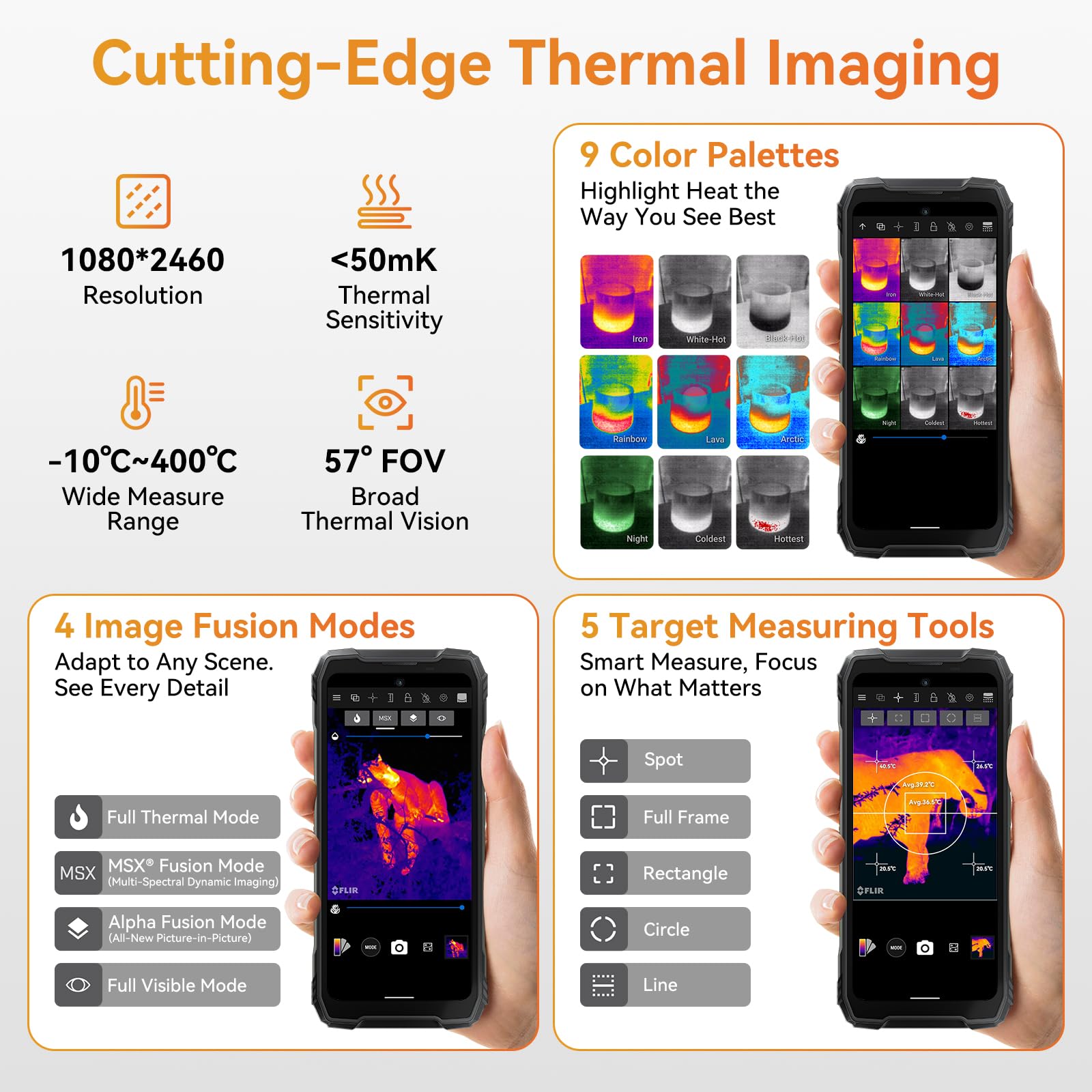 📸📸【FLIR Thermal Imaging Camera & Main 64MP Anti-shake Camera】Blackview XPLROE 1 Pro unlocked phones features advanced photo algorithms and a 64MP true color front camera with support for beauty mode, allowing you to take more natural looking photos. The XPLROE 1 Pro also have a professional-grade 64-megapixel anti-shake rear camera and a 13-megapixel 120° Ultra Wide Angle and Ultra Macro camera. Support OIS anti-shake, you no longer need to worry about blurred photos. Enjoy up to 4K video recording to capture life's moments in high definition. The XPLORE 1 Pro also features an underwater mode, a night mode that allows you to take photos and videos while exploring underwater and at night