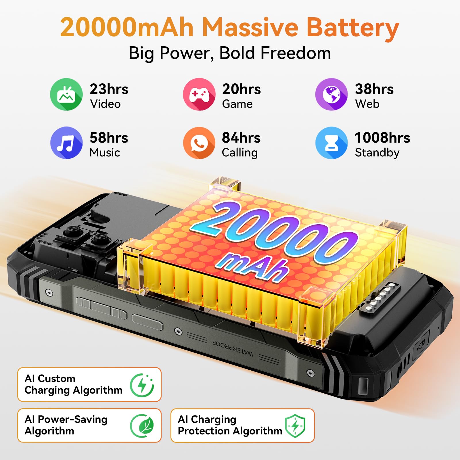 🔋🔋【20000mAh Battery + 55W Fast Charging】The blackview XPLORE 1 pro rugged cell phone is equipped with a large capacity battery of 20000mAh. The standby time is 1008 hours, 84 hours talk, 23 hours video, 20 hours game. The battery life is long-lasting. Equipped with 55W fast charging function, it provides long-term power guarantee for outdoor workers and adventure enthusiasts. You can also use the OTG function to charge other devices such as GPS devices, flashlights, field lights, and other mobile phones.