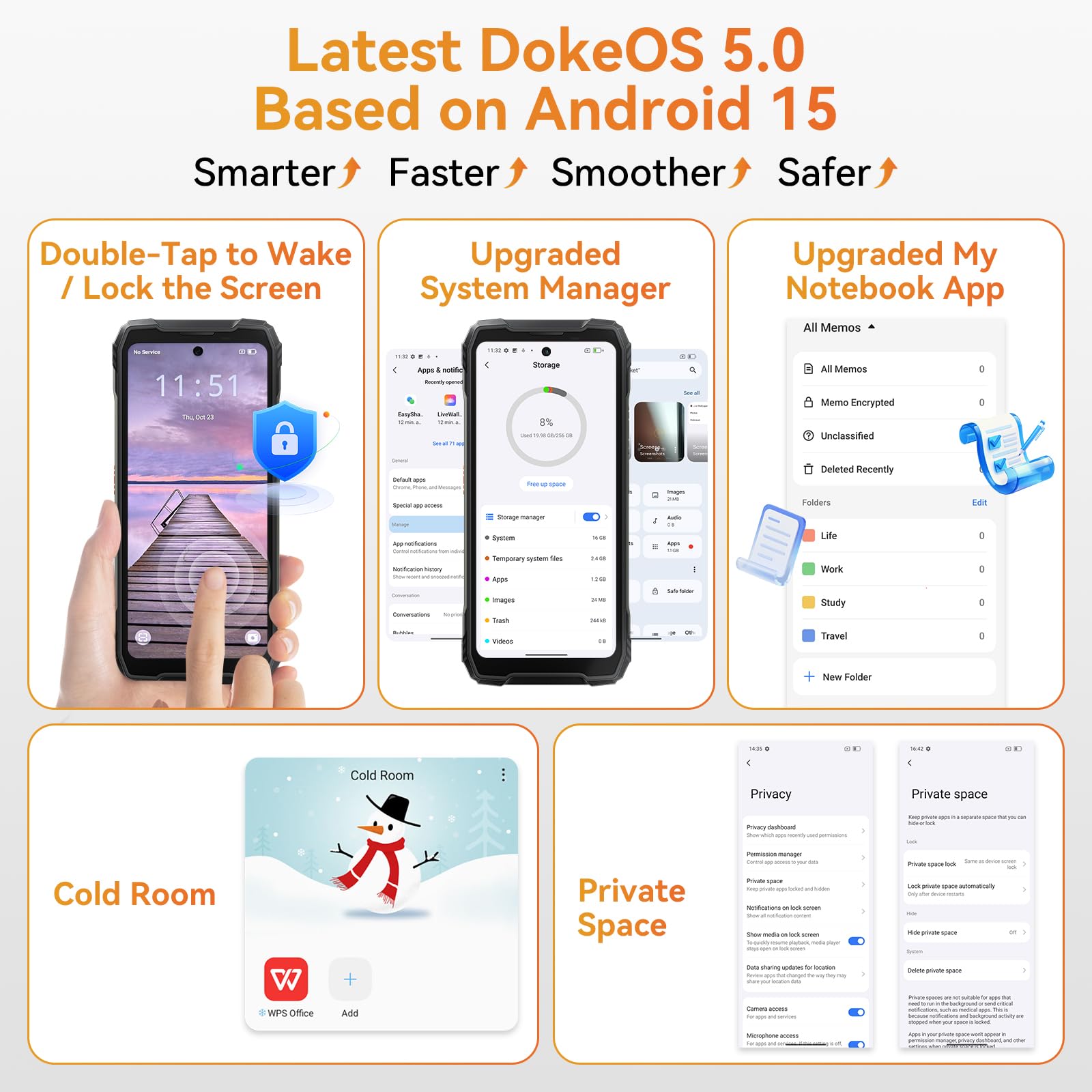 📱📱【Android 15 phone & Doke OS 5.0 System】This XPLORE 1 Pro rugged android phone equipped with the latest Android 15 operating system, enhancing privacy protection and prevented privacy leakage from the root cause.This Android 15 smartphone offers per-app language preferences, improved UI experience, outdoor tools. Add Workspace App, distinctly separate workand personal. But that's not all! With the integration of Doke OS 5.0, enjoy additional functionalities like call recording and exercise index tracking. Additionally, Provide real-time subtitles while watching videos, and a richer functional experience.