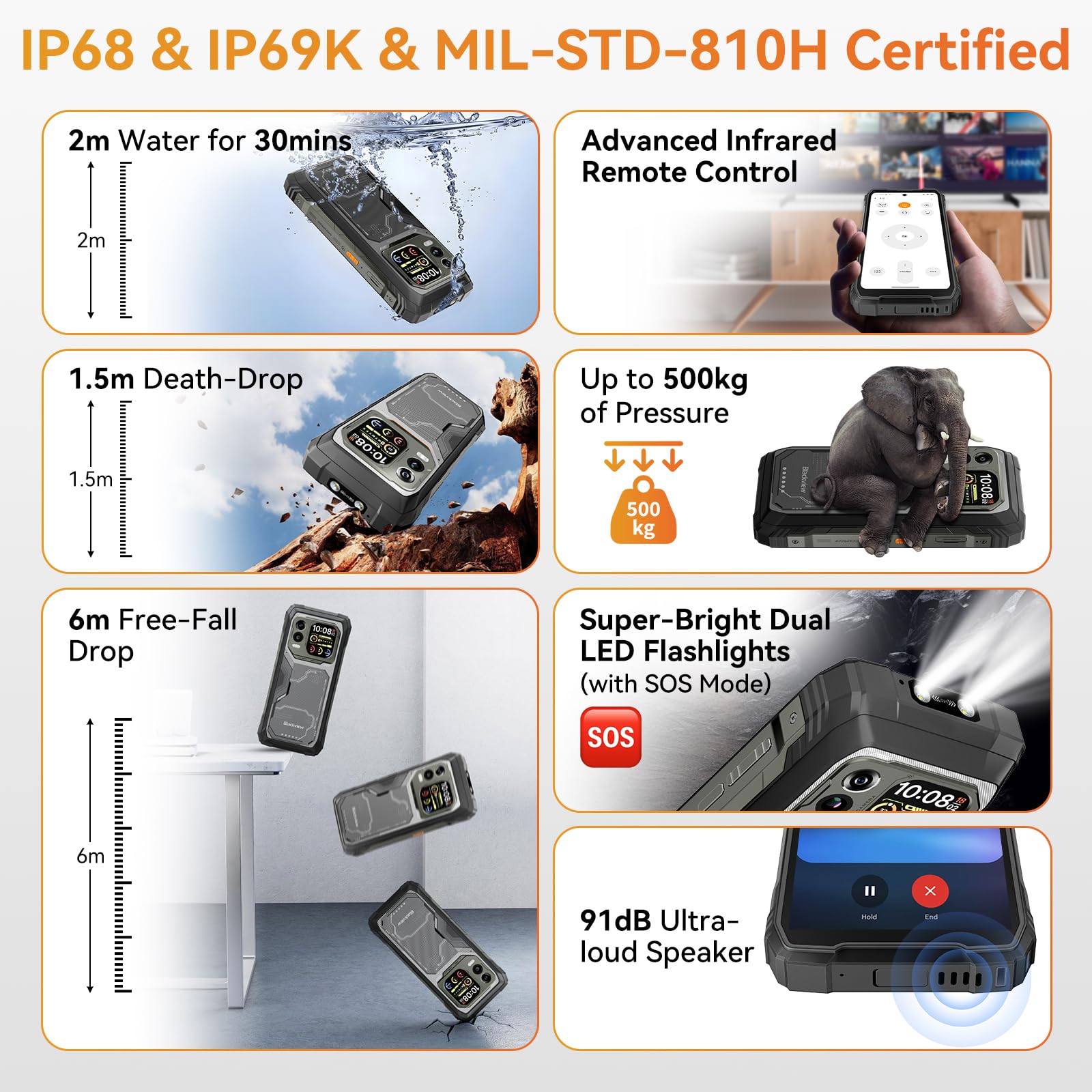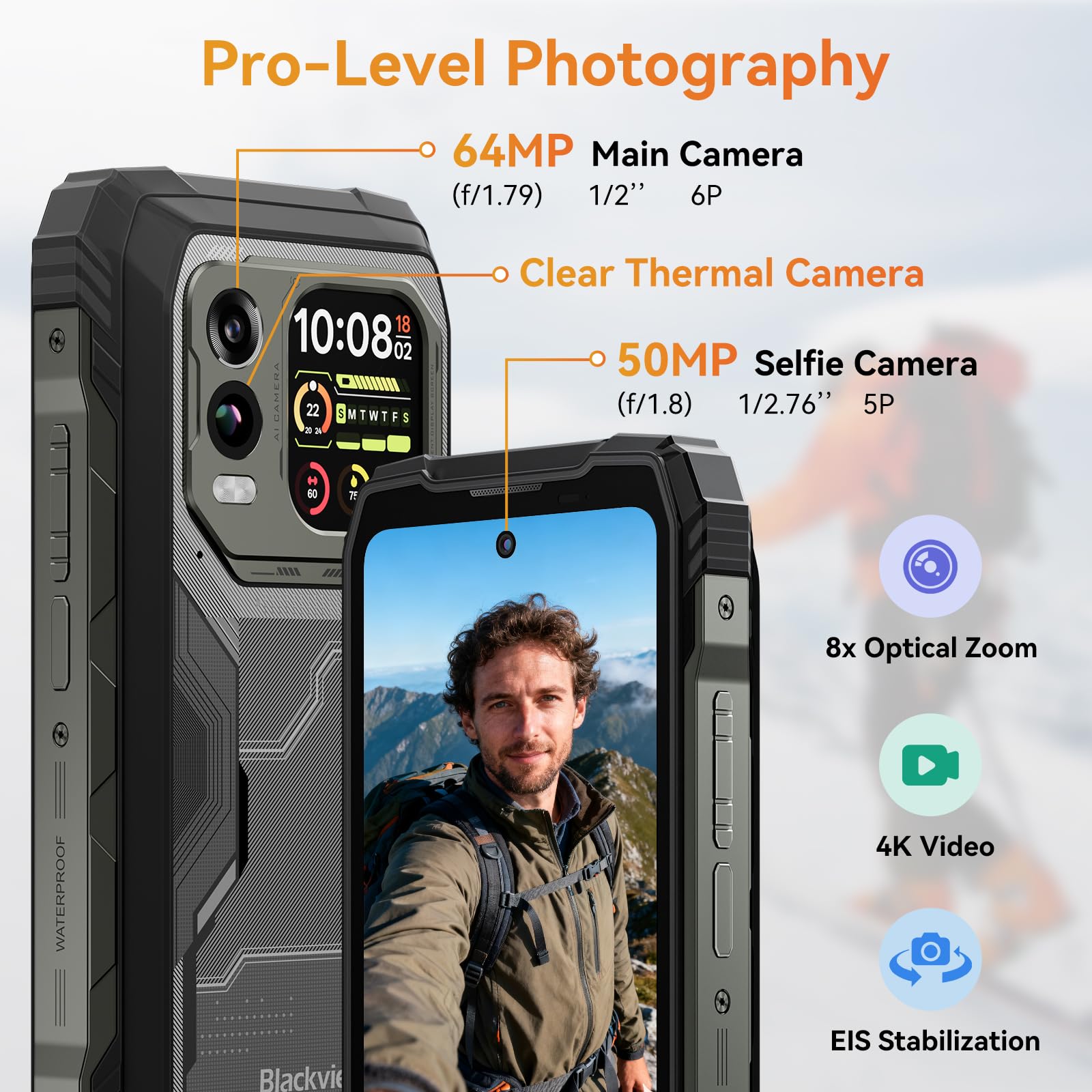 💧💧【IP68/IP69K Waterproof & 64MP+50MP 】The Blackview XPLORE 1 Pro Rugged Mobile Phone is IP68 / IP69K / MIL-STD-810H certified, which is waterproof, dustproof and drop-resistant, making it ideal for your outdoor activities.In adition which equipped with a 64MP rear camera for taking ultra-high resolution photos. The 50MP front camera delivers sharp selfies and video calls with natural AI beautification. The wide-angle lens is ideal for group shots, while thermal imaging and visible light capture ensure comprehensive recording.