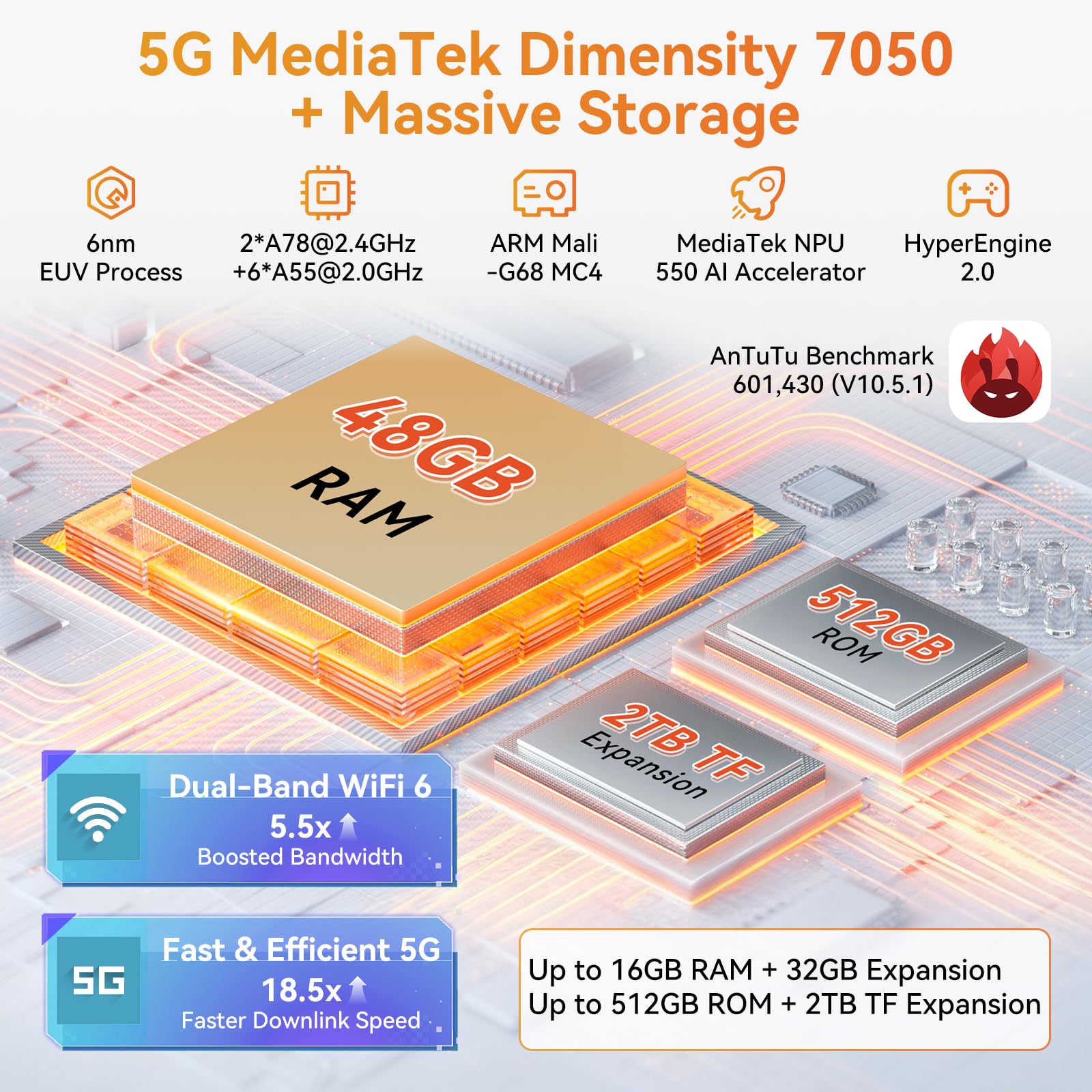 🌍🌍【5G Powerful Octa-Core Processor, 48GB+512GB, Dual-Band WiFi 6】 Blackview XPLROE 1Pro 5G Rugged Smartphone is powered by TSMC Octa-Core MediaTek Dimensity 7050 5G Processor, 2.6GHz and leading 6nm process to ensure smooth operation of daily applications and demanding games.Dual-band WiFi6 ensures seamless connectivity across 2.4GHz and 5GHz frequencies, delivering stronger, faster connections for quick downloads, superior gaming, fluid streaming, and flawless video conferencing. 48GB RAM (16GB+32GB virtual RAM) and 512GB ROM with simultaneous support for up to 49 background apps provide plenty of storage for all your apps, photos, videos, and files.