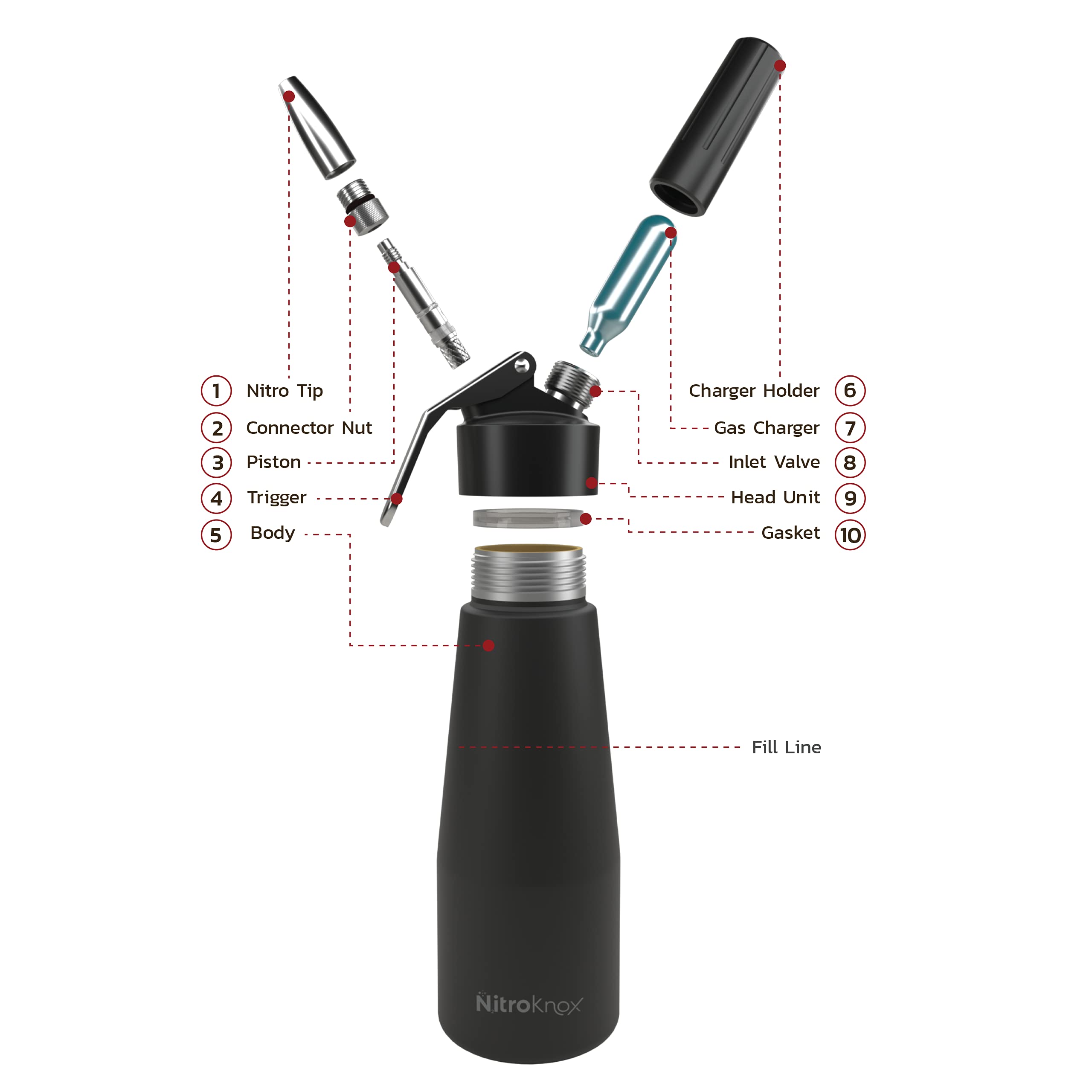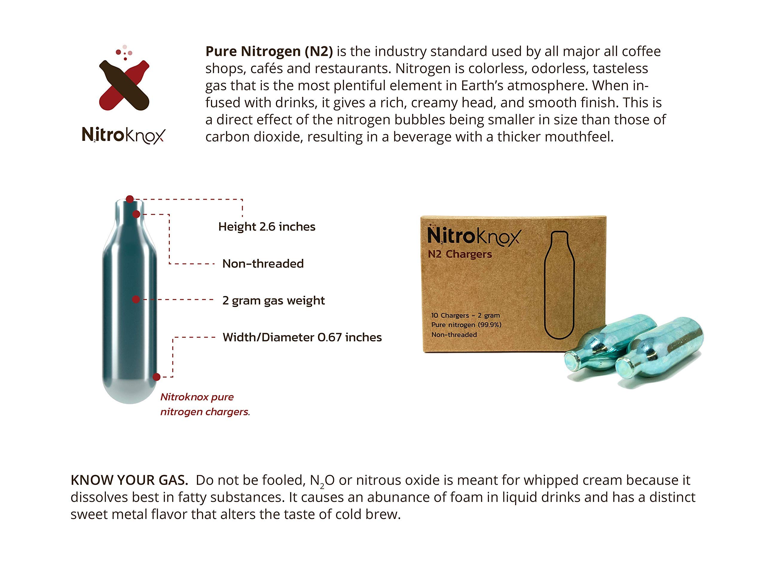 INCLUDES 10 PACK OF NITRO (N2) CHARGERS: Pure Nitrogen (n2) is colorless, odorless, tasteless gas that is the most plentiful element in Earth’s atmosphere. When infused with drinks, it gives a rich, creamy head, and smooth finish. This is a direct effect of the nitrogen bubbles being smaller in size than those of carbon dioxide, resulting in a beverage with a thicker mouthfeel and a richer, fuller texture with a cascading crema effect.